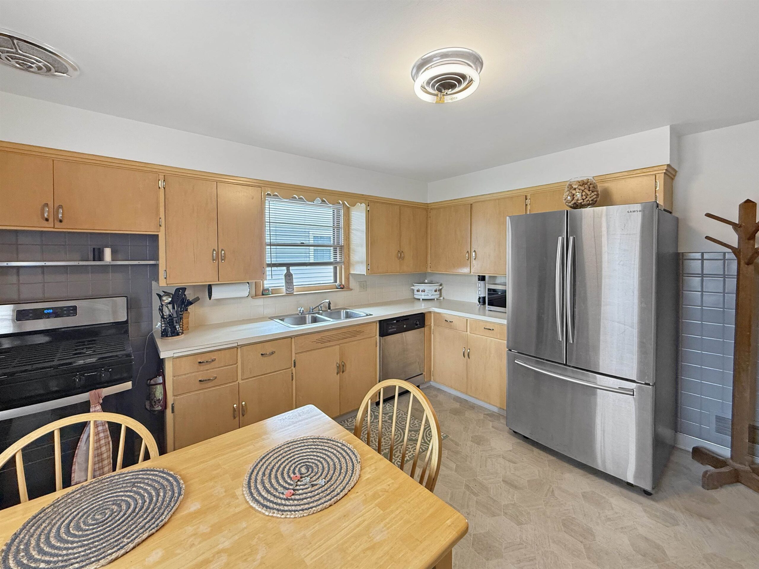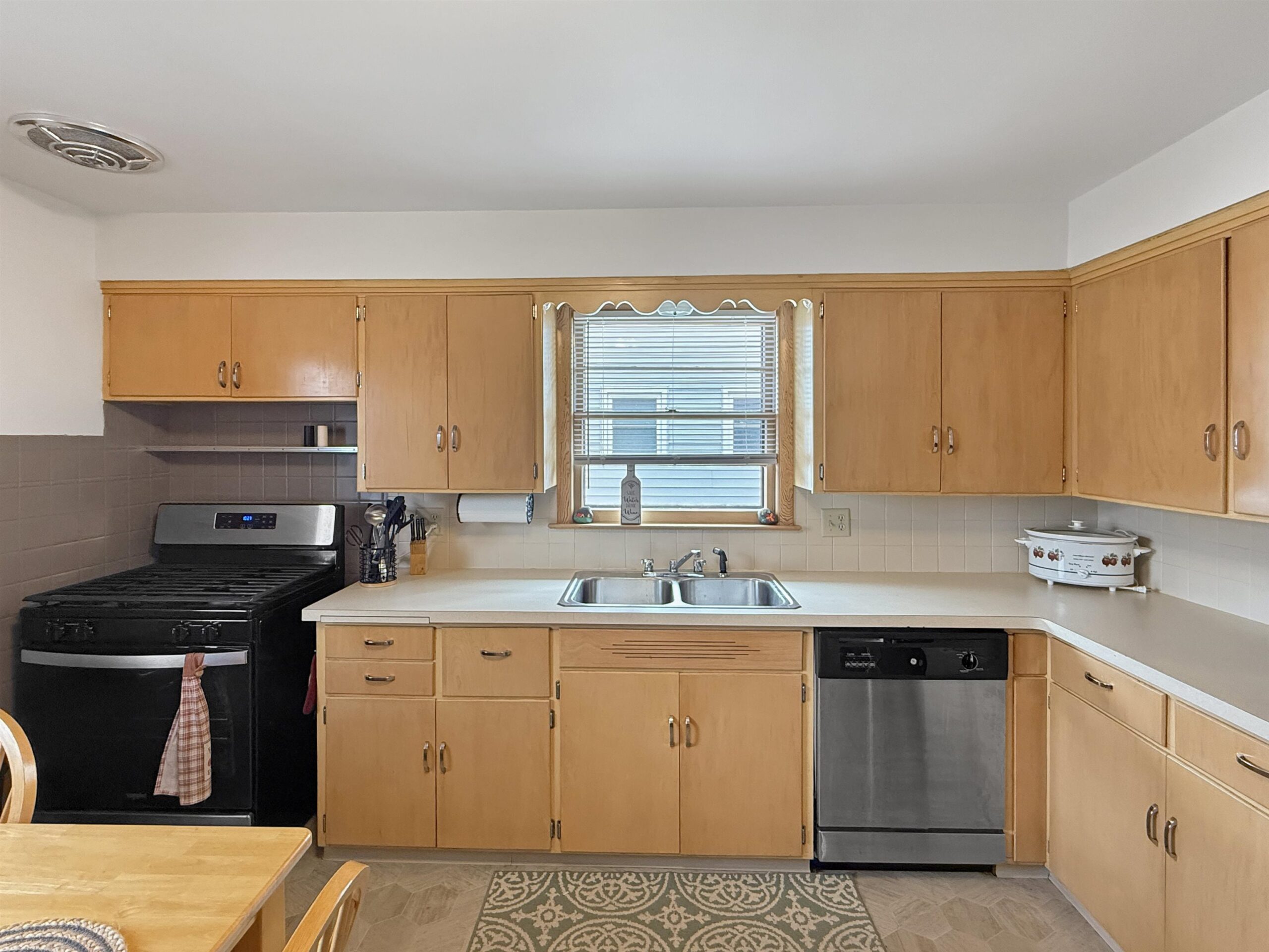 stove, refrigerator, dishwasher, window treatments