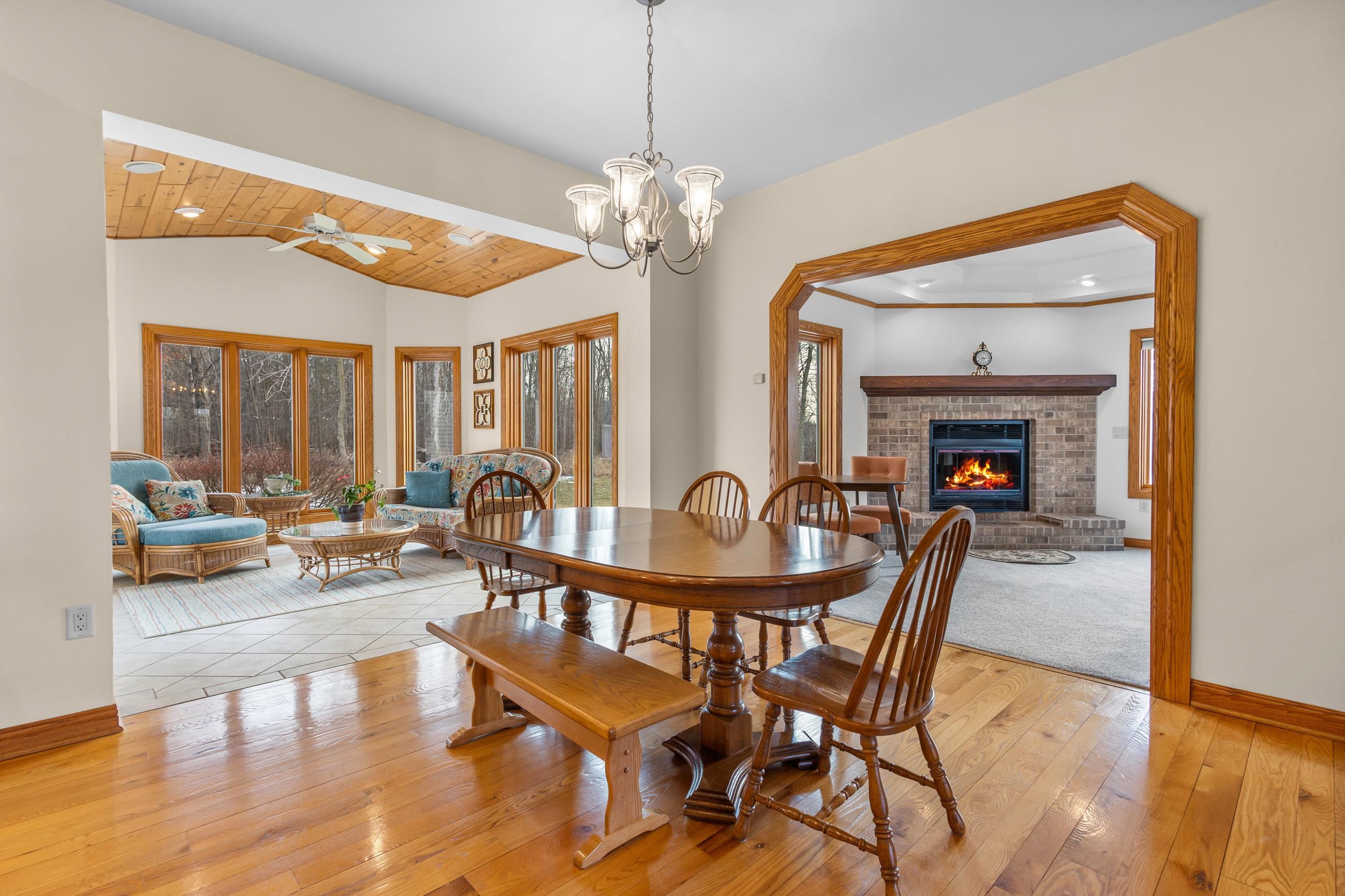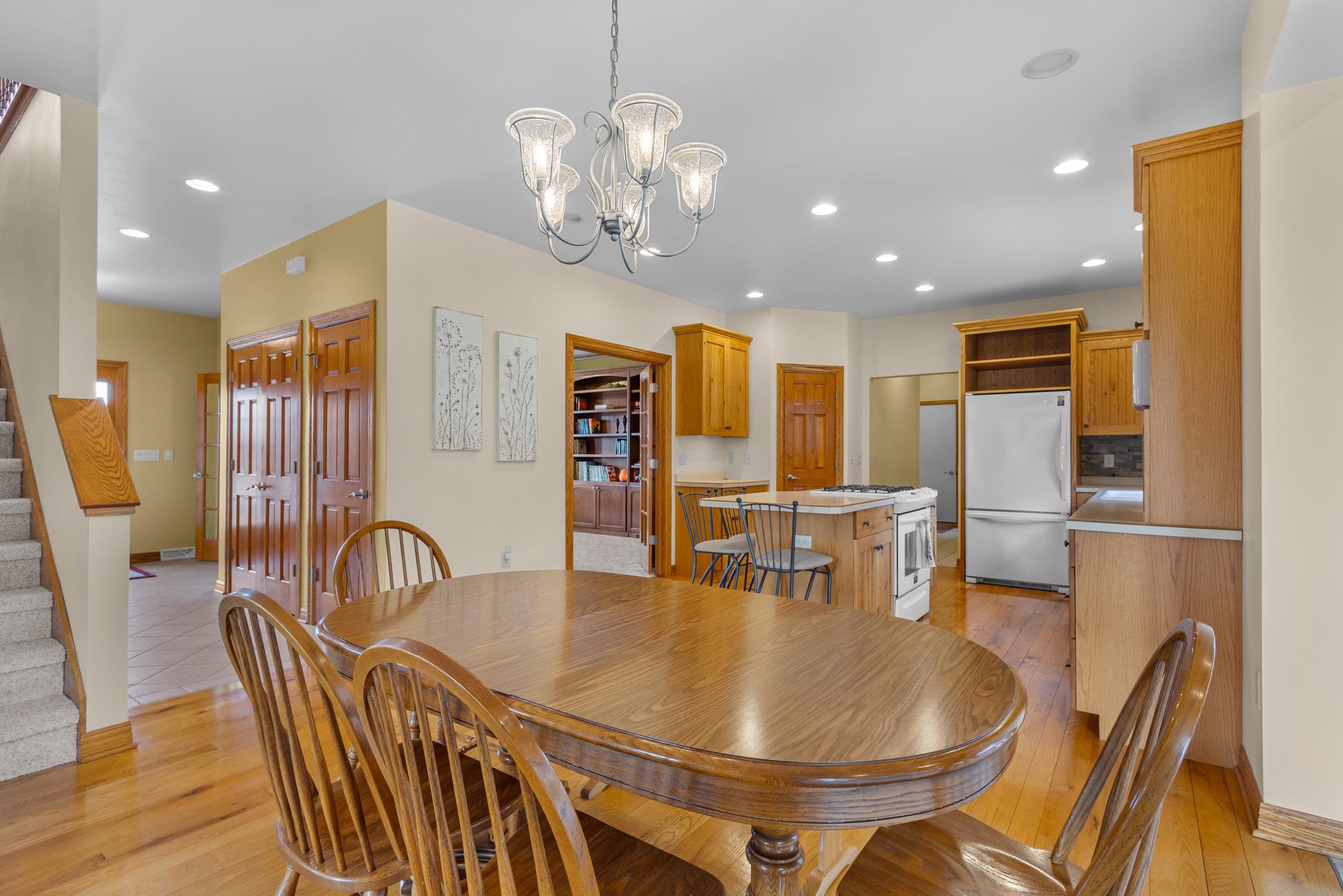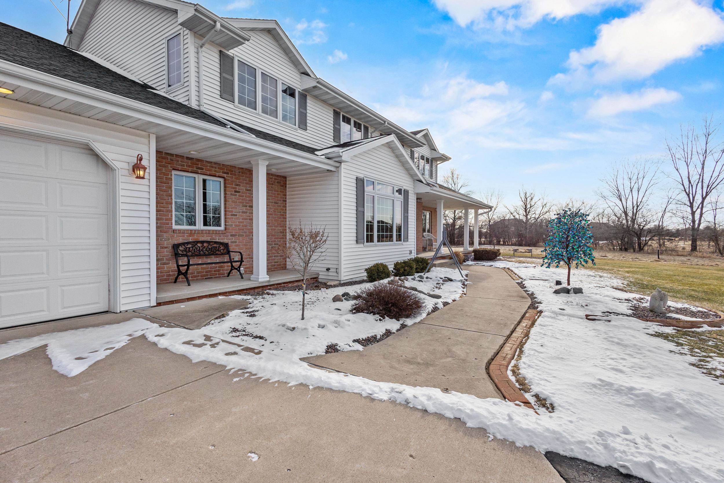 Custom quality built on approx. 5.4 private acres w/wooded backdrop in desirable Moon River Estates. Foyer leads to open concept kitchen dining flowing seamlessly into sundrenched sunroom wall of windows overlooking peaceful yard. Designed for both comfort & function, mud room off the impressive 1,502sq.ft.heated attached garage, 1st fl. laundry w/closets. Living room filled w/natural light & wood masonry FP, while a large main floor library provides perfect work from home or reading retreat. Primary suite w/ lg w/in closet, bath w/dble sinks, soaking tub & shower. Finished lower adds even more living space, full bathroom, lots of storage & stairs to garage. 2nd 2.5 stall garage, private acreage, thoughtful design & exceptional space make this home a rare find. 48 hr binding acceptance.