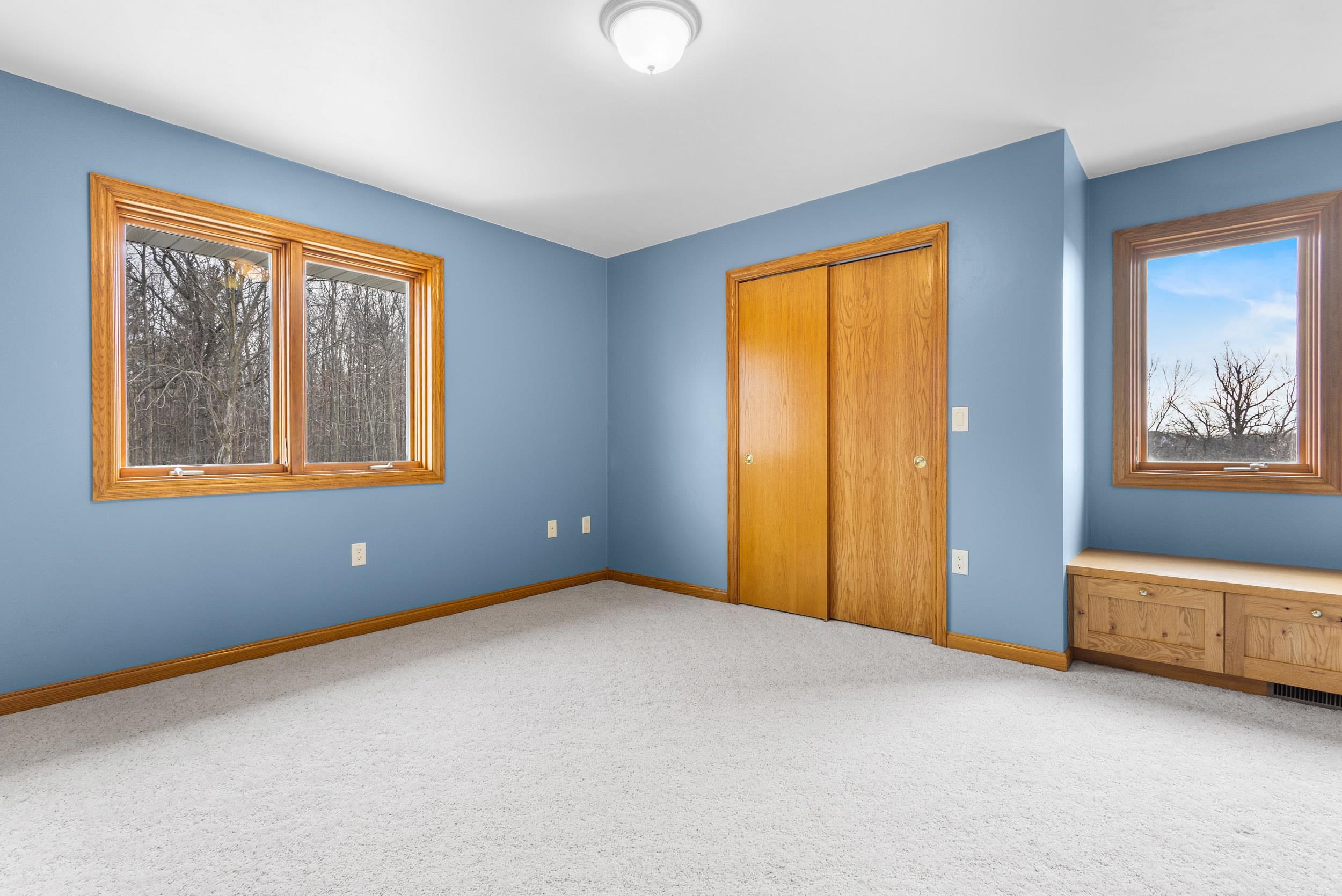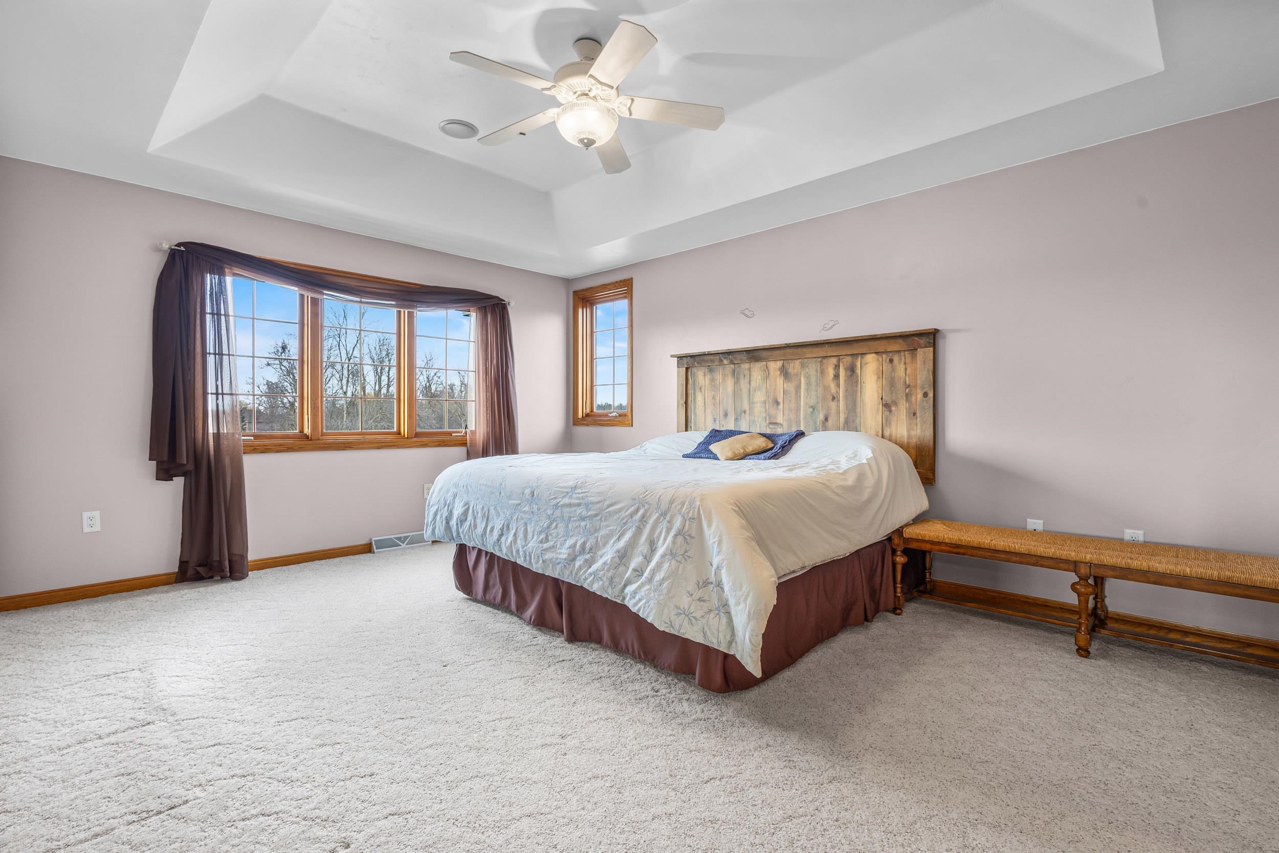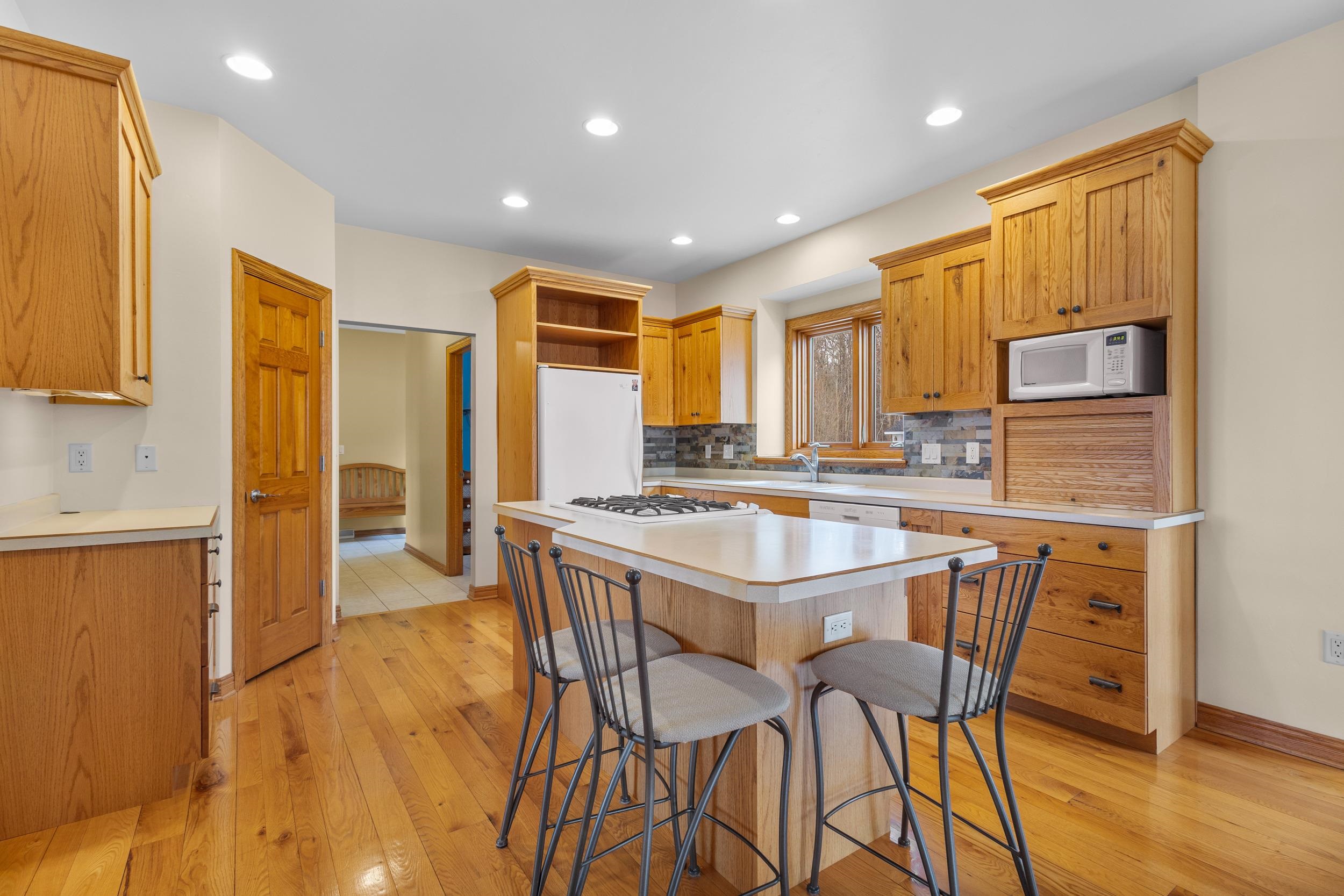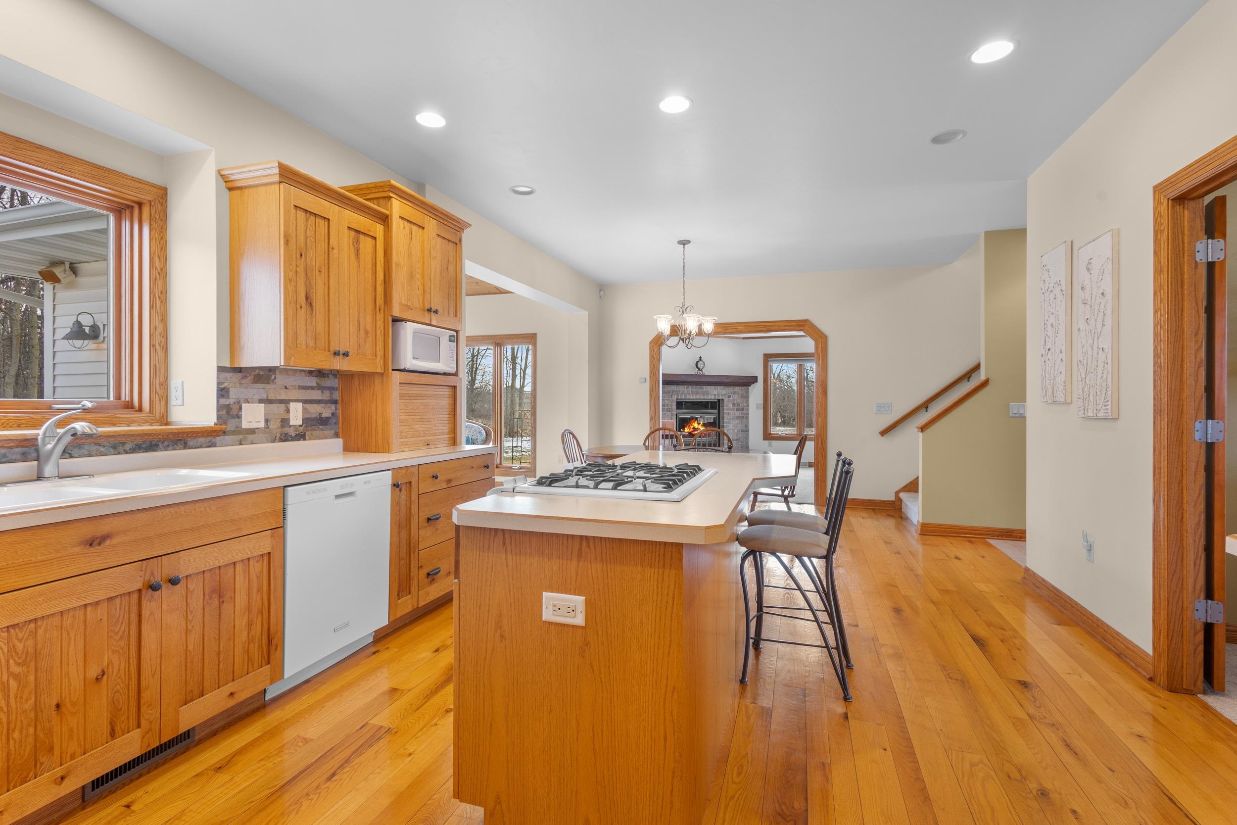 Custom quality built on approx. 5.4 private acres w/wooded backdrop in desirable Moon River Estates. Foyer leads to open concept kitchen dining flowing seamlessly into sundrenched sunroom wall of windows overlooking peaceful yard. Designed for both comfort & function, mud room off the impressive 1,502sq.ft.heated attached garage, 1st fl. laundry w/closets. Living room filled w/natural light & wood masonry FP, while a large main floor library provides perfect work from home or reading retreat. Primary suite w/ lg w/in closet, bath w/dble sinks, soaking tub & shower. Finished lower adds even more living space, full bathroom, lots of storage & stairs to garage. 2nd 2.5 stall garage, private acreage, thoughtful design & exceptional space make this home a rare find. 48 hr binding acceptance.
