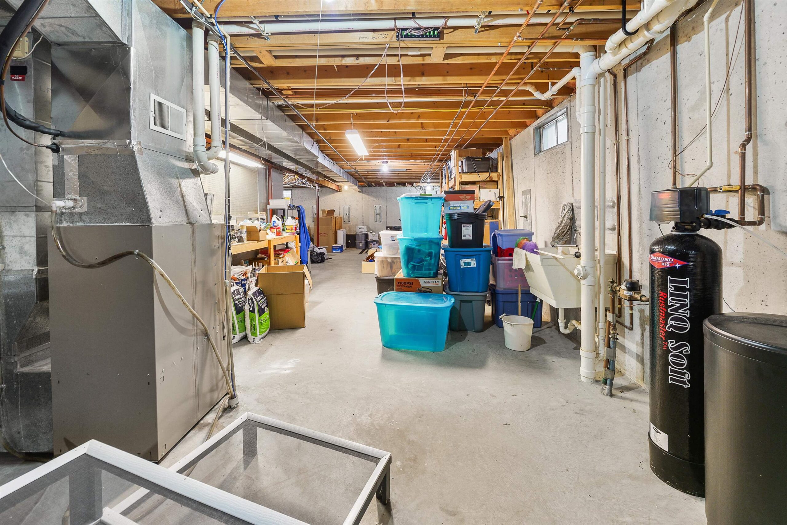 Stove, washer, dryer, water softener, corner cabinet in great room, black cabinet in living room, refrig, white mirror