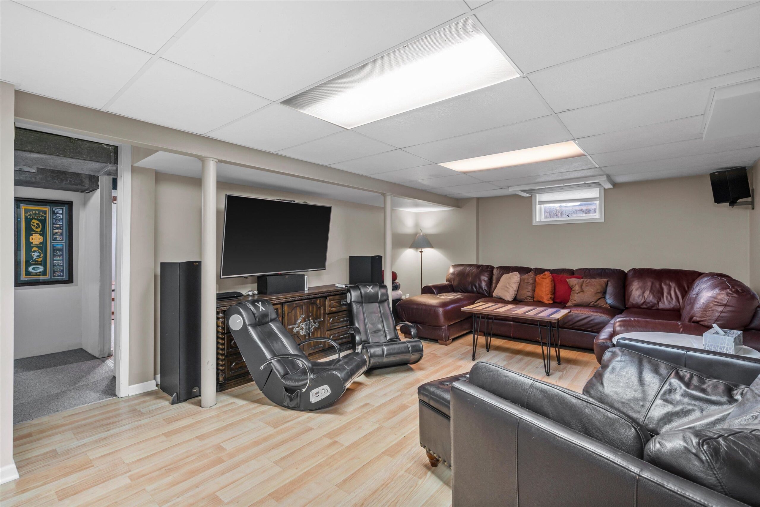 Minutes from Resch Aquatic Center and Lambeau Field, this spacious 3,000+ sq ft Green Bay home blends comfort and efficiency. Offering 5 bedrooms and 2 full baths, there is room for everyone. The beautifully finished lower level features a media center, wet bar, and rec space, perfect for entertaining. Enjoy a cozy gas fireplace on the main level and unwind year-round on the sun porch with a well-maintained 4-person hot tub. Solar energy and on-demand hot water add modern efficiency and savings. Complete with a fully equipped kitchen, large fenced yard with deck and grill, extra-long garage, and generous parking. Schedule your showing today!