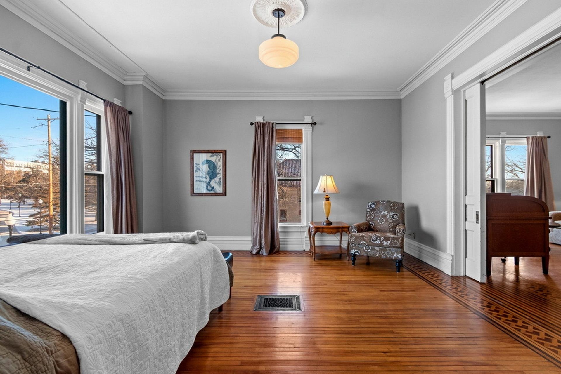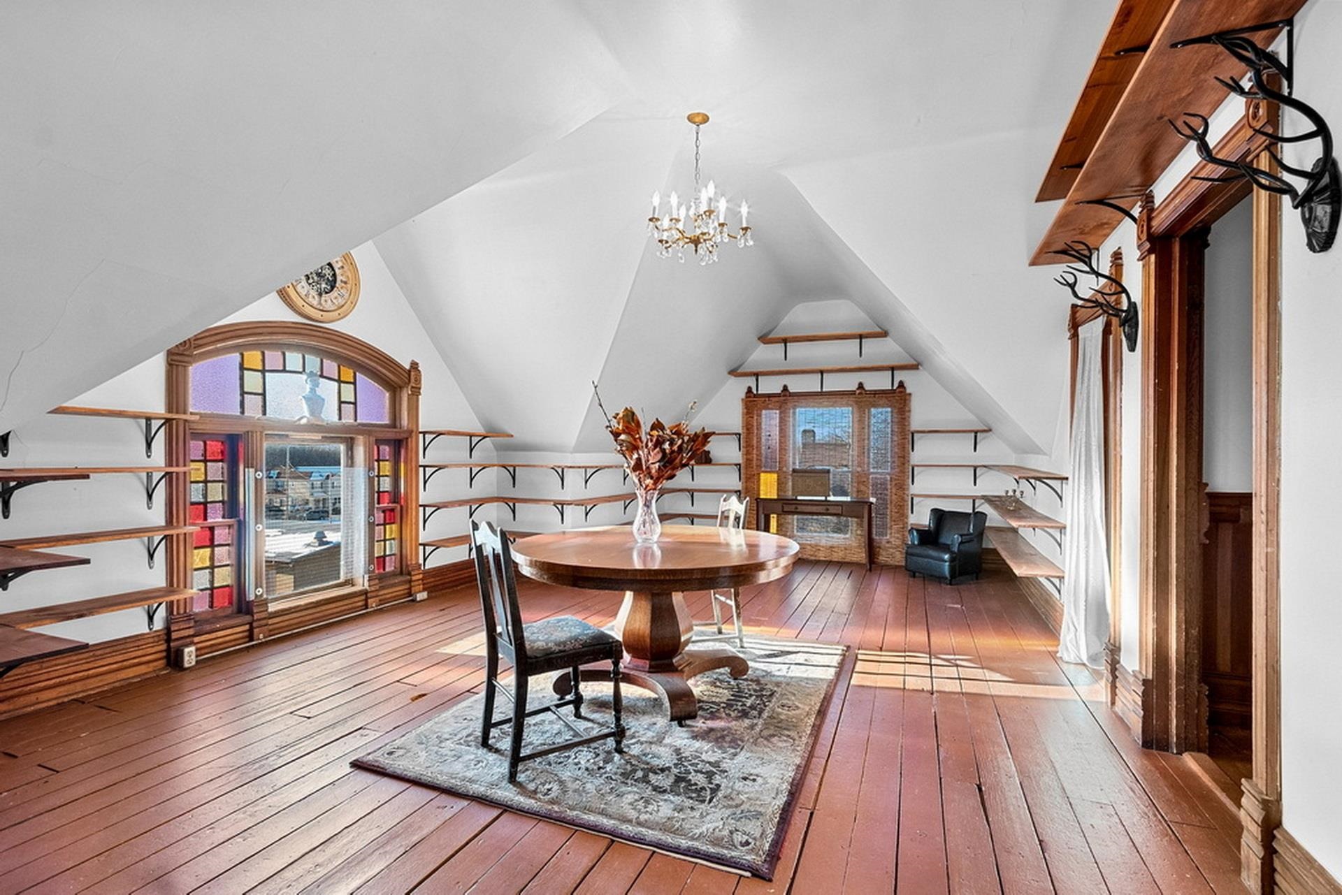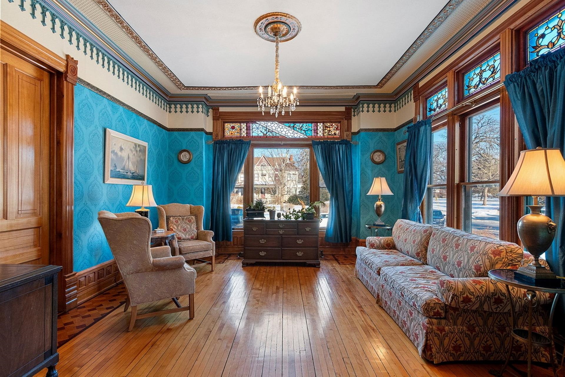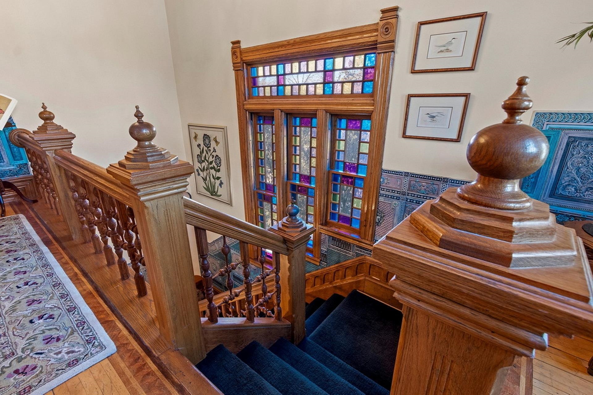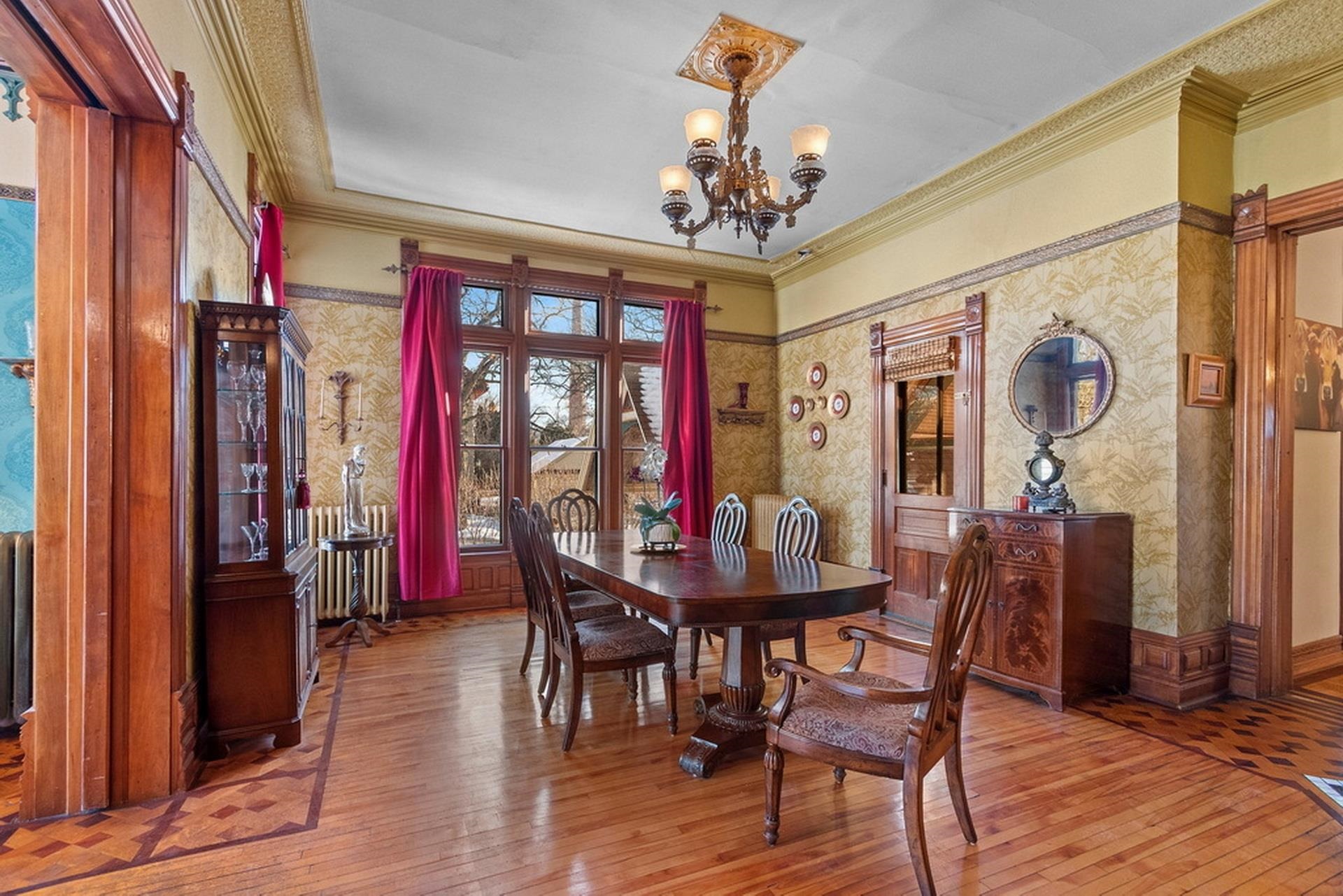 This ornate Queen Anne-style 3-story home is truly unbelievable! Built by a true lumbar baron. Many types of wood throughout include flooring, spindles & layers of crown molding. Extravagant in style, this home offers 4-5 bdrms and 3.5 baths. 1st floor family rm/in-law suite w/own entry, newer tiled walk-in shower. 3rd floor wood-burning pellet stove adds not only warmth but ambiance. Updates on every level and stained glass throughout. Fenced in yd, garden and garden shed for additional storage. Beautiful updates and stained glass on every level! Attached port cochere allows additional covered parking along with 2-car garage. Additional zoning allows for a Bed & Breakfast & many other uses. Call for your private showing today!