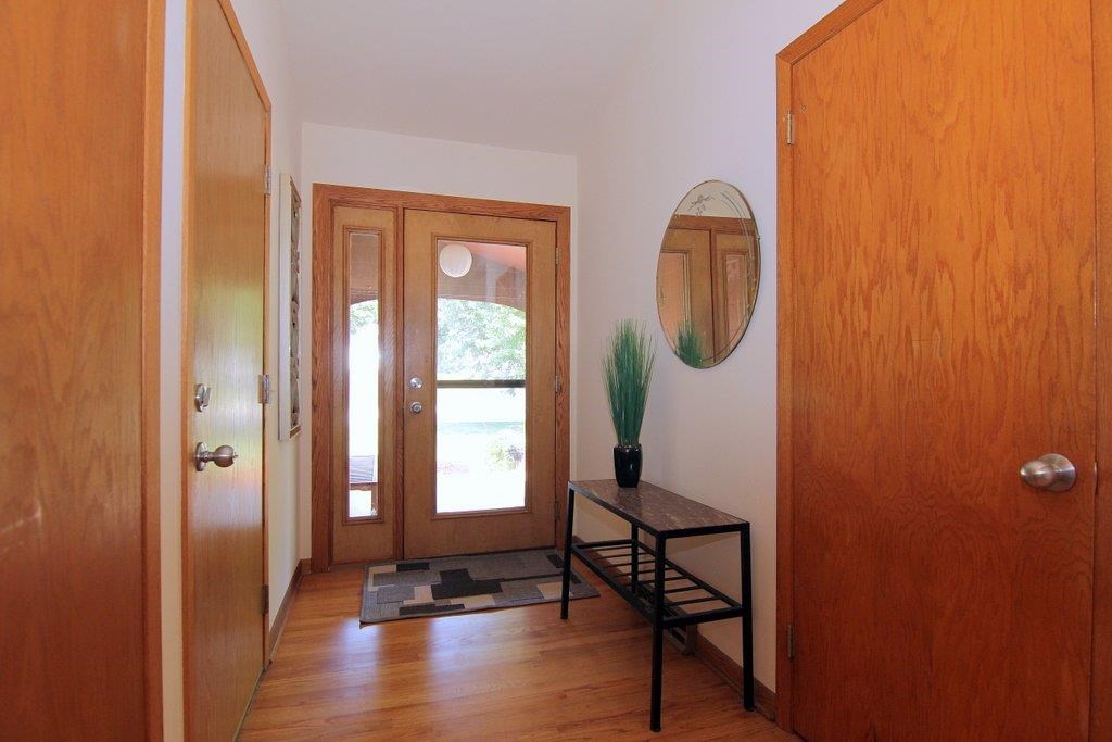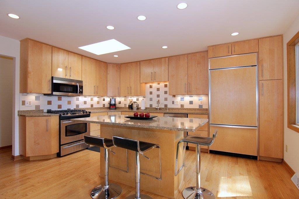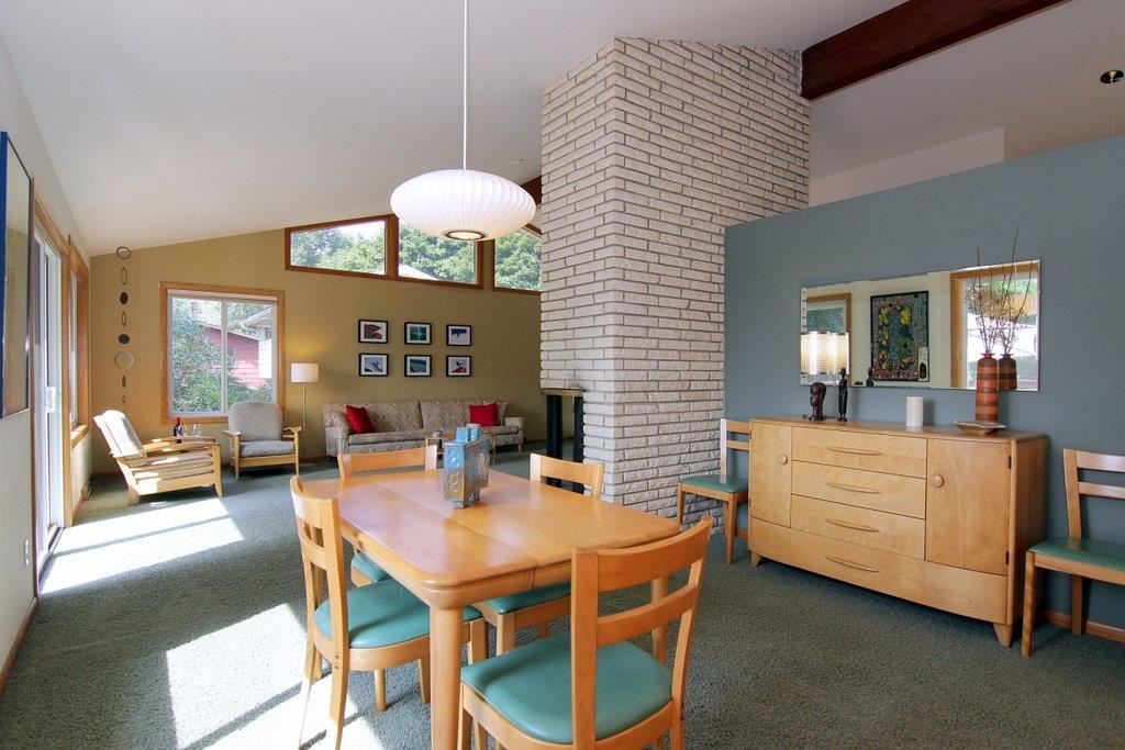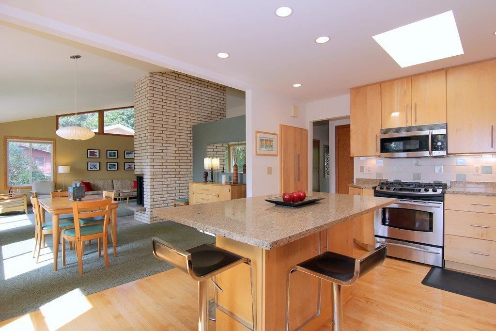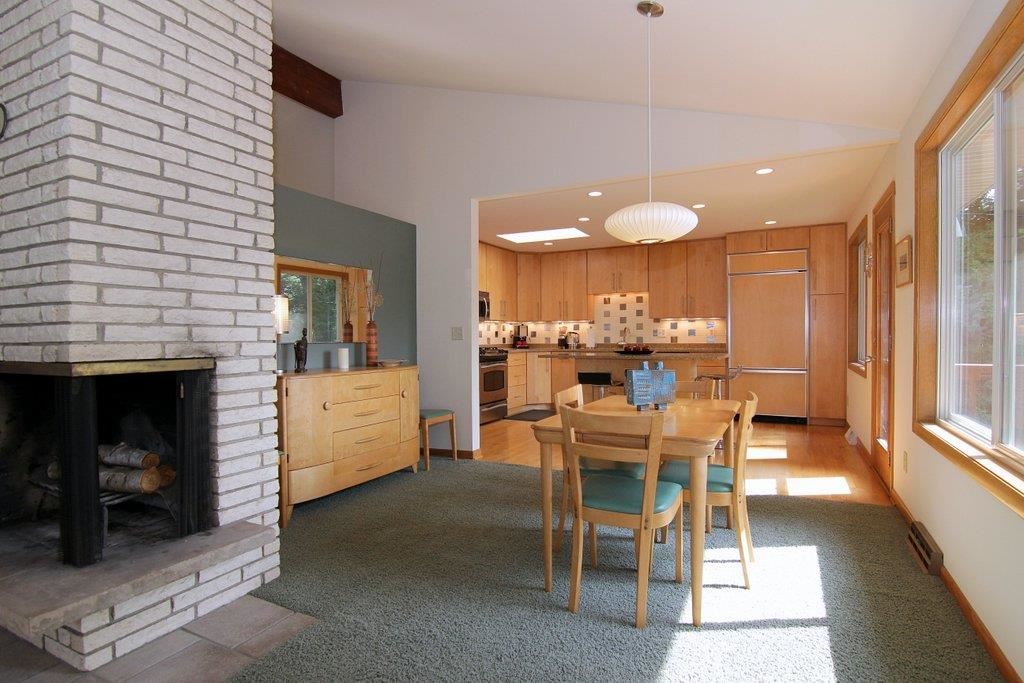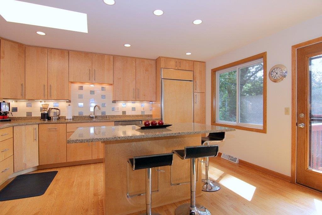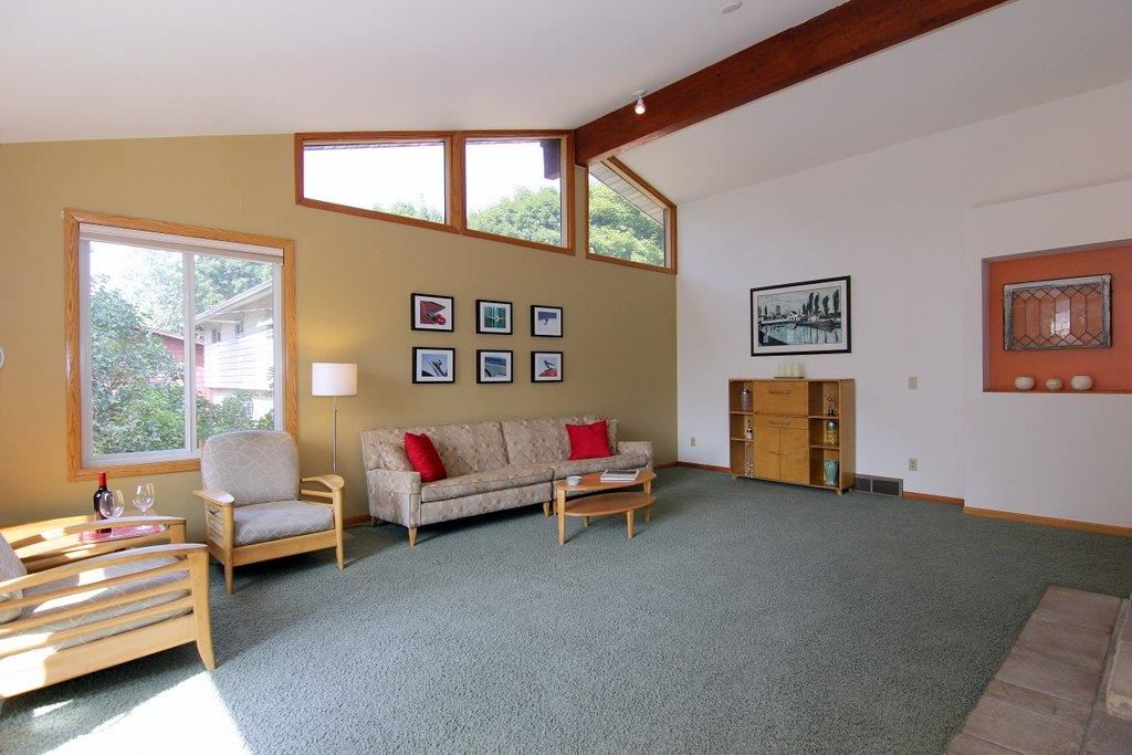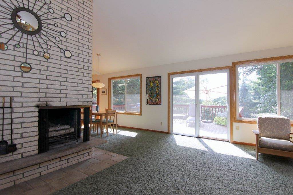 This mid-century modern gem features beautiful architectural detail & is within a few blocks of lake, park & bike path! The gorgeous, updated kitchen with top of the line appliances, quartz counters & maple cabinetry is open to the spacious dining/living area. Main space is framed with a wall of windows providing an abundance of natural light. Home boasts vaulted ceiling with exposed beam, skylights, 2 fireplaces, polished concrete floors, LL walkout, lovely tree-lined yard, numerous updates, & much more!