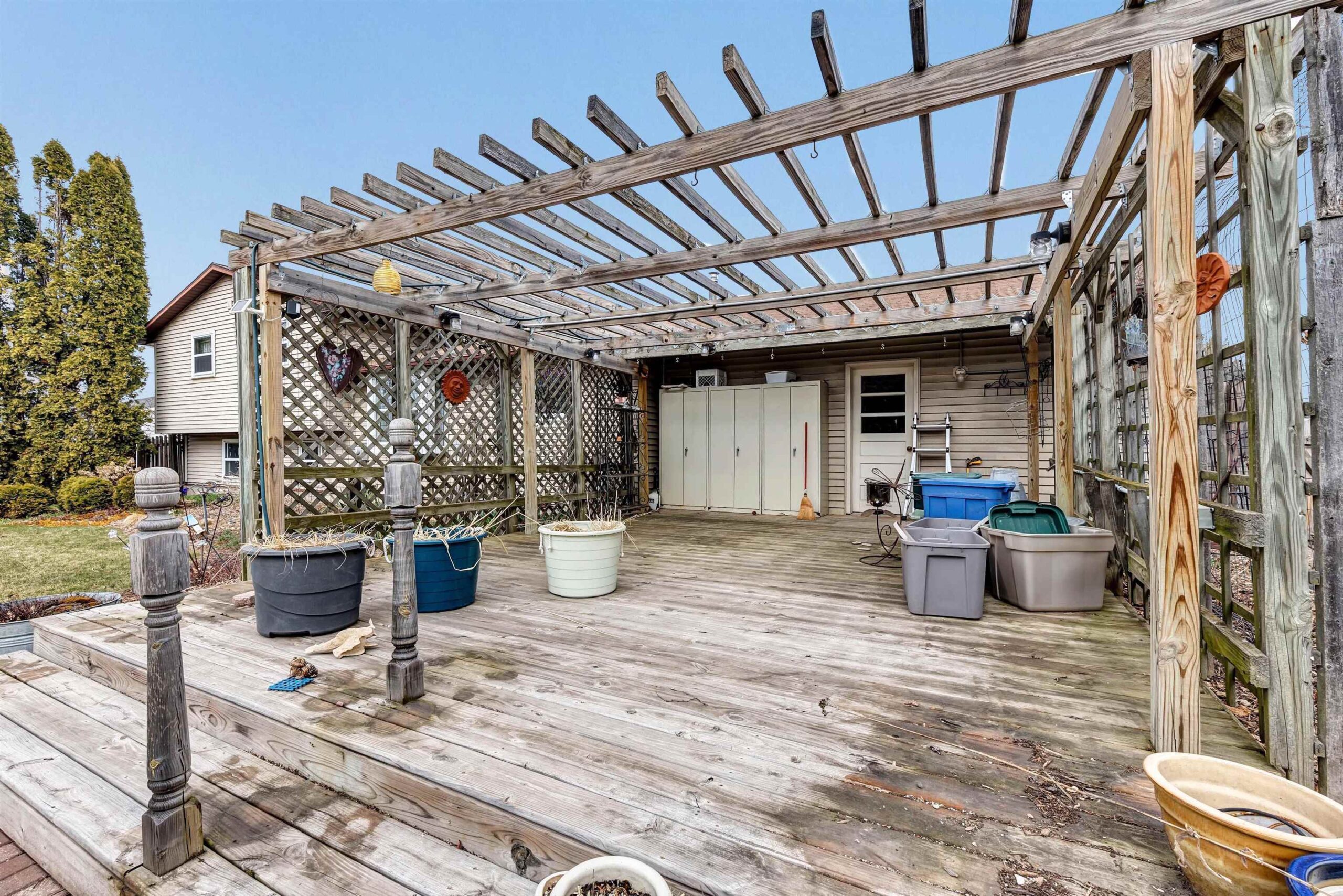 Cabinets on deck, stone bench in yard, some perennials & rosebushes.