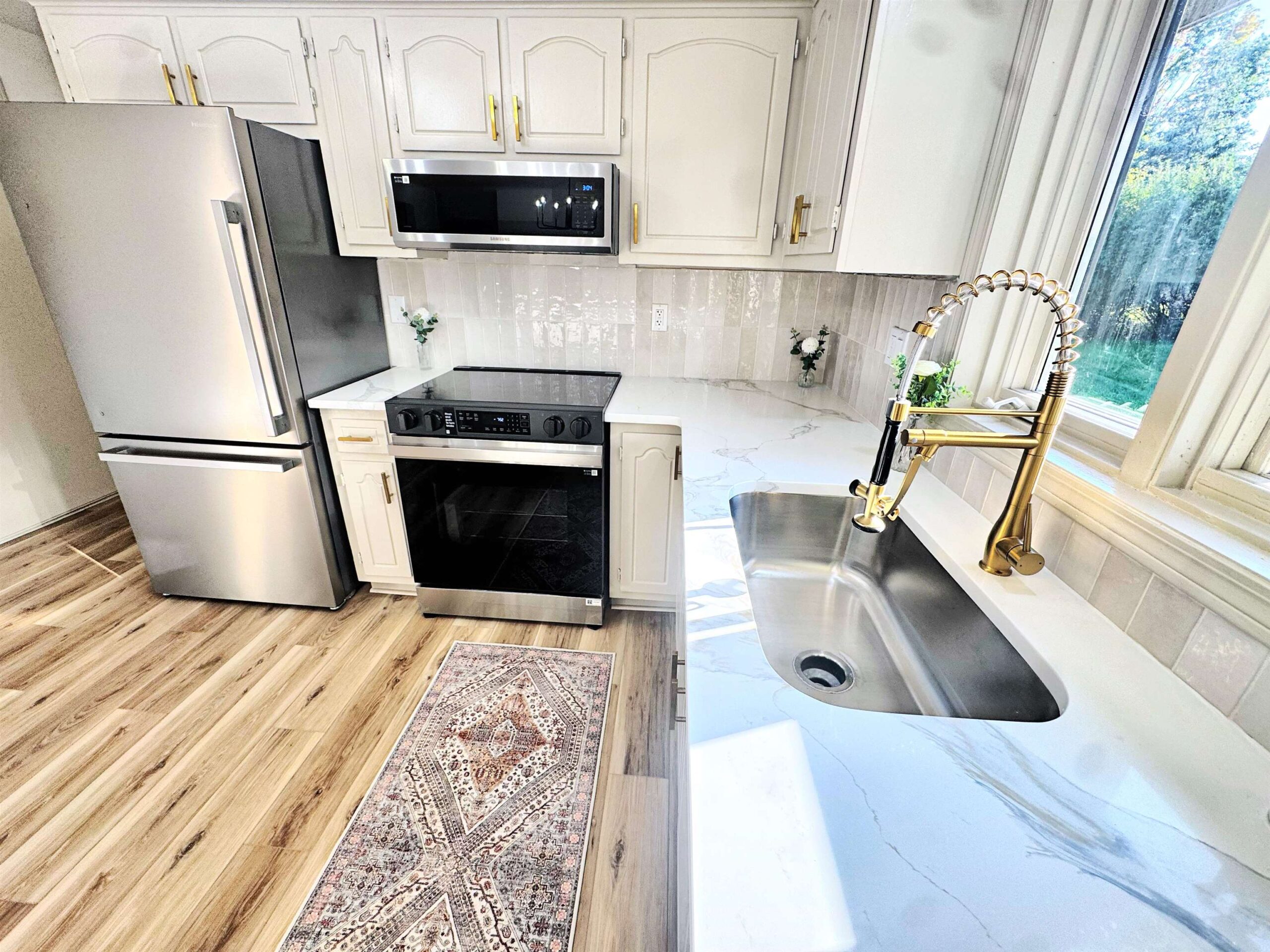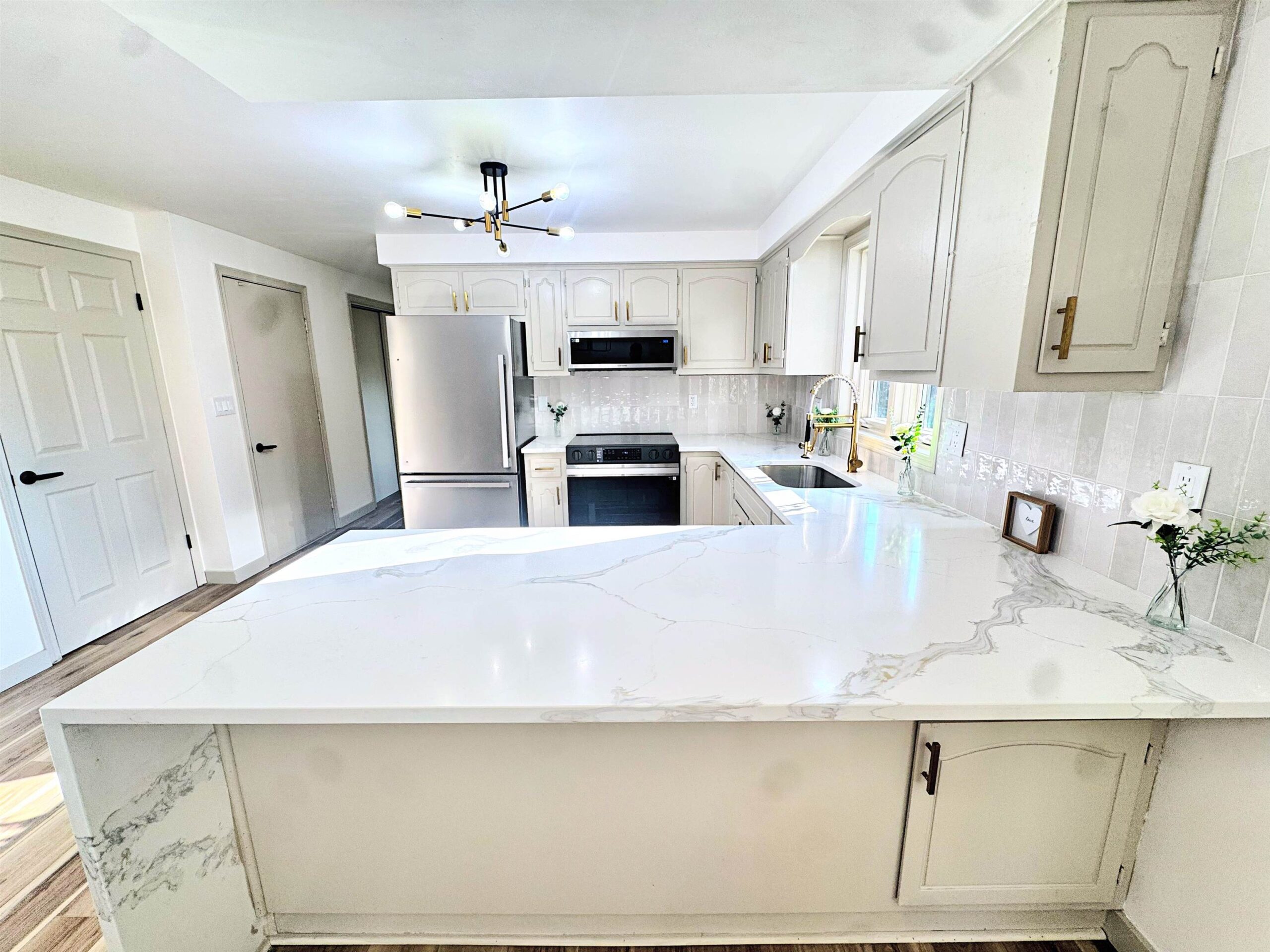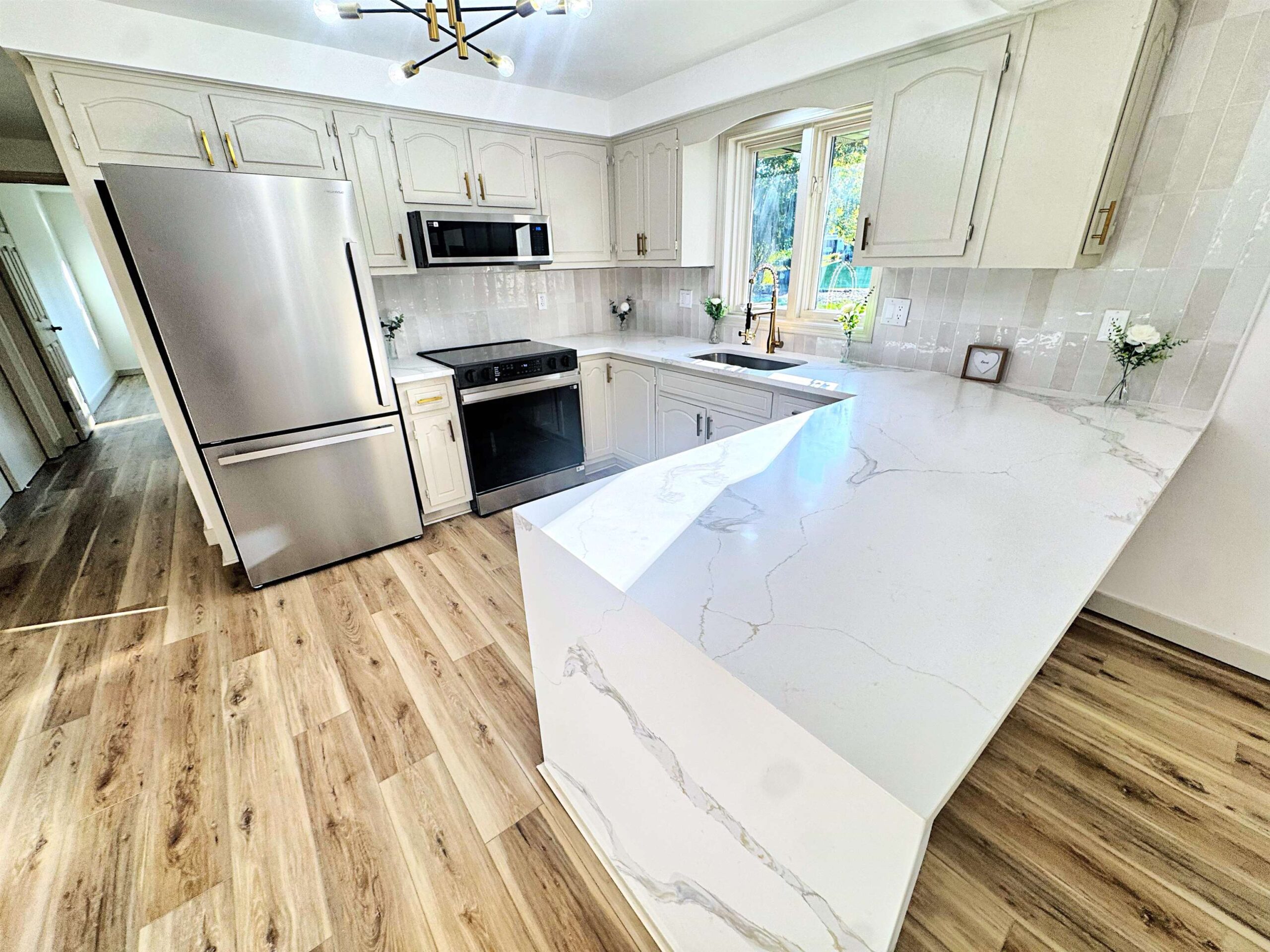 Completely updated sprawling 3 bedroom 2 full bath split level ranch with high end updates throughout. Kitchen features refinished cabinets, quartz countertops, eat in waterfall peninsula, tiled backsplash and stainless steel appliance package. Thermal energy efficient windows and commercial grade flooring throughout. 3 season fully enclosed sun room that over looks backyard. Newer furnace and tuned up central air conditioning. Main level laundry with lots of built in storage. Every detail has been updated. This is the one you have been waiting for to call home!