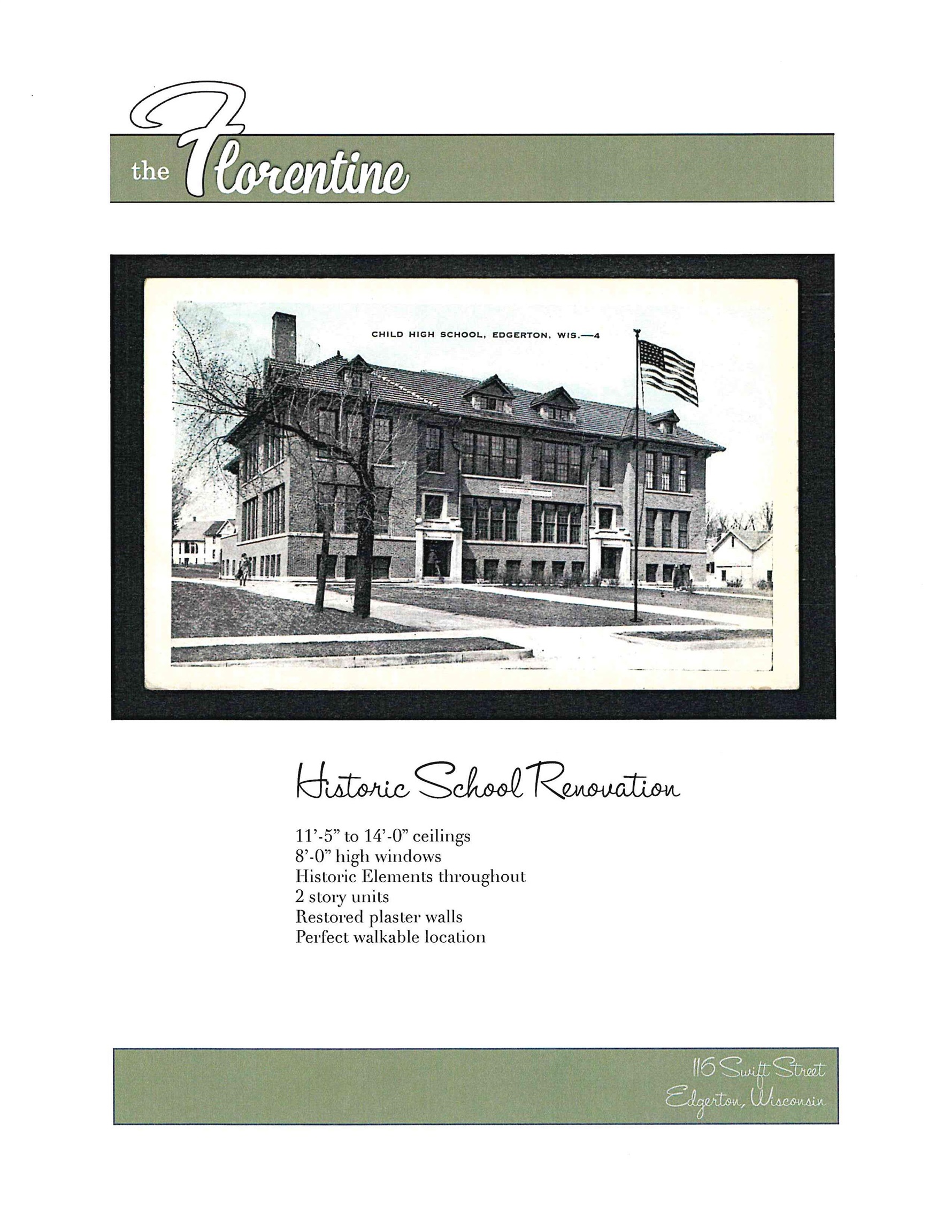 Welcome to the Florentine! Where historical appeal meets with a modern feel to enhance your lifestyle. The Child School, and Edgerton landmark building is located in the heart of Downtown Edgerton, a short walk to the community center as well as the pool. A blend of garden style and townhome, 2 story style units. Select from 3 different finish packages. You may choose from luxury vinyl plank flooring or upgrade to beautiful hardwoods. Fisher/Paykel or Bosch appliance packages. Ceiling height just over 11ft and massive windows to allow the natural light to flood your space. 2 assigned parking spaces as well as a storage unit for each unit. Ask Mark about the City of Edgerton's First Time Buyer Grant for The Florentine!