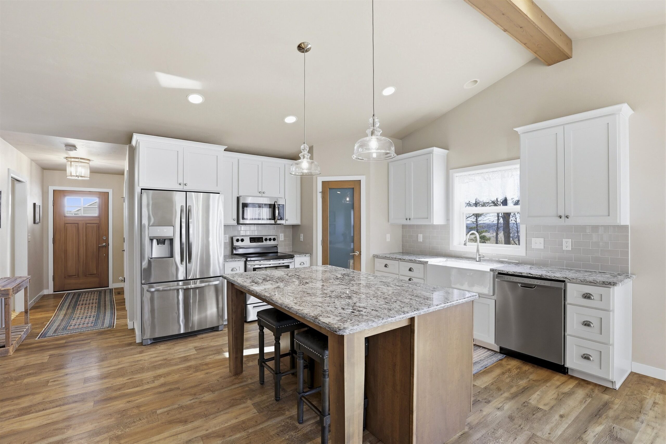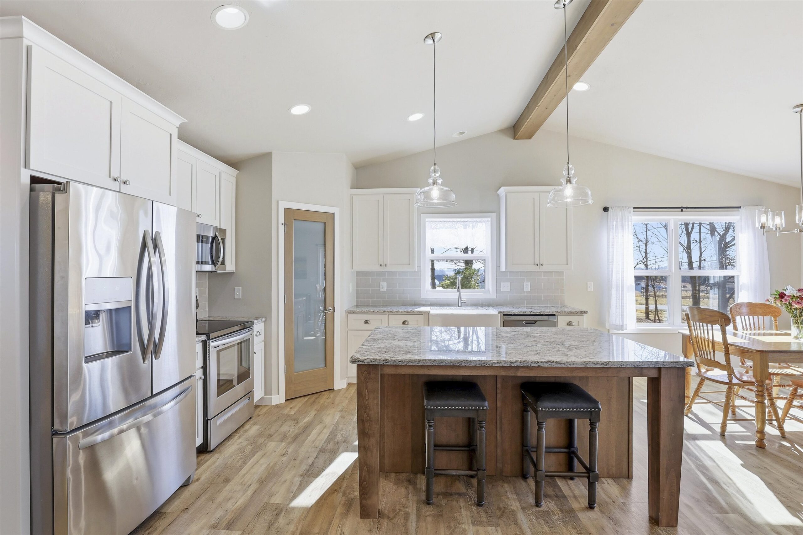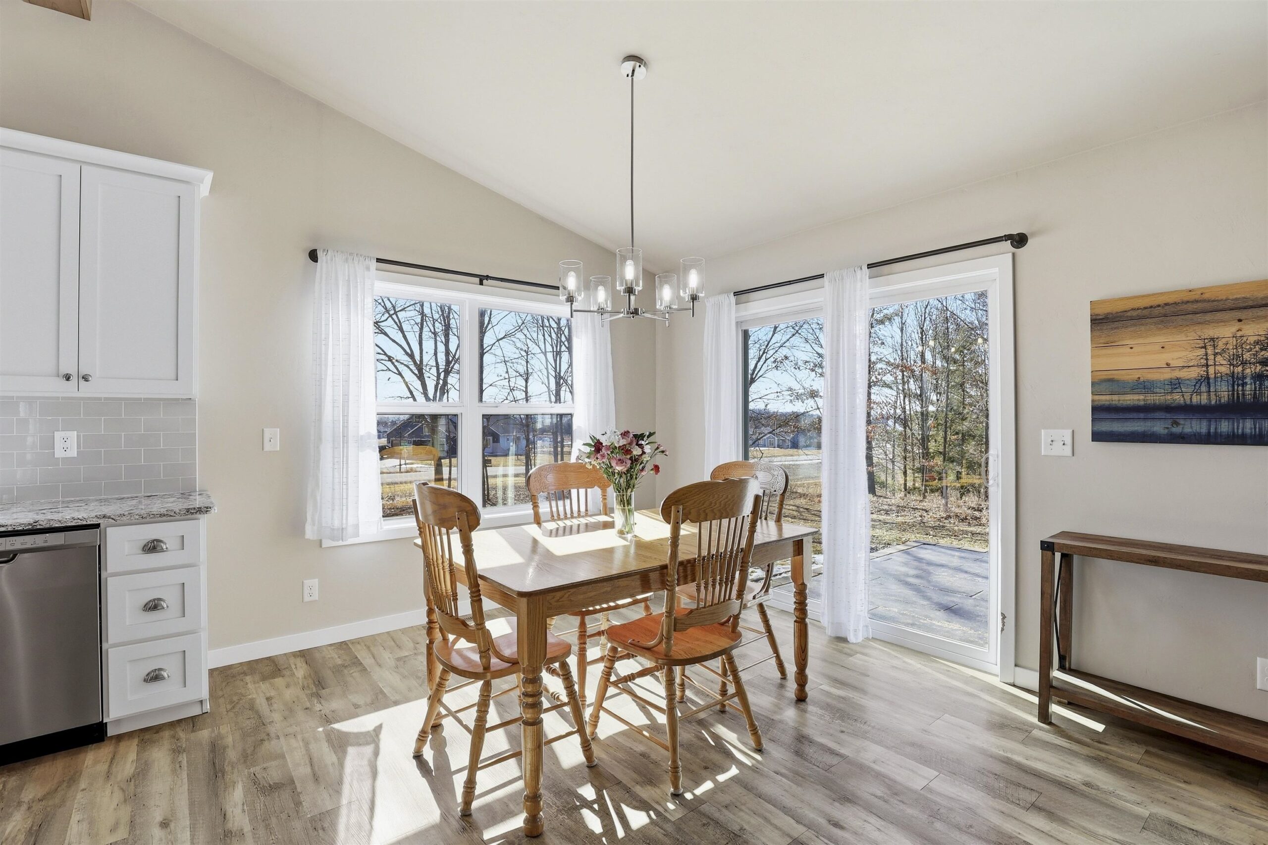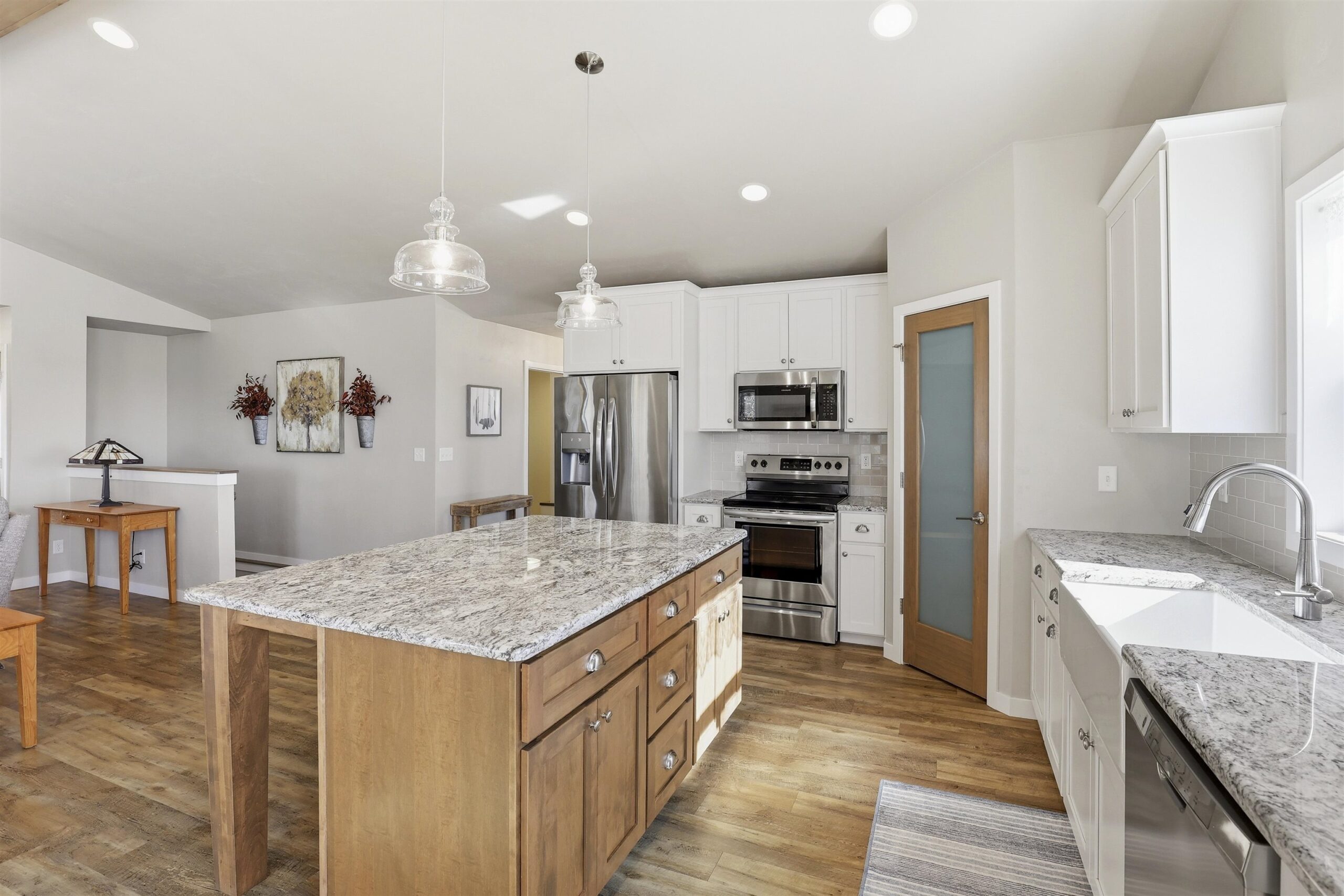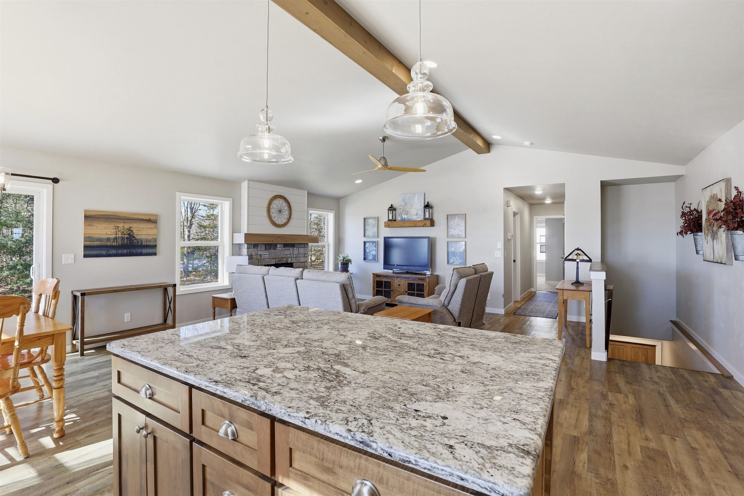 Well-designed Ranch-style home featuring cathedral ceilings and an open-concept layout filled with natural light, making everyday living and entertaining easy. The primary suite includes ample space, a walk-in shower and dual vanity. The lower level offers an egress window and is stubbed for a future bathroom, providing additional finishing potential. Enjoy a spacious yard and open surroundings that create a peaceful, country-style setting while still connected to municipal water and sewer. Seller prefers 48 hour binding acceptance.