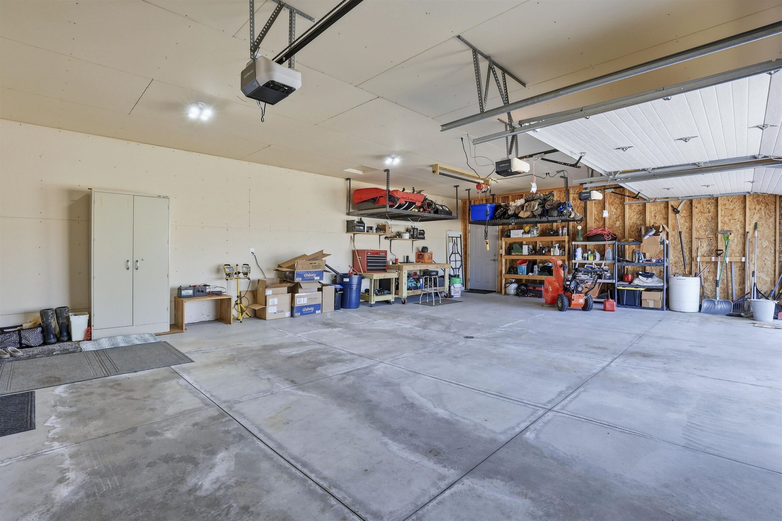 Two shelves hanging from Ceiling in garage, hoist in garage and Seller's personal property.
