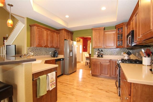 Gorgeous home by parks, pool, school & walking trails rests on cul de sac lot! Charming wrap-around front porch, 3-car garage, incredible 2-story great room w/fireplace, wide white trim, wanes coating, crown molding, 6-panel doors, wood & tile floors! Beautiful kitchen w/Mosaic tile backsplash, cherry cabinets, solid surface counters, stainless appliances! Office w/wall of custom built-ins & formal dining! Amazing, huge master suite! Finished walk-out lower level w/wet bar, family room & play room/den! WOW!