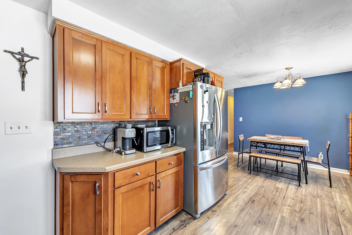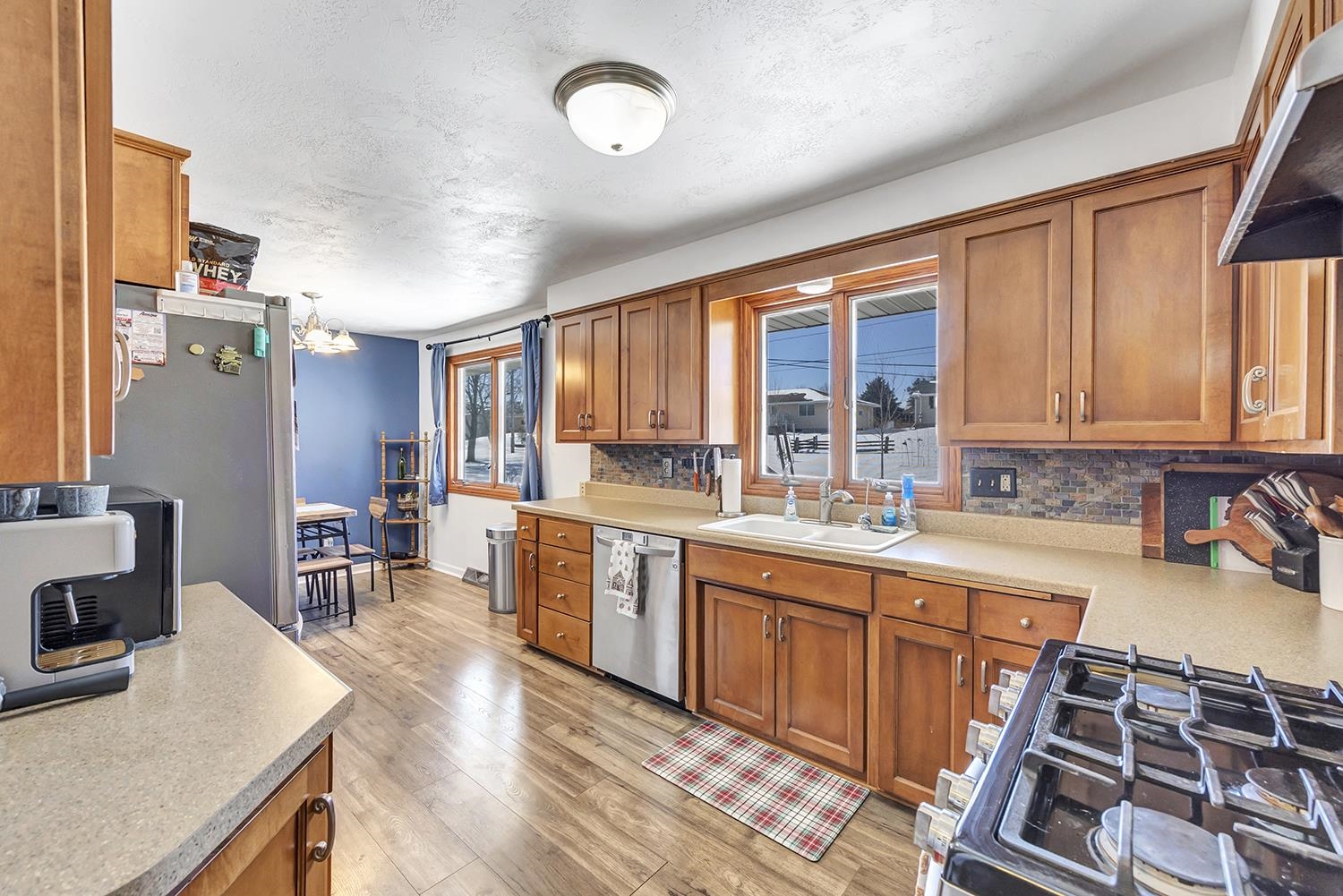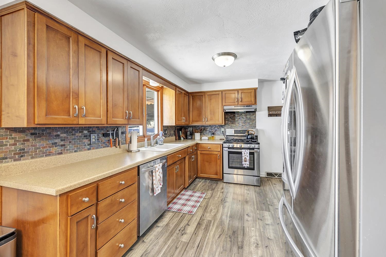 Spacious ranch home on an oversized .32 acre landscaped setting located within minutes to schools, Ahnapee State Trail & highway for easy commute access. Sun flooded living room w/lg picture window for natural light, luxury vinyl plank flooring throughout main level & opens to dining area & kitchen. Applianced kitchen offers an abundance of maple cabinets, SS appliances, custom tile backsplash & adjoining dining area. 3 main level bedrooms + a full bath. Full LL features a finished family room w/fireplace and adjoining bar area, full bath w/tiled step-in shower & laundry area w/washer & dryer included. Updated incl: water softener, water heater, central air, updated electric panel, replastered, painted & new trim in living room, kitchen & dining. 2 car attached garage + 8x10 storage shed