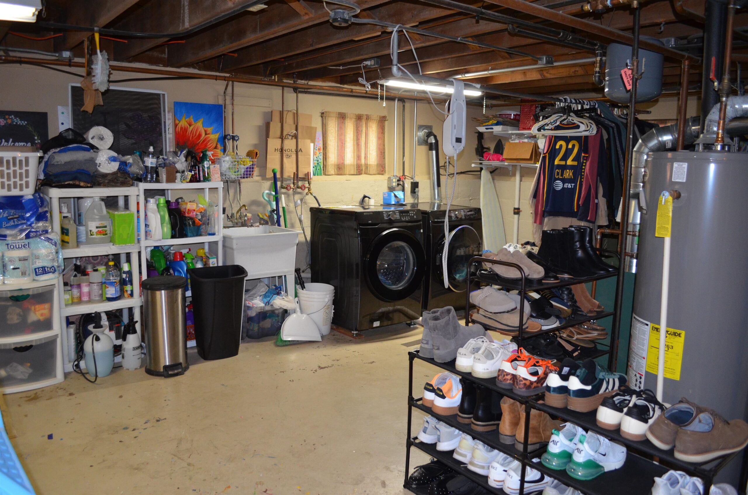 stove, Fridge, Washer, Dryer, Two window air conditioners, workbench in garage