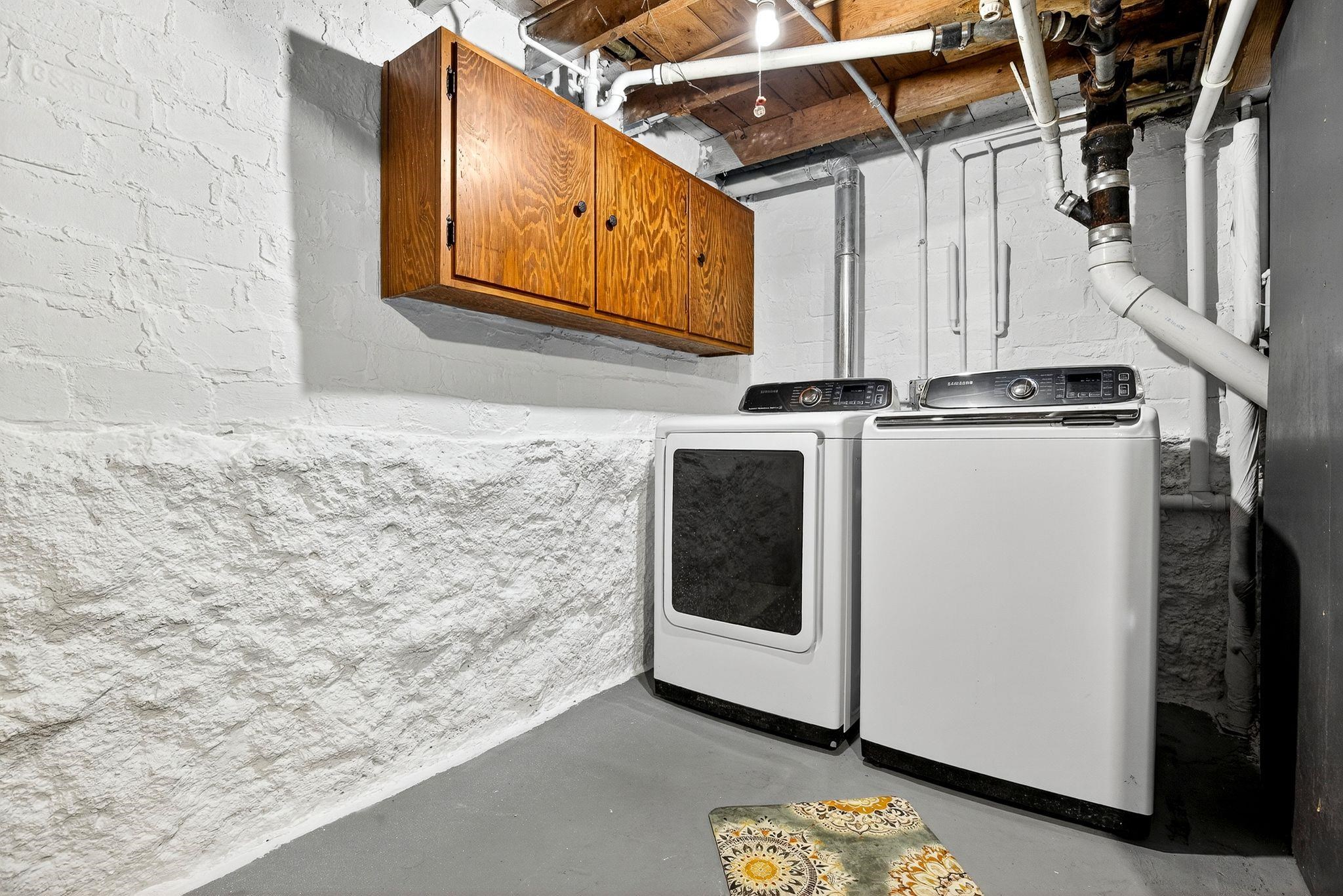 Refrigerator, oven/range, dishwasher, washer, dryer, bench in basement