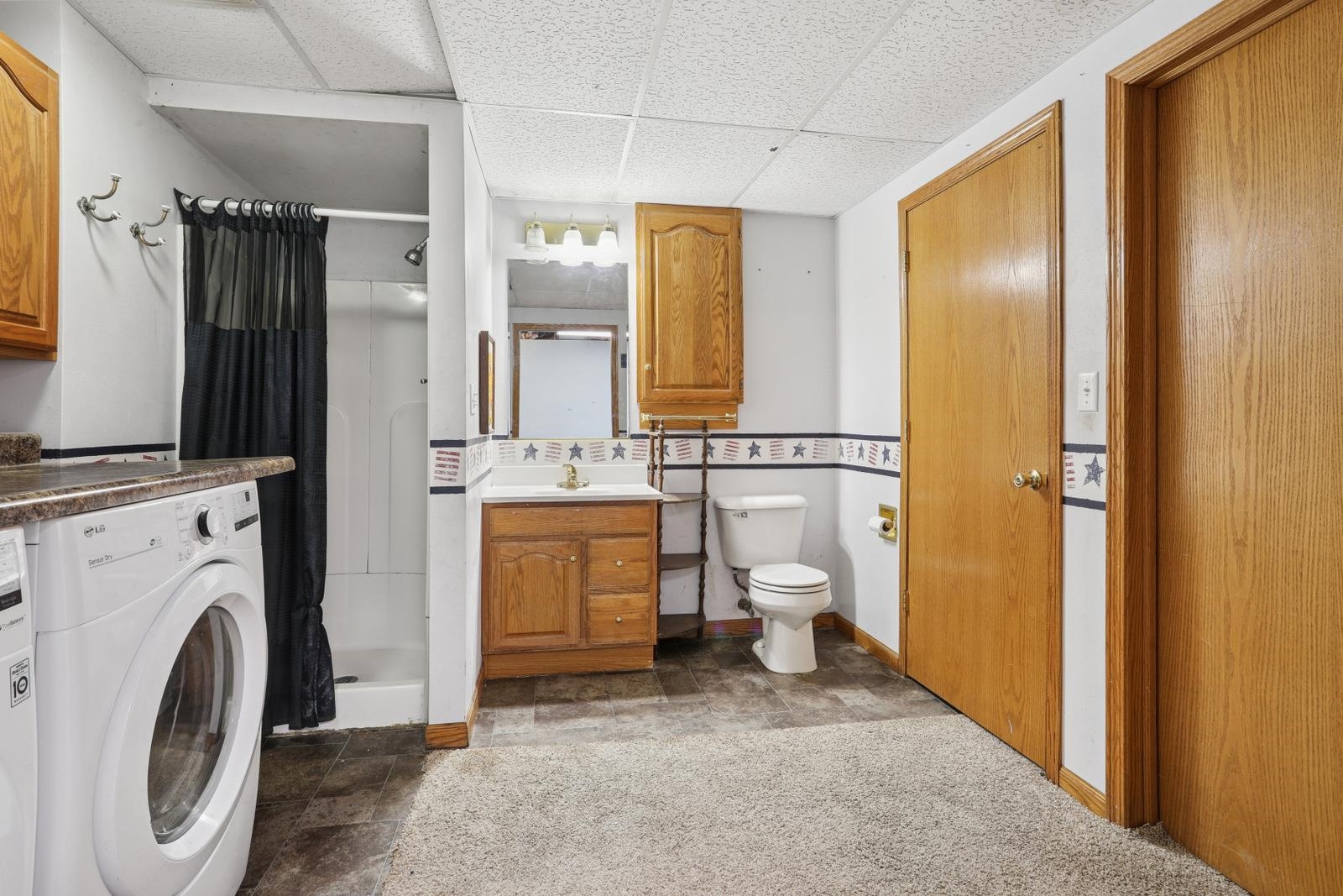 Stove, Refrigerator, Dishwasher, Microwave, Washer, Dryer, A/C unit in blue bedroom, garage cabinets