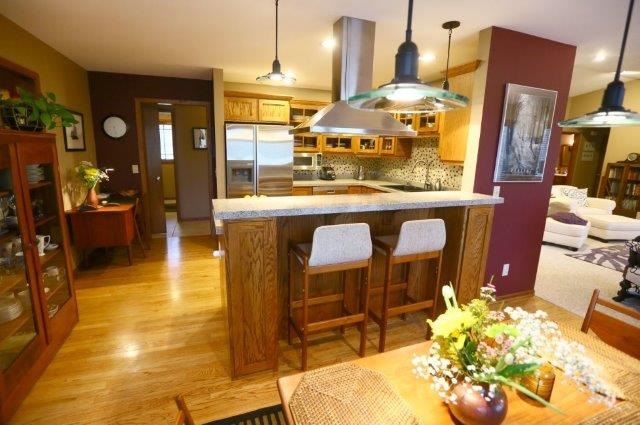 Something special awaits you. Meticulously crafted and cared for Prairie Style home on Virgin Lake wetland. Attention to detail is evident everywhere - gorgeous views and flowing floor plan. Fantastic kitchen with large pantry opens to informal dining and living room with fireplace. Formal dining. Walkout lower level with family room w/2 sided fireplace, studio/office and 3 additional bedrooms. New roof 2014 per seller. Large storage areas include 480 SF sub-garage. Easy access to parks/shopping.