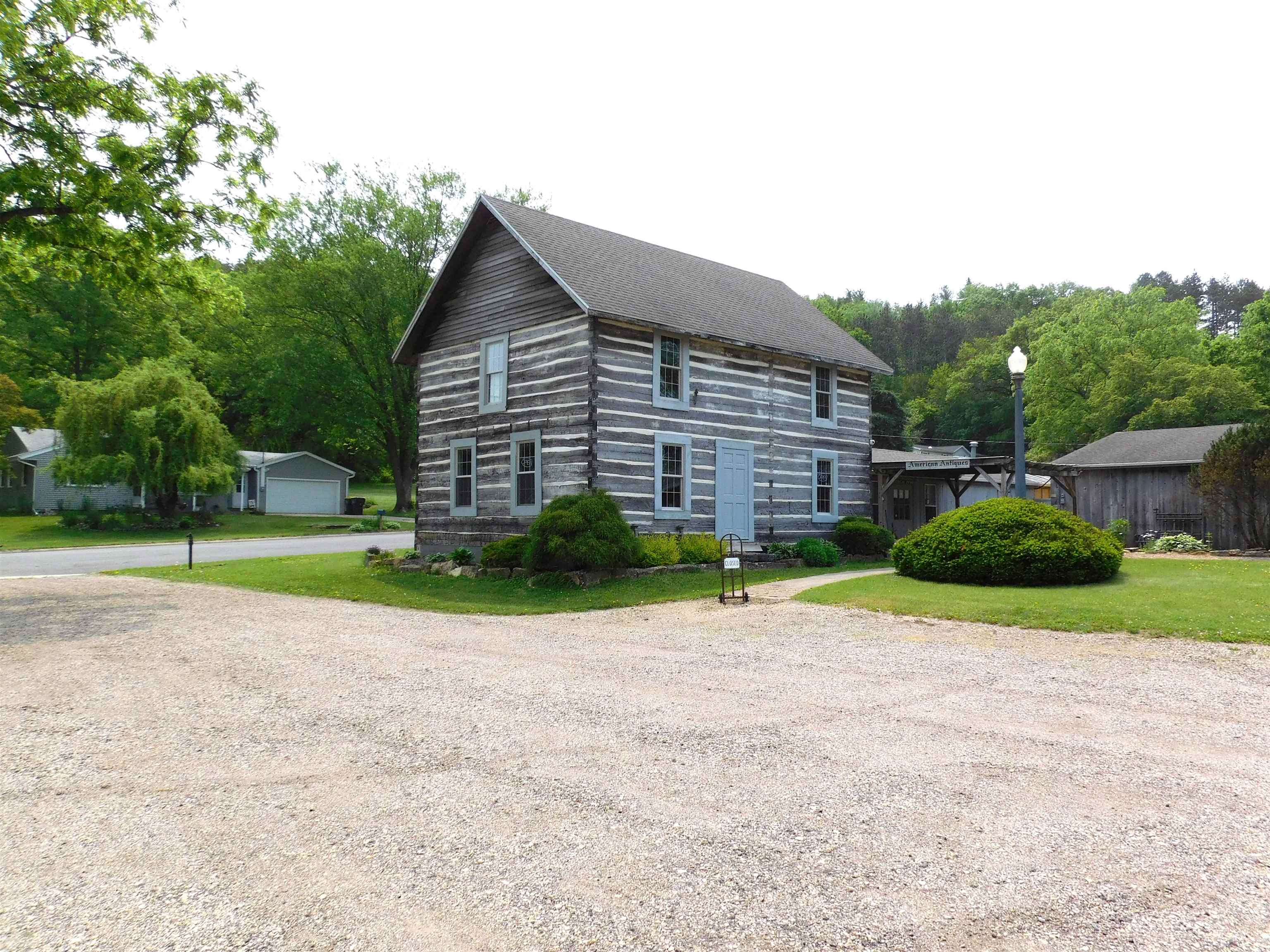 Zoned B1 commercial with 160 ft of Highway 14 Frontage. Just over 1/2 acre lot. The log building originally built in the mid 1800s in Spring Green was taken apart and reassembled on a concrete foundation at it's current location. The detached Warehouse style buildings have heated and unheated areas and a half bath. Many possibilities for this unique property. The 33'x20' 2 story log building and attached 80'x20' building have approximately 3,600 square feet including basement. The 115'x40' storage building has approximately 4500 square feet.