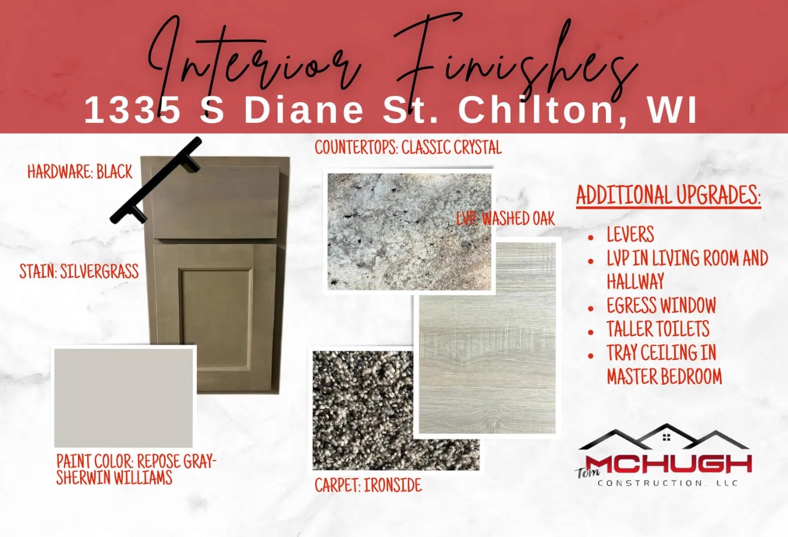 Welcome home from Tom McHugh Construction! This home is under construction!!! The 1339-MA floor plan from our MA collection, a 3 bedroom, 2 full bath ranch design. Standard features include insulated garage doors, fiberglass exterior doors, 2 panel interior doors, 1 egress window, central AC, basement stubbed for a future bath. Photo is computer generated. Open Houses will be held at the Model at 712 Bessy on Thursdays from 5:30-6:30. Full driveway to street included (including apron), final streets are already installed.