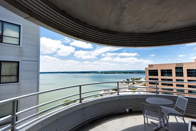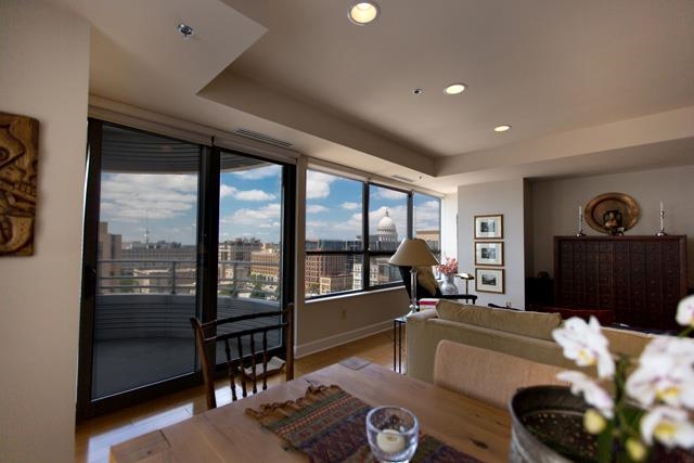 Experience high-rise city life w/unparalleled lake, Capitol views & sunsets from this exceptional S/W-facing 2 bdrm+study upper floor residence. Every living space has a view of either Lake Monona or Mendota. Open living concept w/270 degree terrace offers a perfect entertaining venue. Spacious crnr mstr suite w/private built-in study is a quiet respite. Exceptionally appointed w/GE profile SS, hrdwds, Kohler fixtures. Live, dine & play in the heart of downtown! Seller to entertain all reasonable offers.