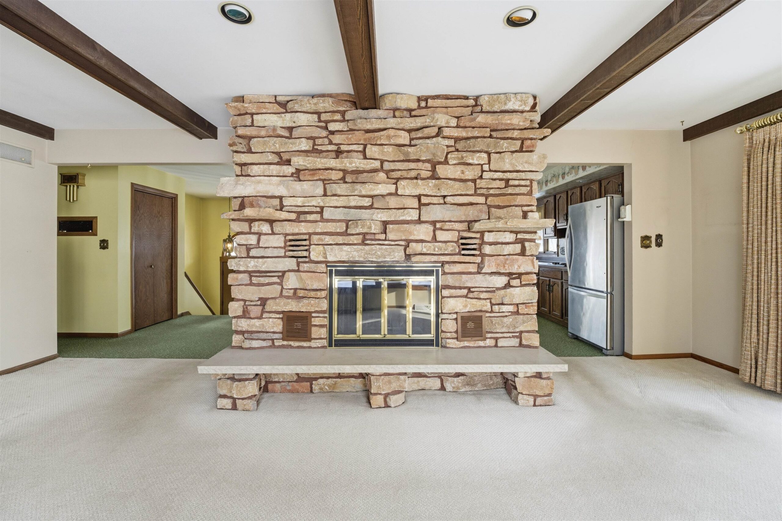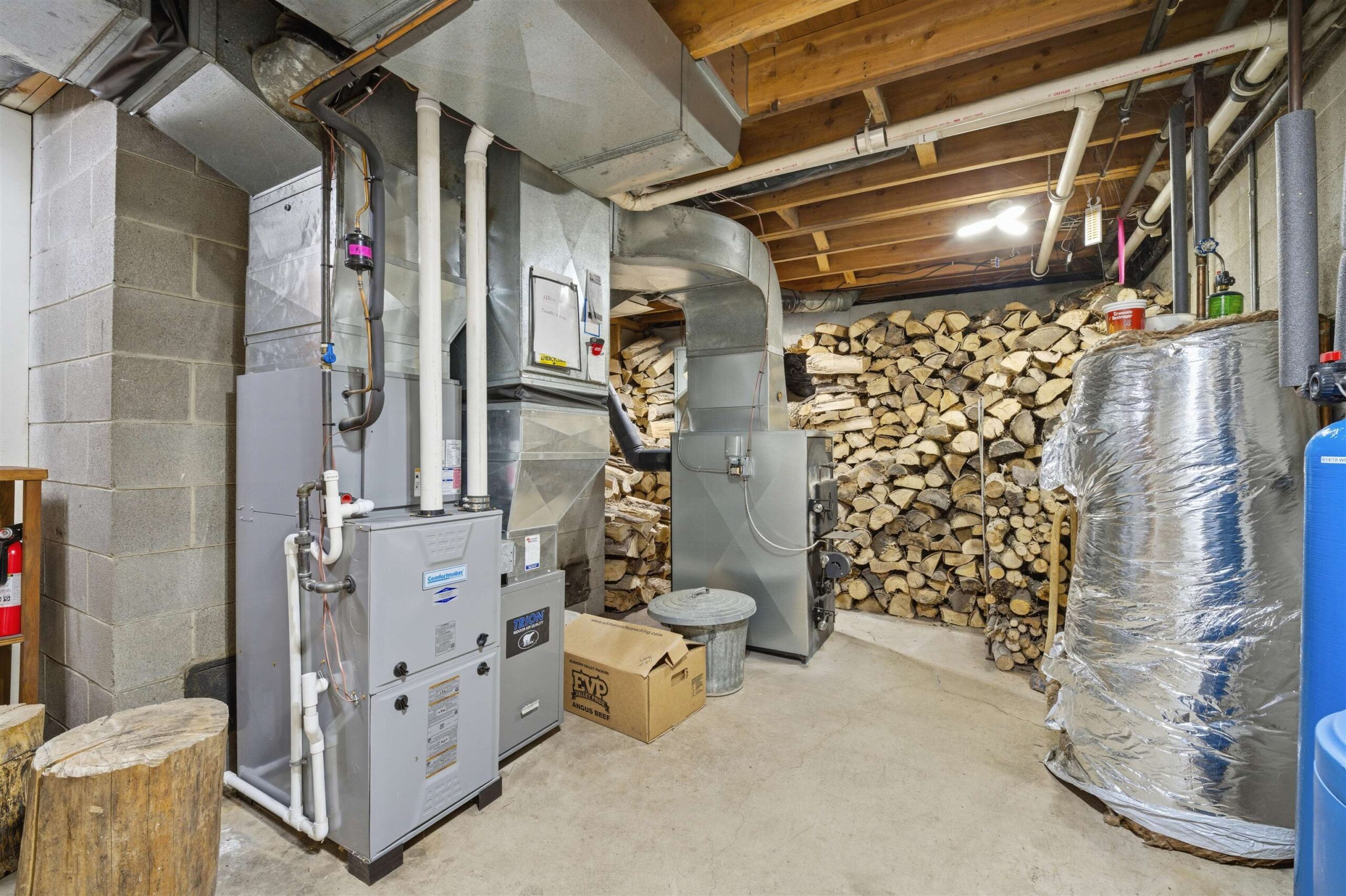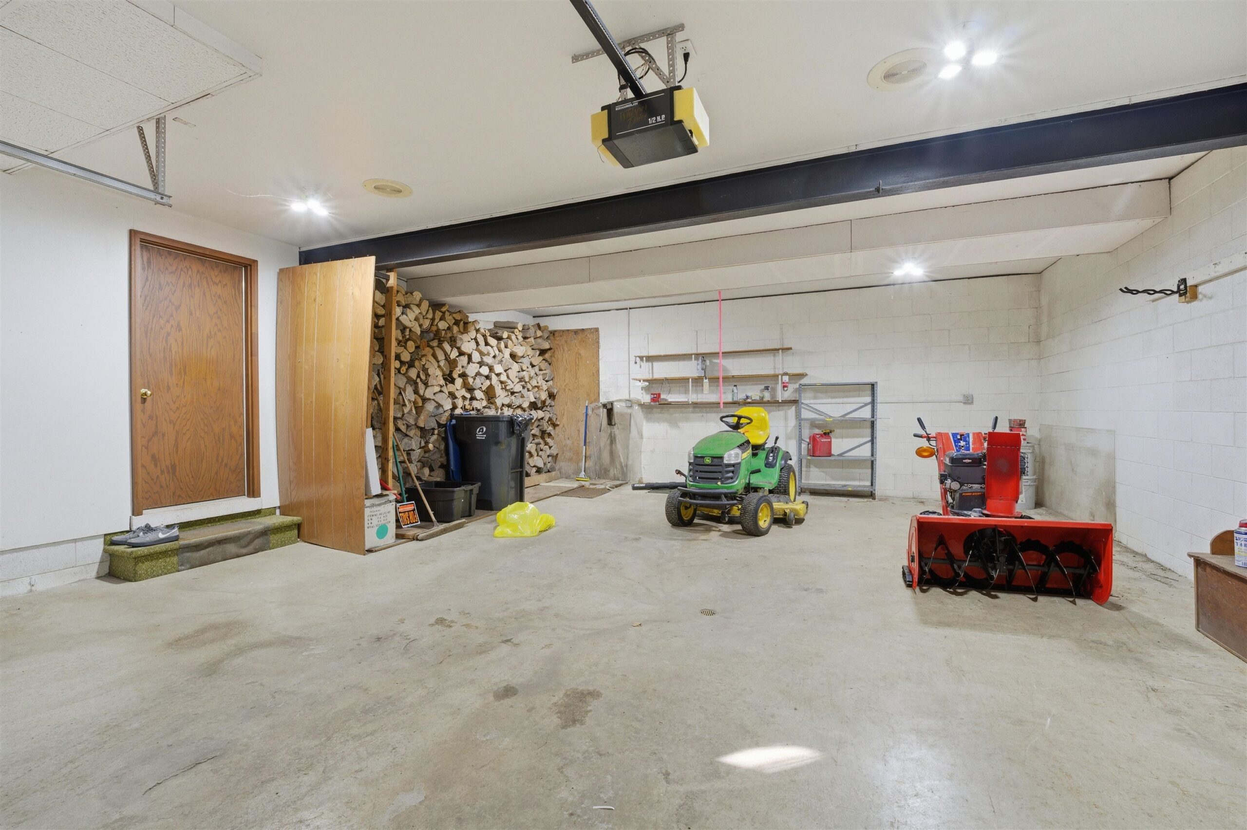 Window treatments, refrigerator, washer, dryer and wood pile in garage.