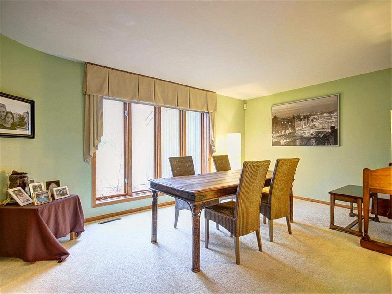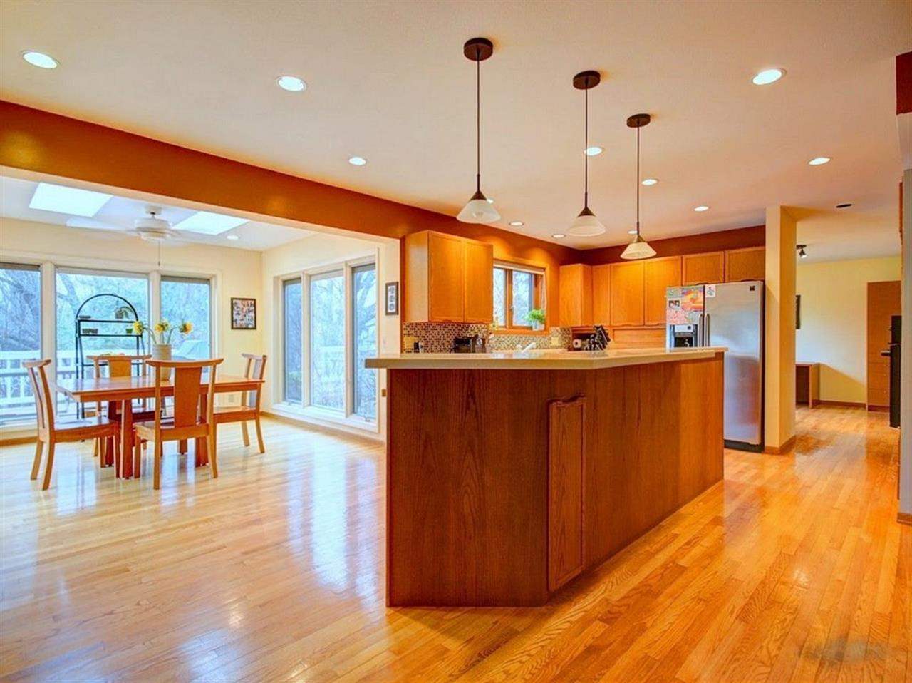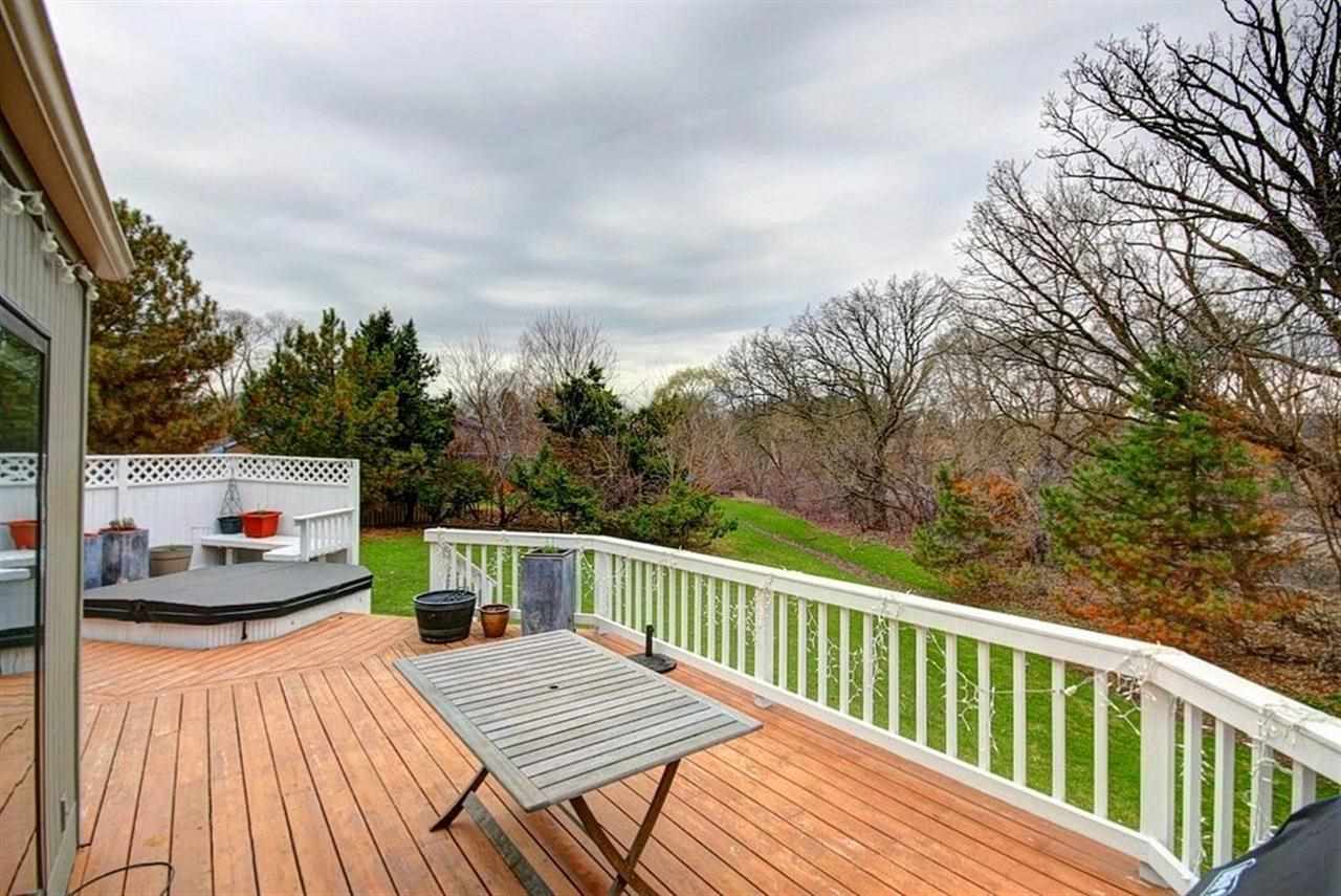 Beautiful contemporary set on large, wooded lot. Breathtaking two-story great room with fireplace and built-ins. Expansive kitchen opens to relaxing sun room with deck access and backyard views. Main level boasts skylights, formal dining, office and laundry. Exposed lower level with family room exercise room and 3/4 bath. Many recent updates - freshly painted interior, new tile flooring. Walking distance to Elm Wood and the best rated High School in Wi.