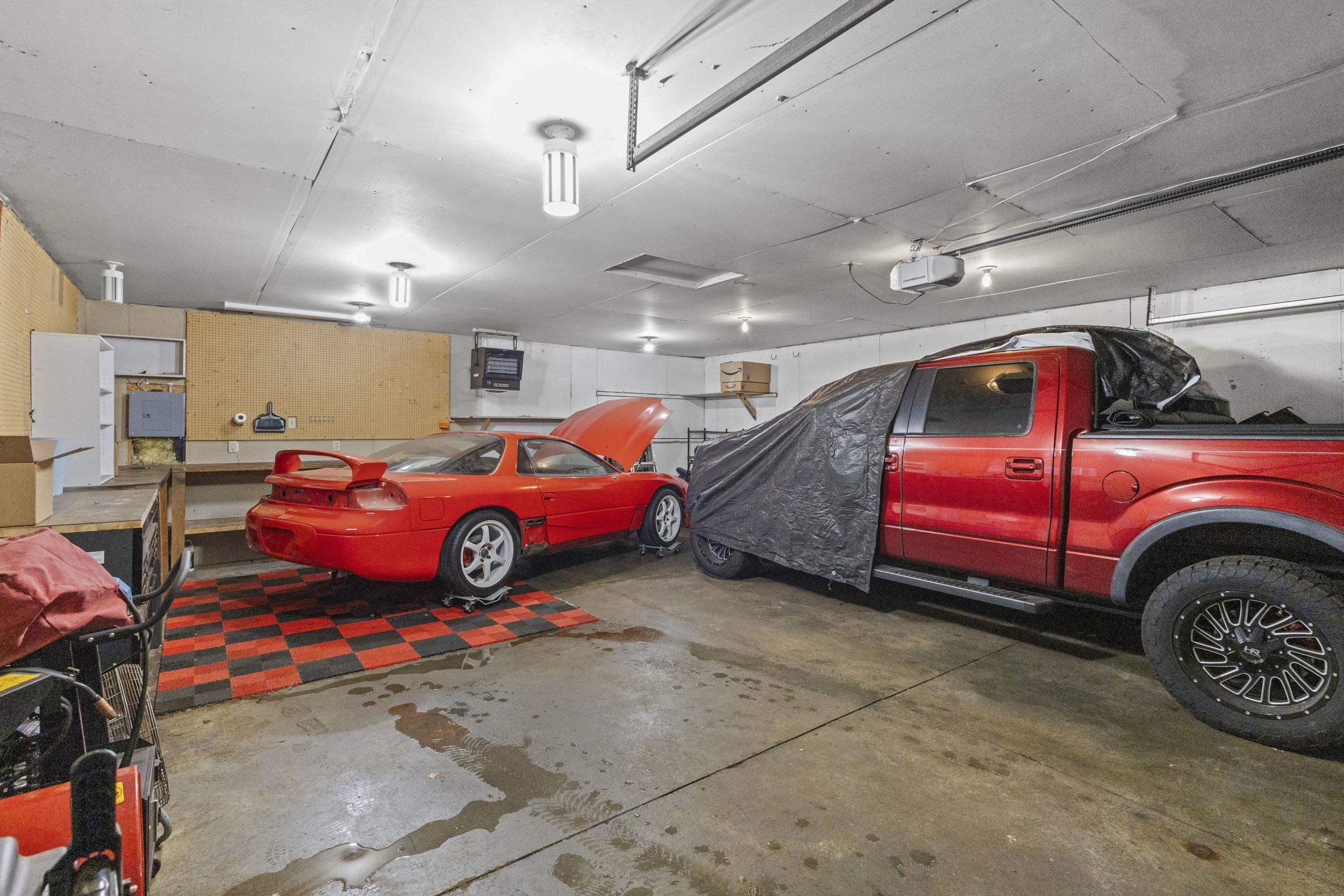 Sellers personal property, curtains, wall TV mount, black work bench in garage, hooks on wall in garage, fan in garage, fridge in basement