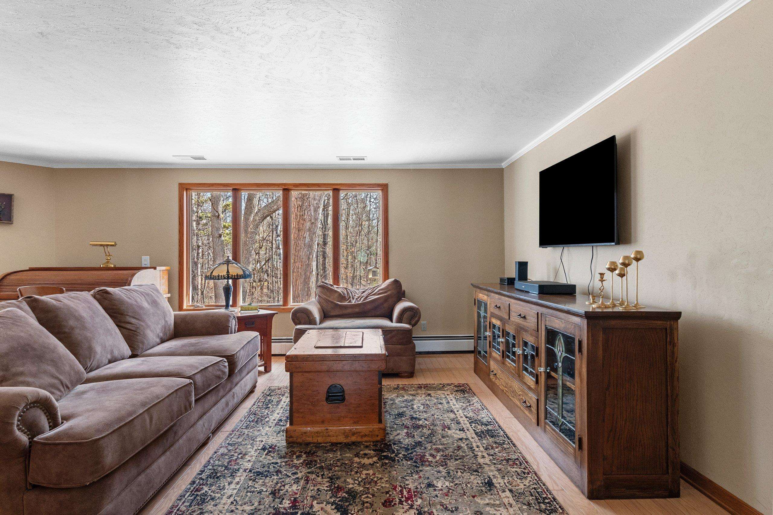 Welcome to this custom-built ranch in Bellevue on over 0.6 acres at the end of a cul-de-sac, backed up to woods and a peaceful ravine. With only 2 owners, this home features 3 beds, 2 full baths, and thoughtful layout. The bright sun room is perfect for morning coffee with wooded views, while the family room offers a cozy wood-burning FP. The kitchen is equipped with SS appliances and flows seamlessly throughout the main level. Downstairs you'll find a bar, bonus rec space ready for your finishing touches, a spare room, and an unfinished laundry room with sink and toilet (LL has concrete floors) The 2-car attached garage provides storage and easy access. Only minutes from the highway, shopping, and restaurants, but the wooded backyard and ravine make it feel like your own private retreat.