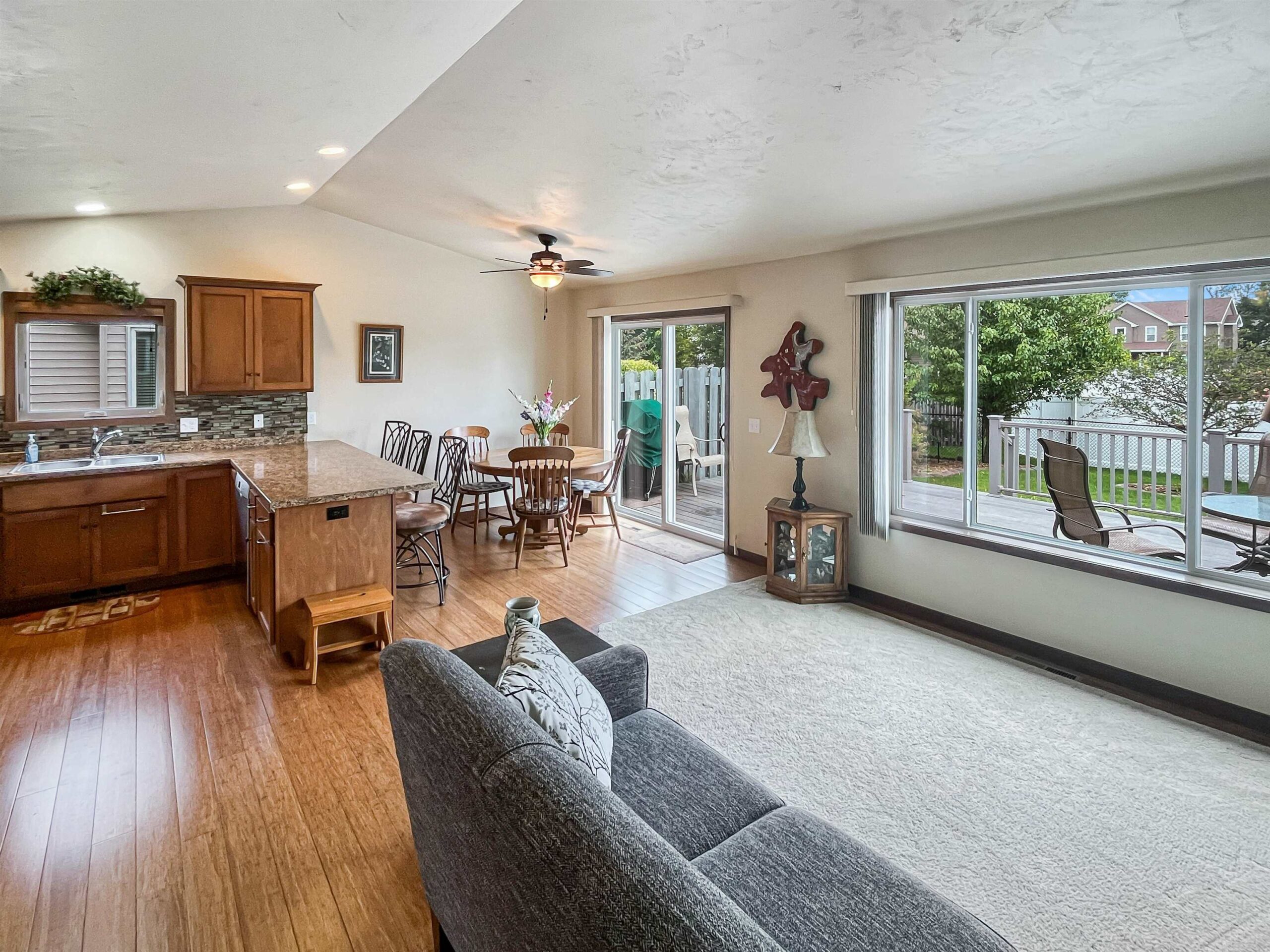 Welcome to this stunning three-bedroom, two-bath condo in the vibrant City of Neenah! This home features an open-concept design with a cathedral ceiling and beautiful bamboo flooring throughout. The spacious master bedroom boasts a full ensuite bathroom, and the convenience of first-floor laundry adds to the ease of living. Enjoy the outdoors on your private deck overlooking a fully fenced yard, perfect for relaxing or entertaining. This unit includes a two-car garage, landscape curbing, and many newer appliances. With no condo fees and unit owners responsible for their own lawn care and snow removal, this home offers the perfect blend of comfort and independence.