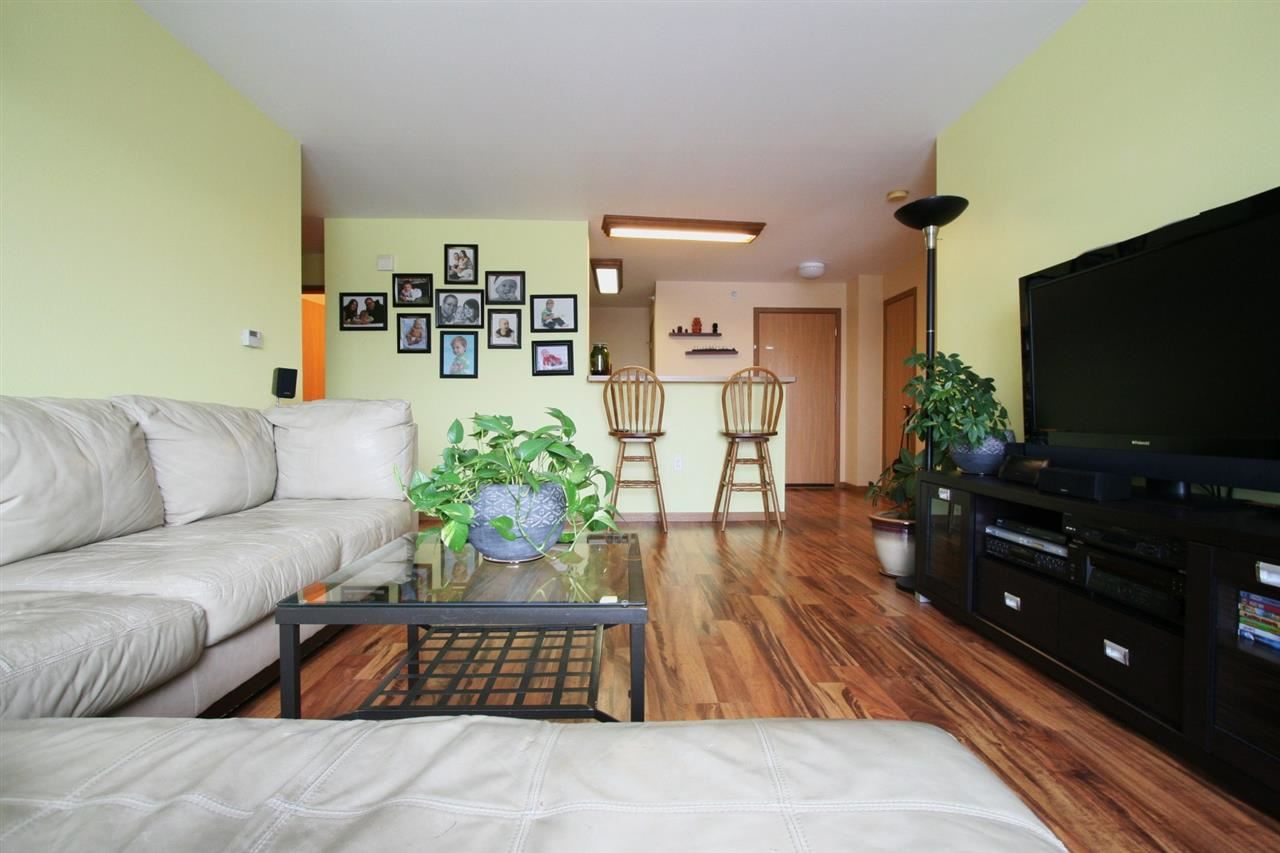 Excellent 3 bedroom, west facing unit with plenty of natural light and two patio doors opening to the over-sized balcony from living room and master suite! Unit features a spacious living room, open kitchen with breakfast bar, laminate wood flooring and a split bedroom floor plan. Master suite has a large walk-through closet and private full bath. In-unit laundry, storage unit on same floor. Indoor, 1 car underground parking, pool, fitness center, whirlpool and community center! Secure elevator building.