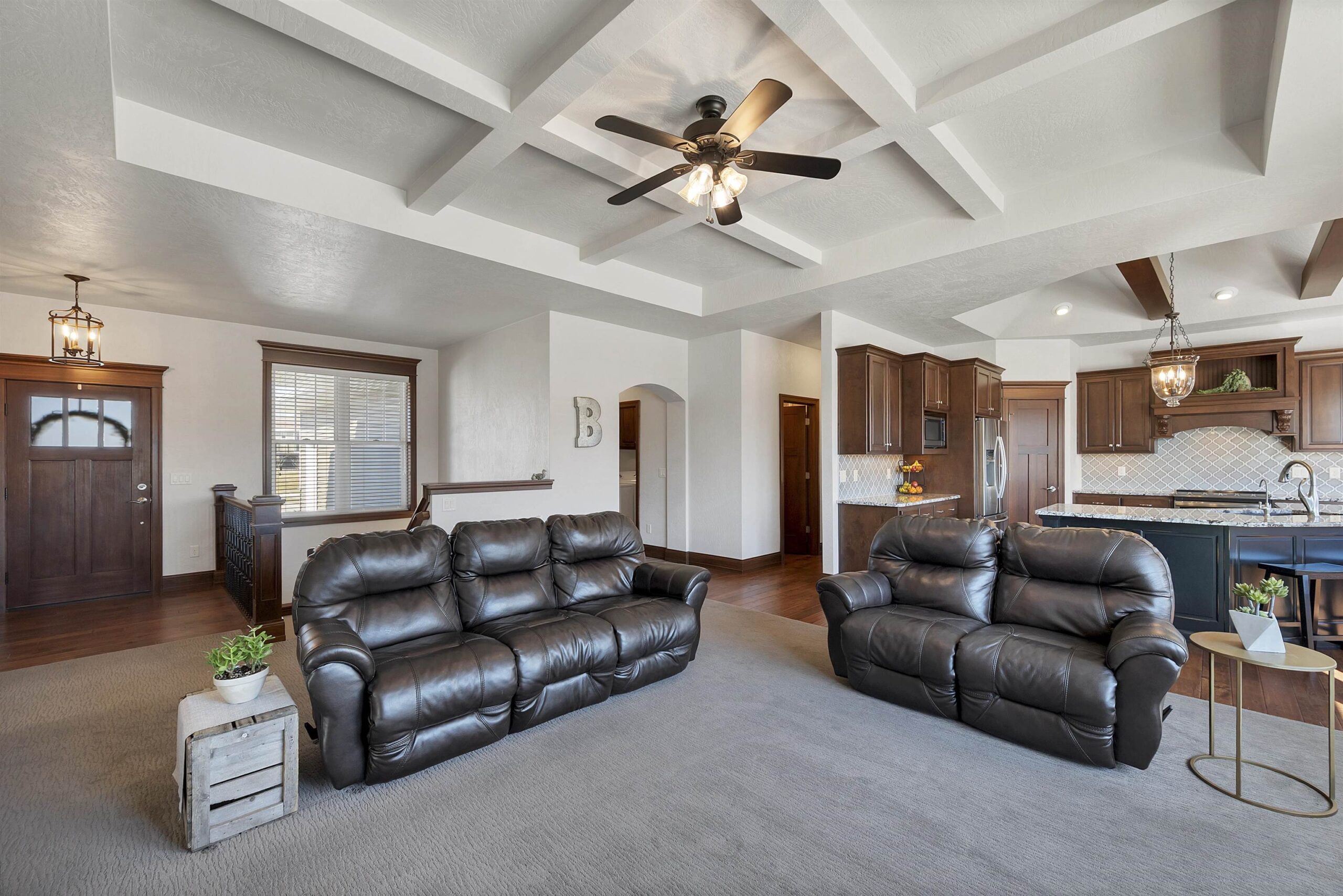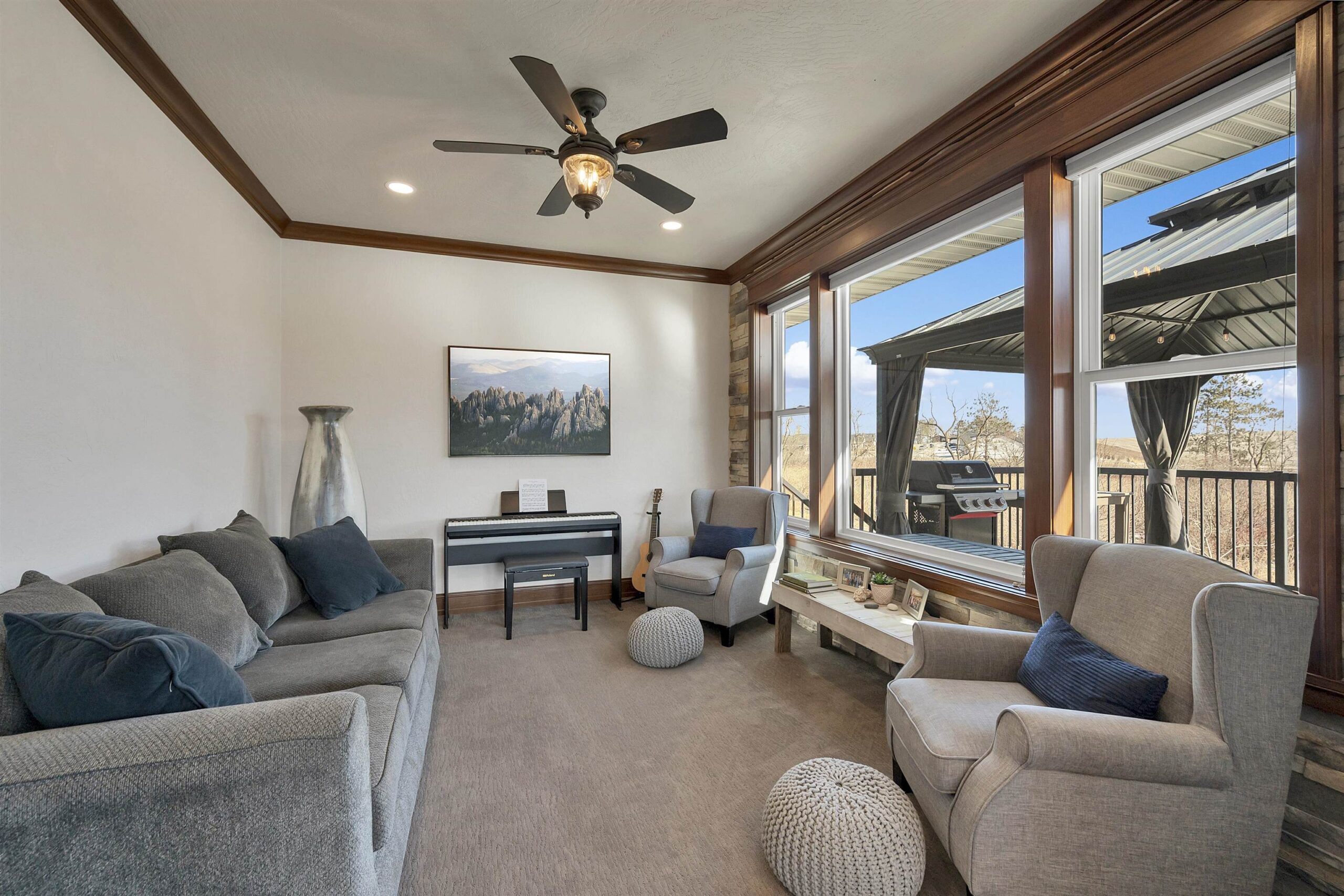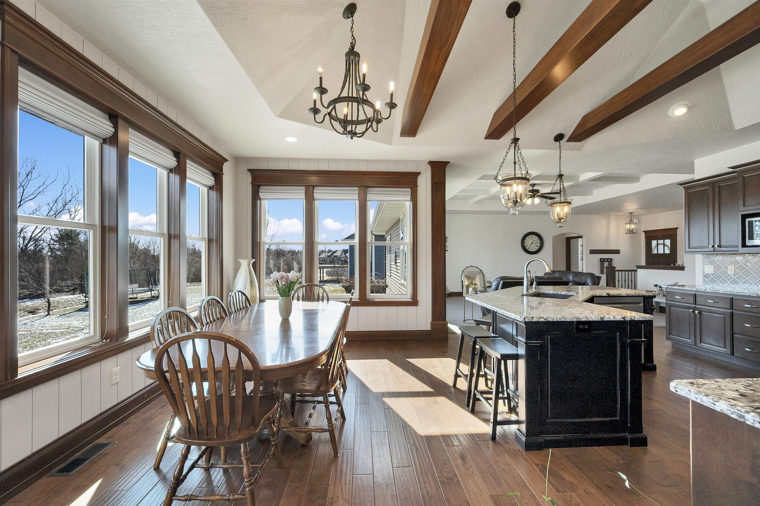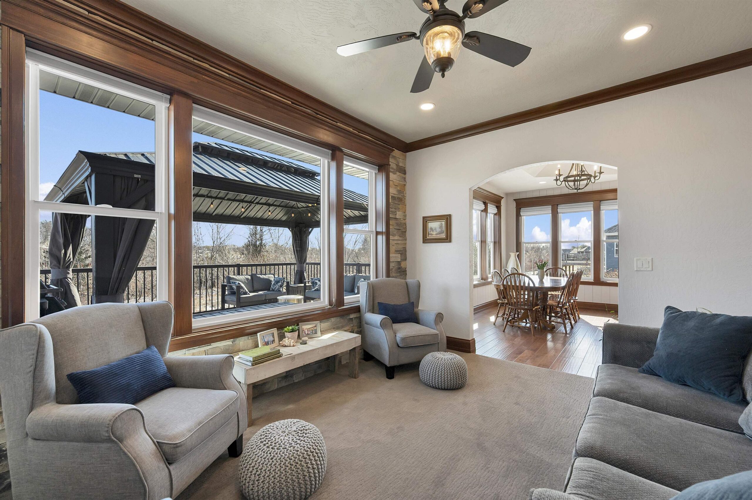 Beautiful Fall 2015 Showcase home in Howard featuring a spacious kitchen with a beamed cathedral ceiling, four-season room, and finished lower level completed in 2020! The main level offers a large living room with a coffered ceiling and a fireplace that flows into the kitchen and dining area. The primary suite includes an ensuite bathroom with walk-in shower, large walk-in closet, and convenient access to the laundry room. Two additional bedrooms are also located on the main floor. Large picture windows provide great backyard views year-round. The lower level includes a kitchenette, exercise room, two bedrooms, full bathroom, and a spacious rec room. Enjoy the deck and gazebo, perfect for added privacy. Convenient location near Spring Green Park.