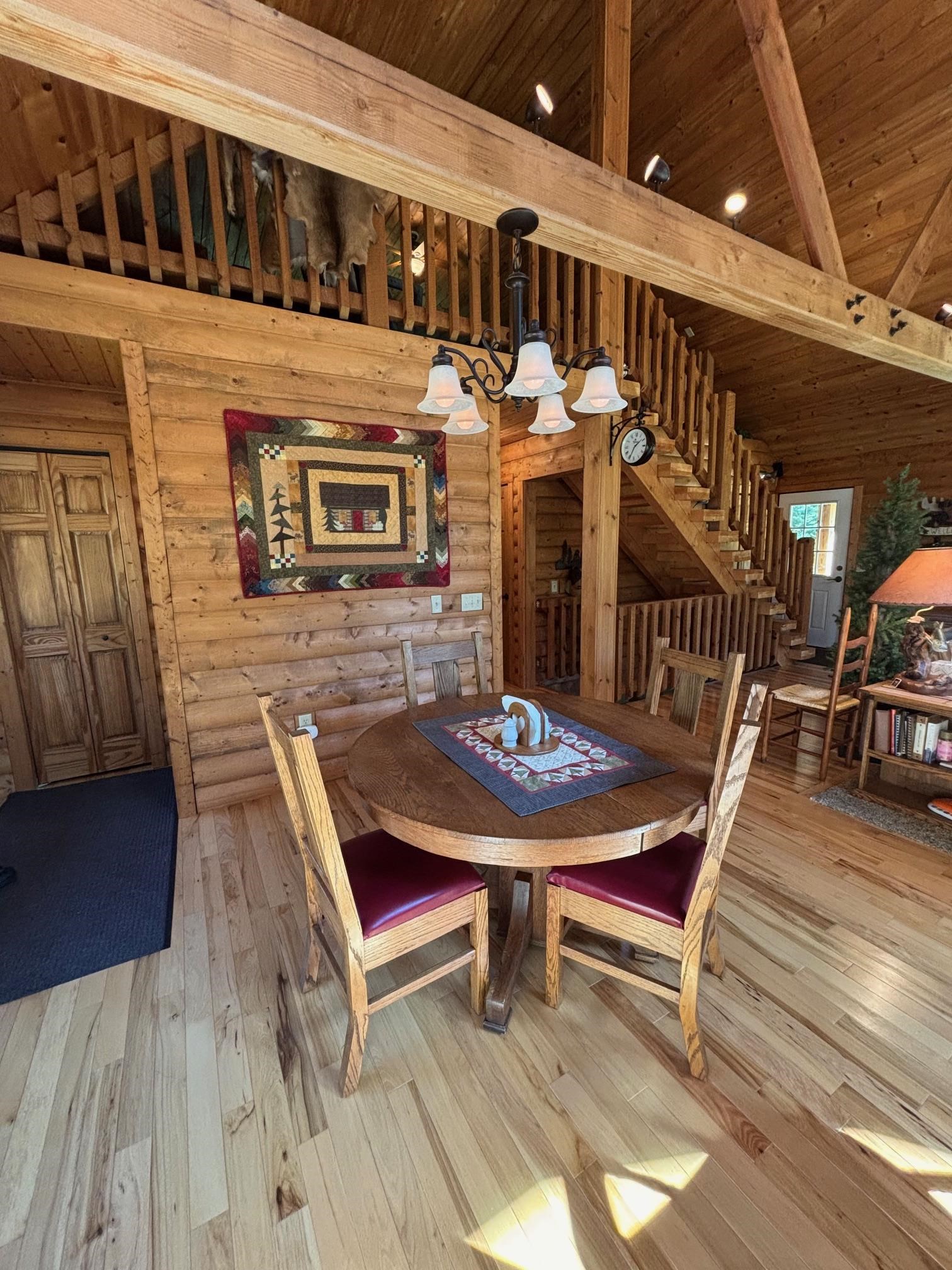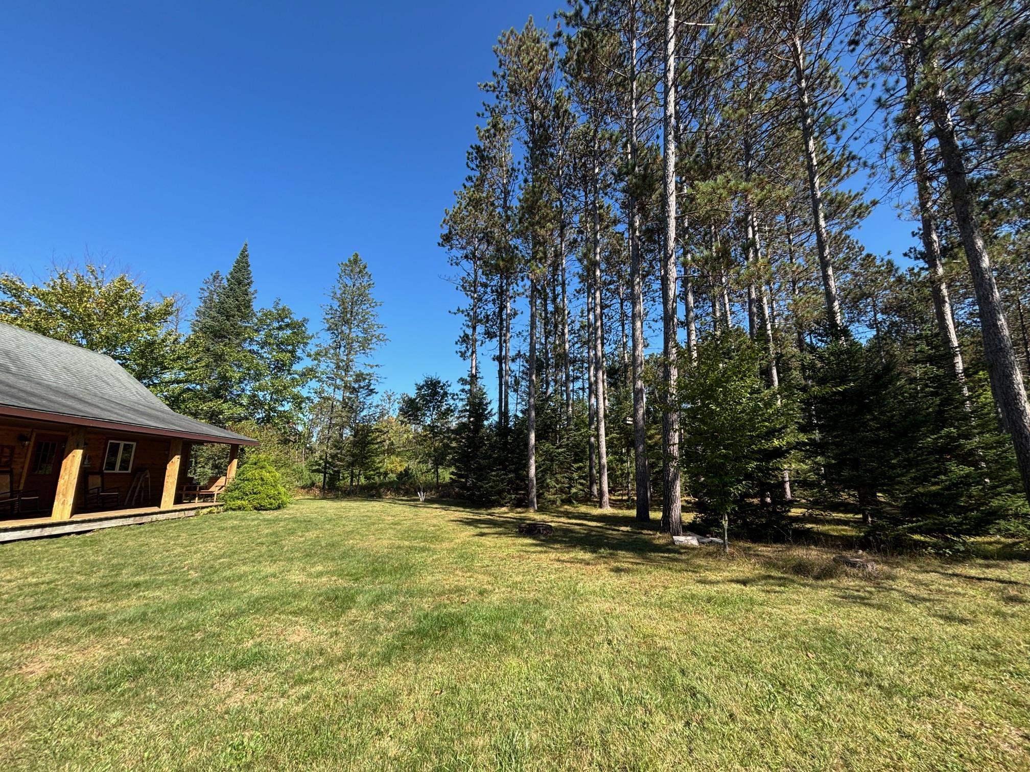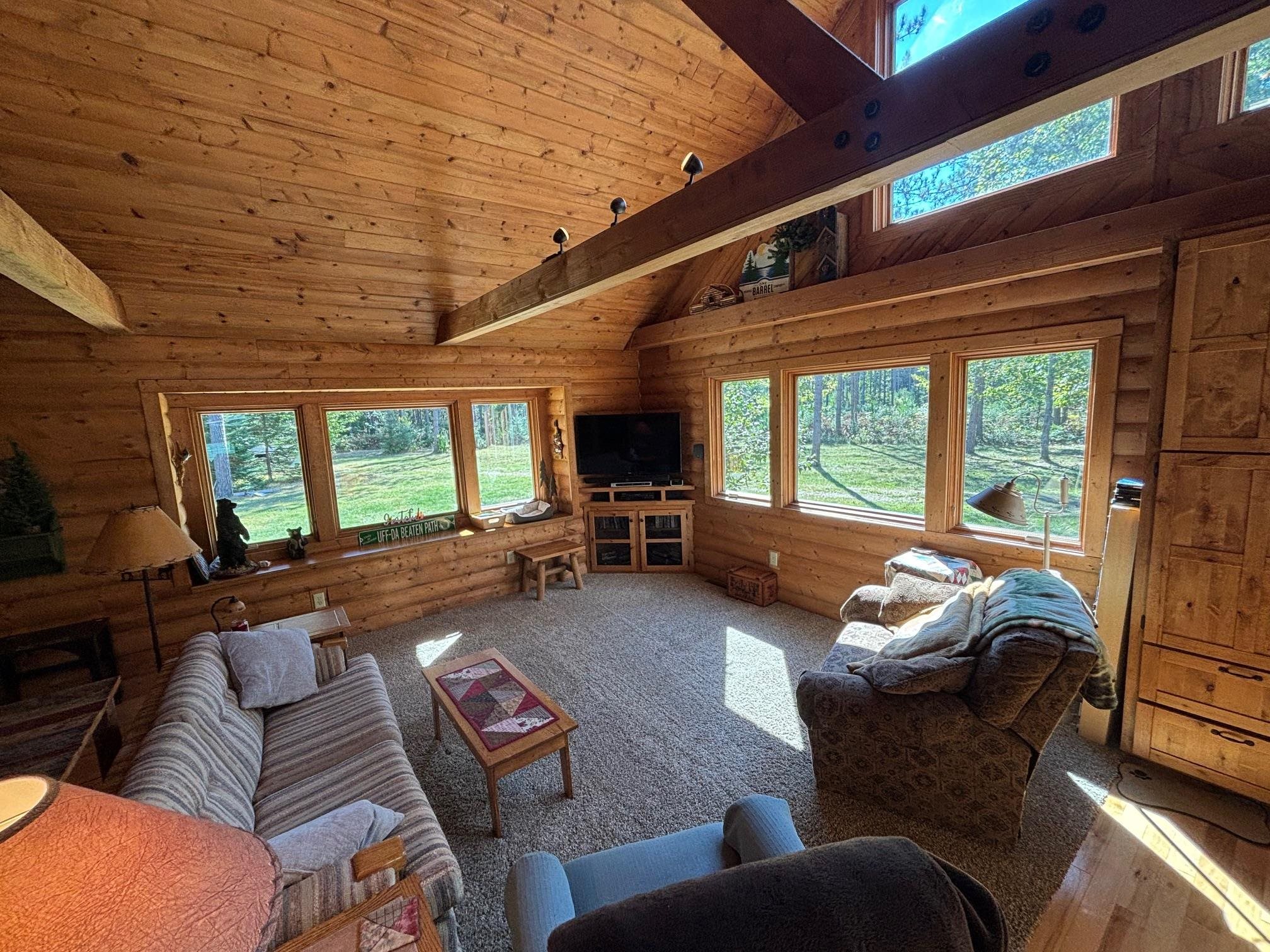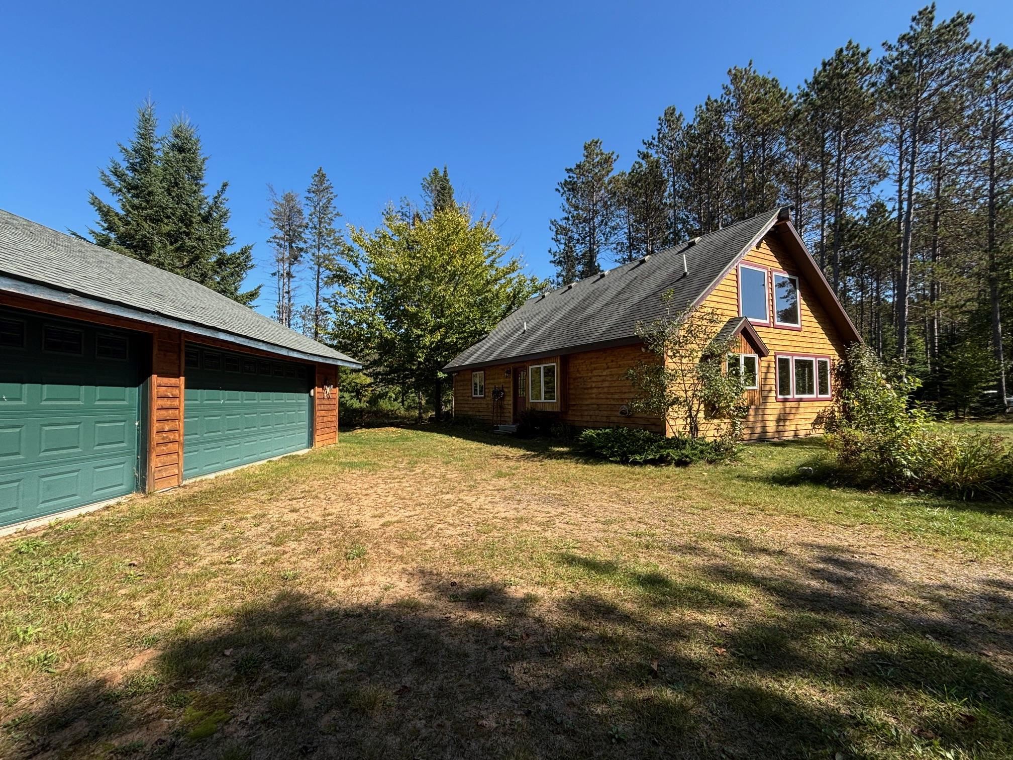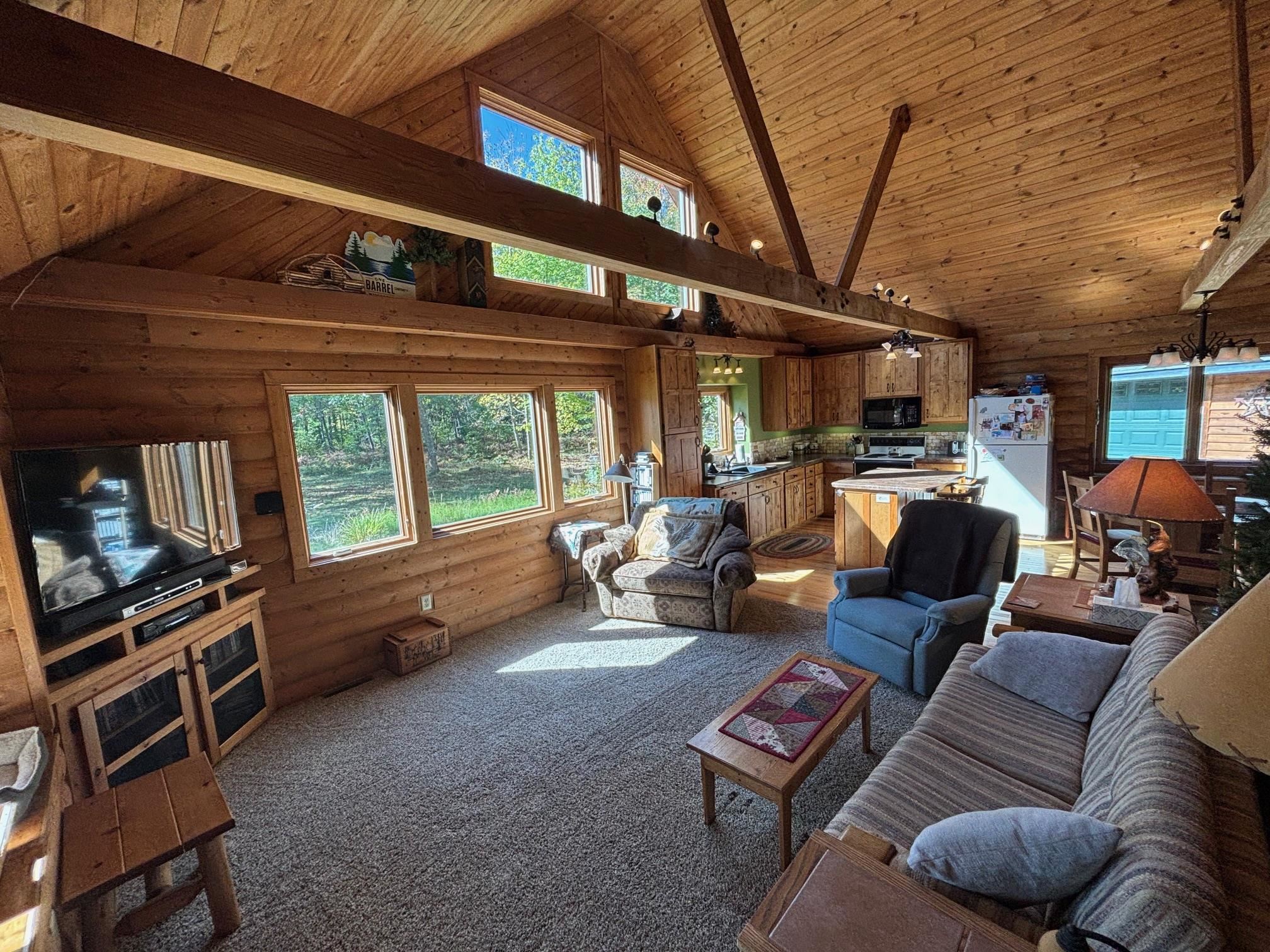 The tranquility of the Northwoods can be found at this quaint log cabin, which is tucked away on 10 acres of hardwoods and pines! The tongue and groove cathedral ceilings, knotty alder kitchen cabinets, log beams, and hickory hardwood floors are all beautifully designed. There are 2 bedrooms and a loft for extra sleeping space. Your design concepts are welcome in the full unfinished basement. From your new northern dream, you can easily access the trails. Excellent storage for outdoor toys in a 3 stall garage! Come take a look! Furnishings are negotiable for the turn-key option.