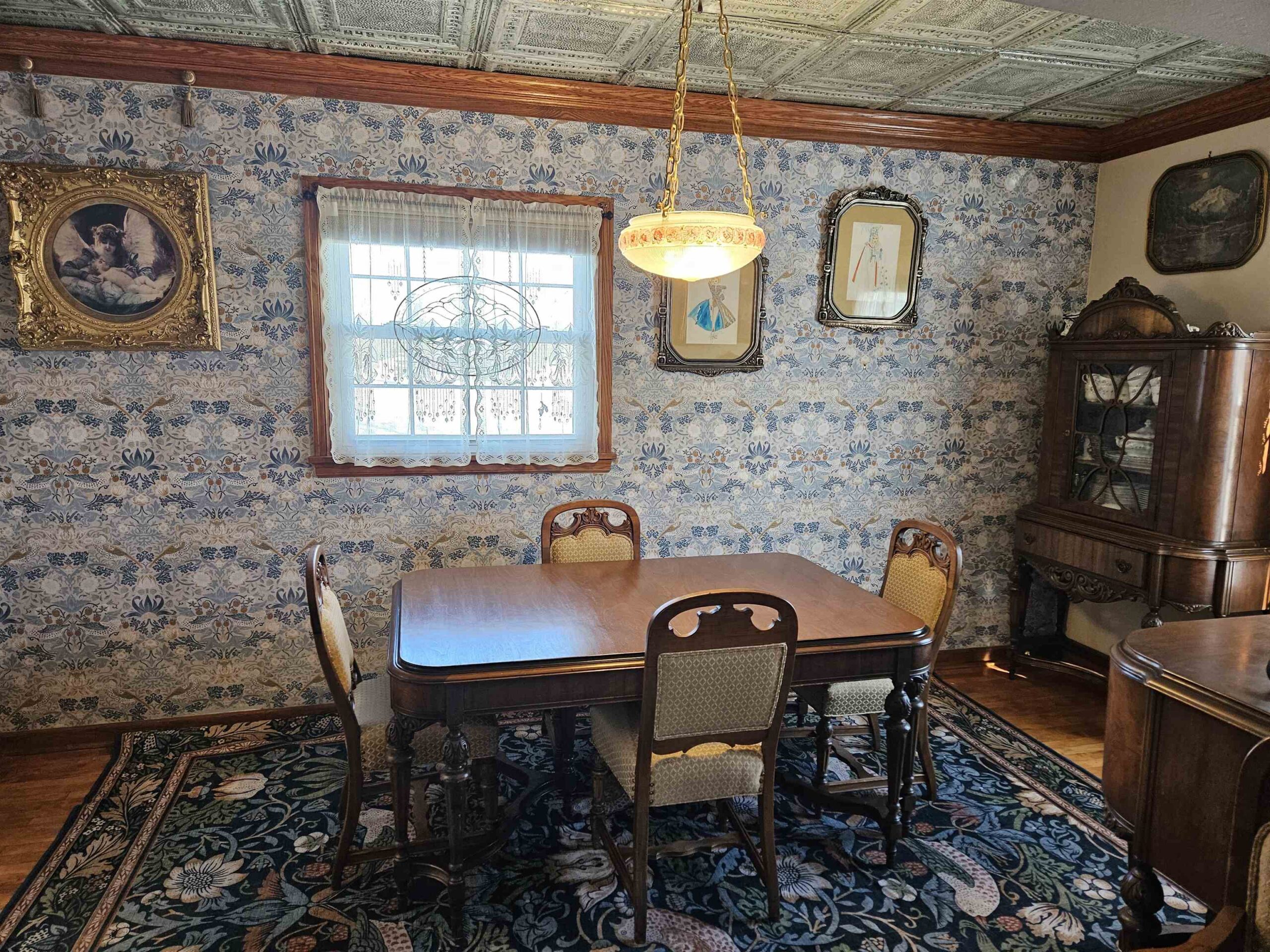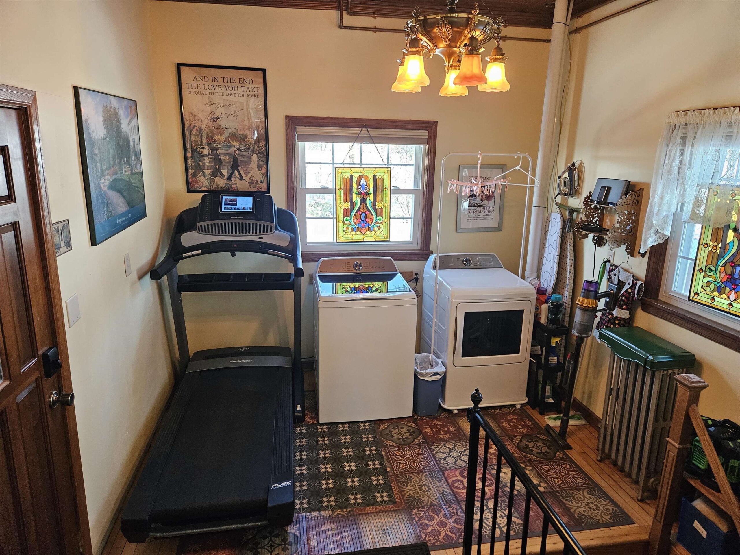 chandeliers in the DR + laundry area(will replace w/original light fixtures), All curtains, hanging leaded +stained glass in windows,, Washer/dryer