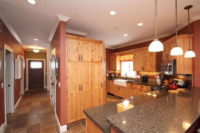 This is a green-certified Design Shelters built home. Features wood, slate and stained concrete floors. Custom built knotty alder cabinetry with granite tops throughout entire house. Ceilings range from 9-12 feet with crown molding. Fully exposed walkout lower level boasts kitchenette, family room with fireplace, two bedrooms, full bath and person sauna room. Plenty of closet/storage. Custom build cedar fence encloses the professionally landscaped yard. This is a must see home that is move in ready.