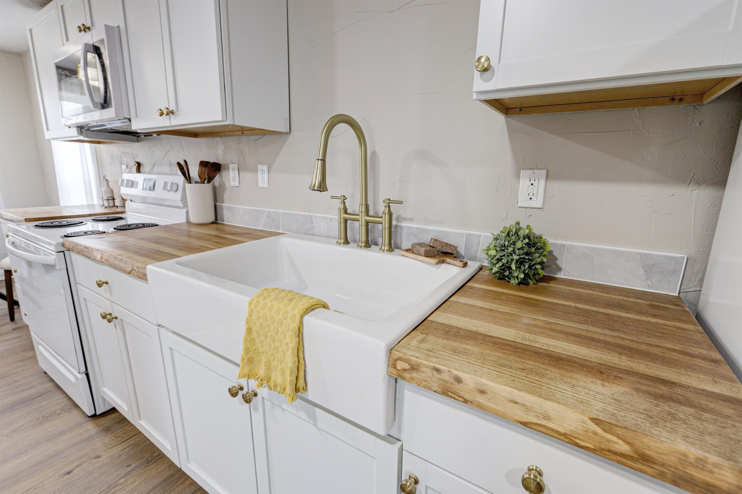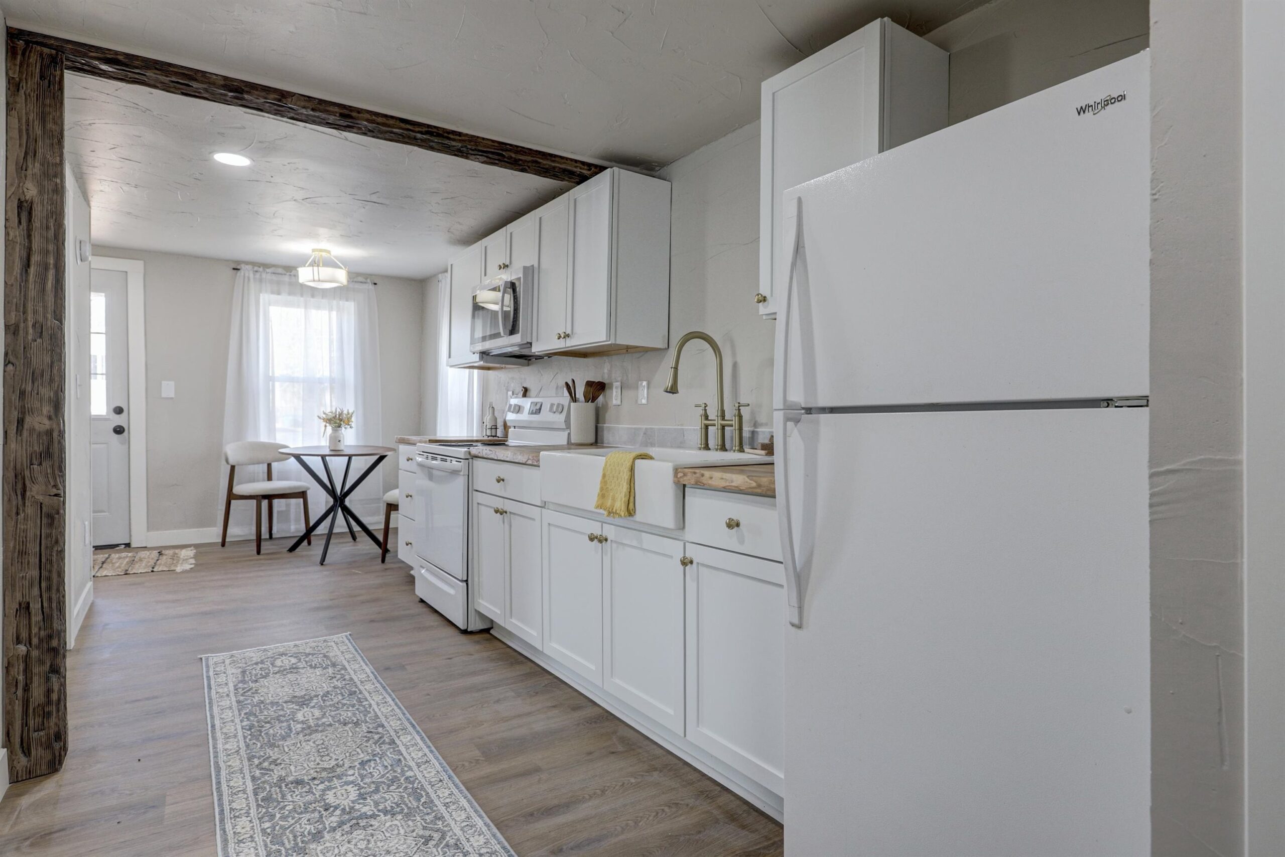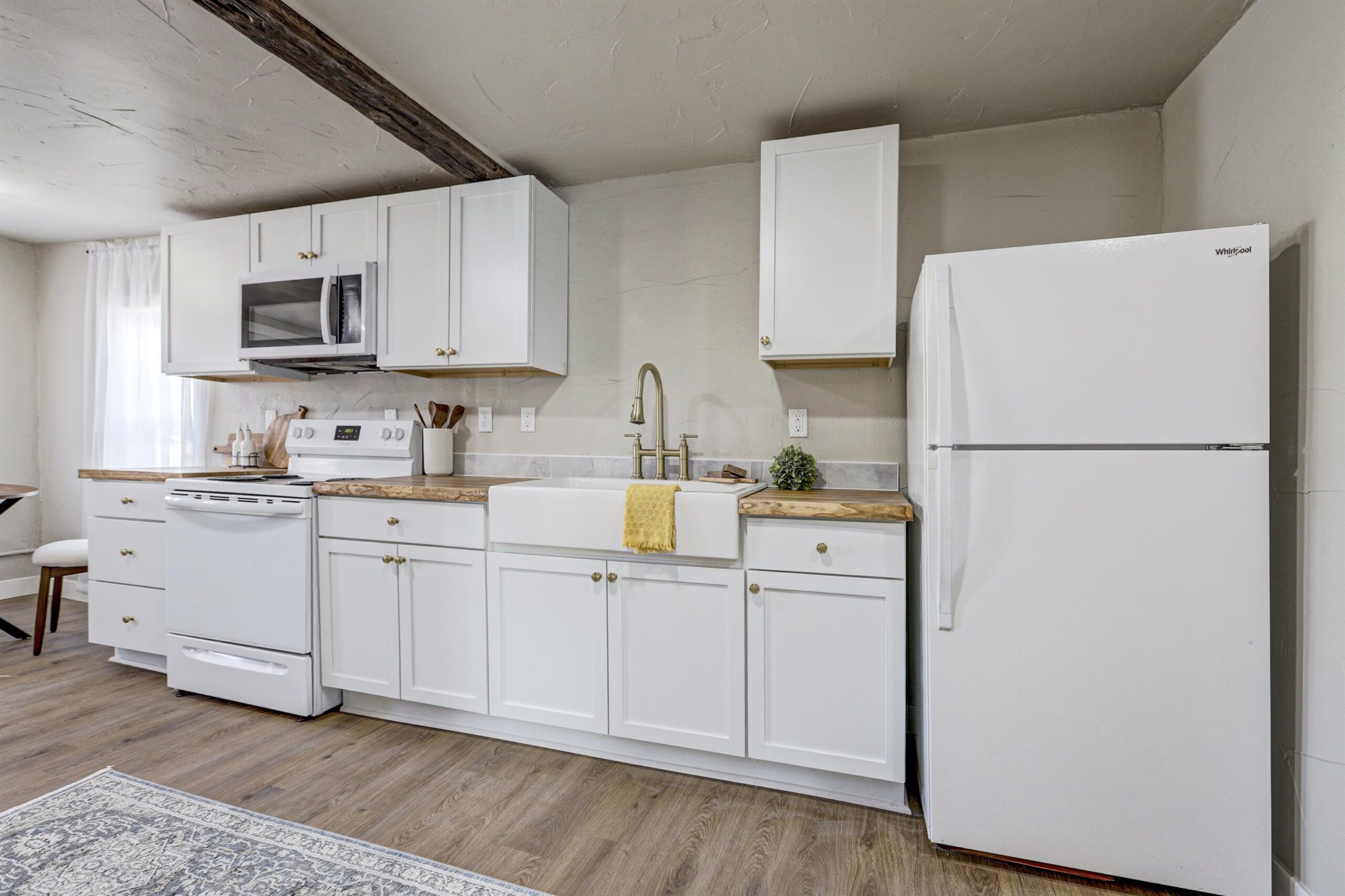 stove/oven, refrigerator, microwave, washer, dryer, garage fridge, window treatments