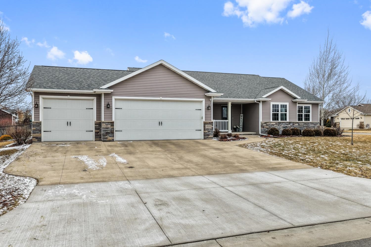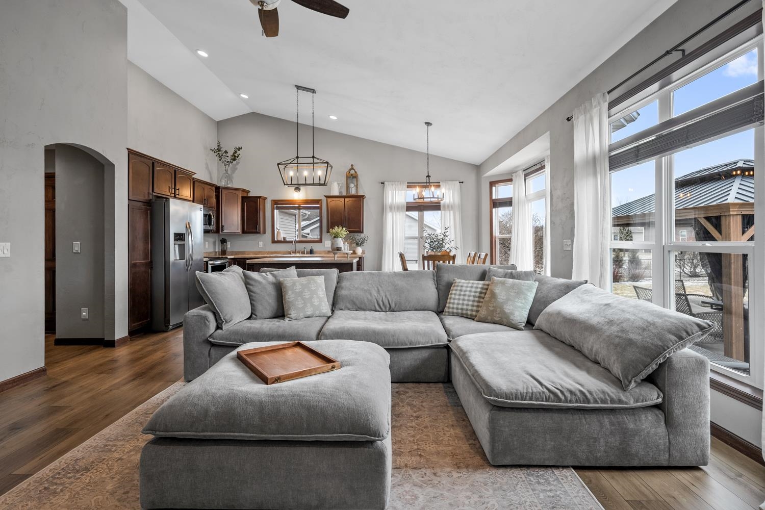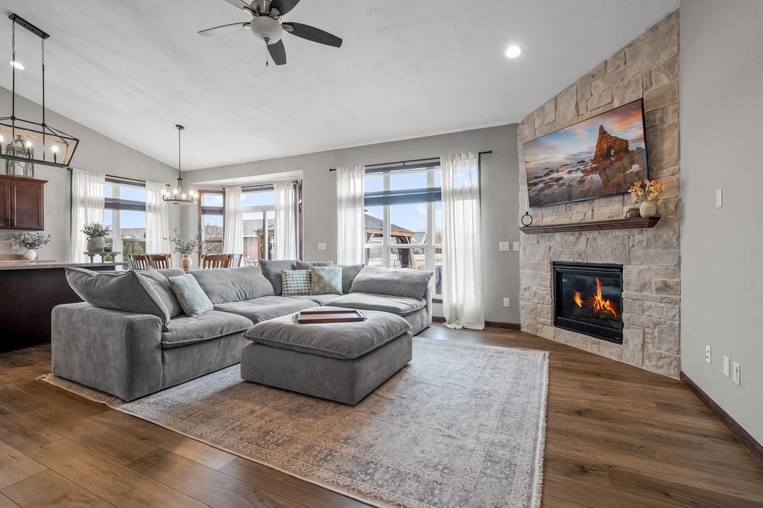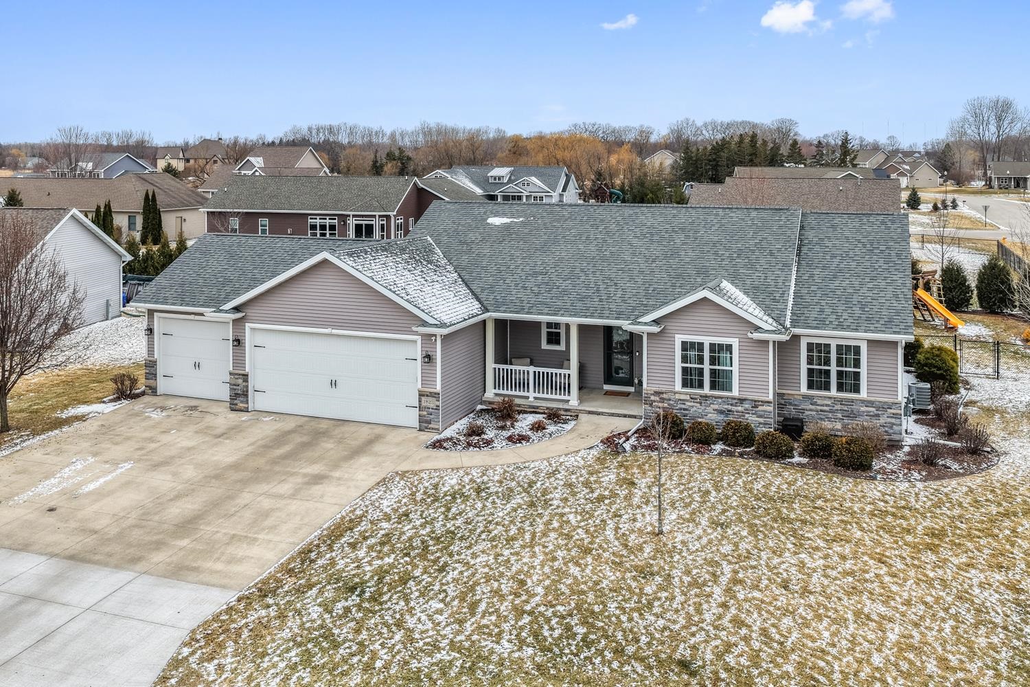Located on a corner lot in a growing community near Liberty Park & Carpenter Preserve, this 4BR/2BA ranch home greets w/open-concept layout featuring segmental arches, cathedral ceilings & all new LVP flooring ('25) throughout main level! LR w/refreshed stone-faced gas FP ('25), display alcoves, transom windows. Fully-equipped kitchen w/snack-counter isle, ss appliances, and dining area w/bumpout & sliding door opening to patio w/pergola ('24) & fenced yard w/playset! Primary bedroom w/twin walk-in closets, vaulted ceiling, dual vanity en-suite w/shower. 1st floor laundry & handy mudroom boasting a newly completed locker area w/storage drawers ('25). LL adds 485 sqft composed of a large fam-room & 4th bedroom w/full egress. 3-stall garage, radon system, must-see! Showings begin on 3/6.
