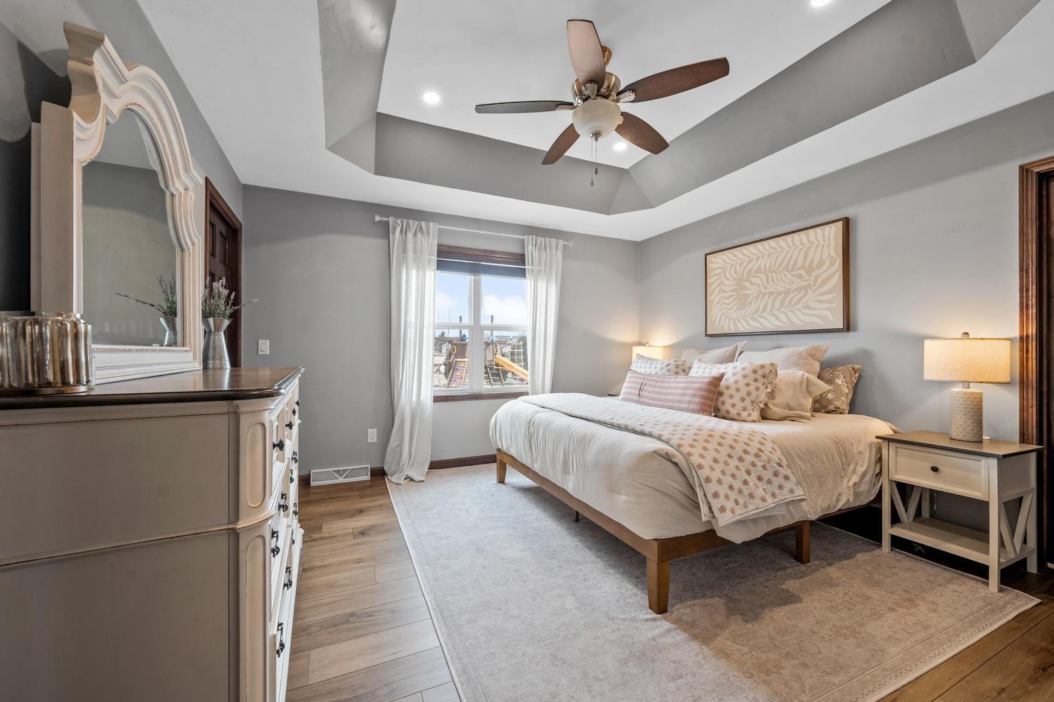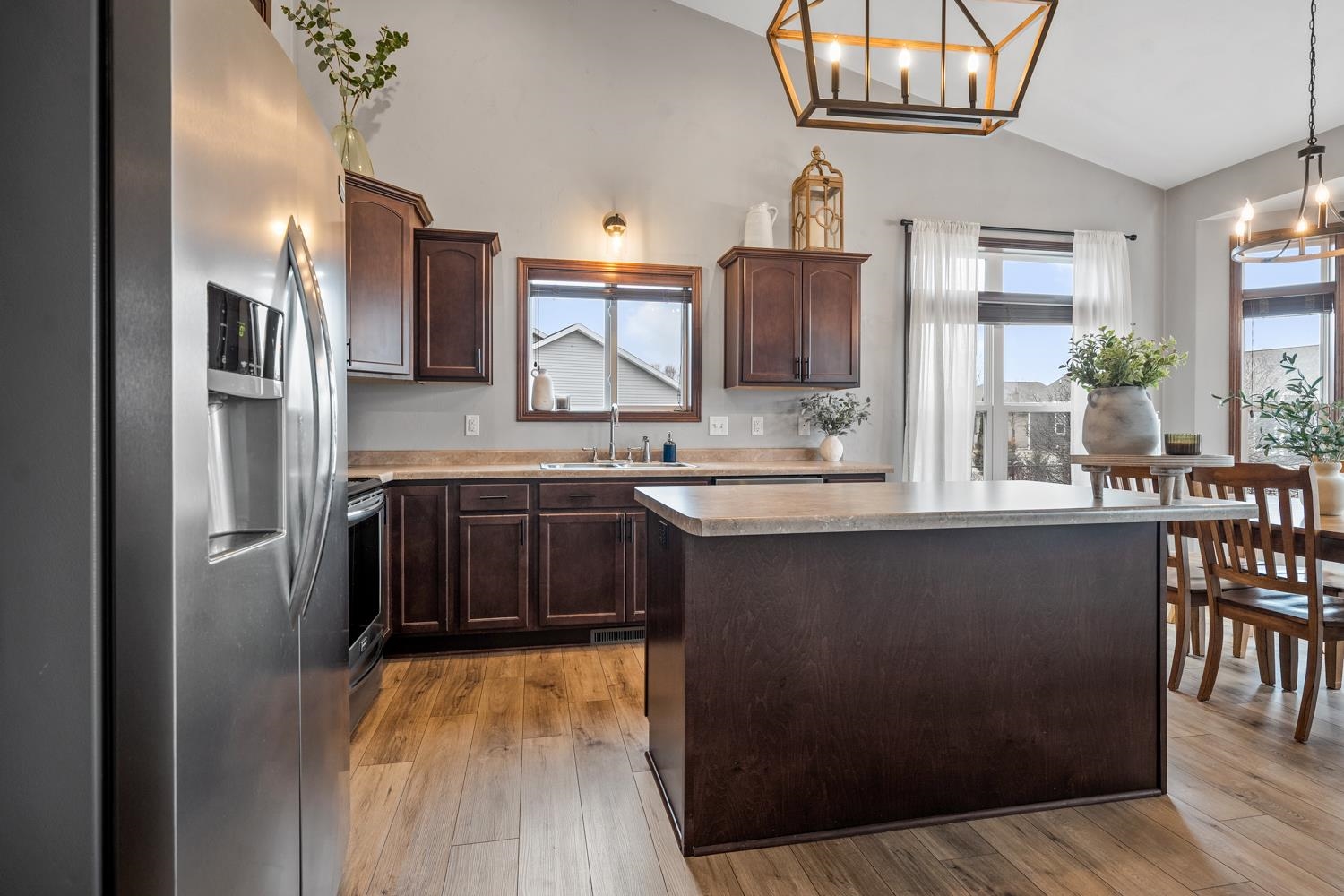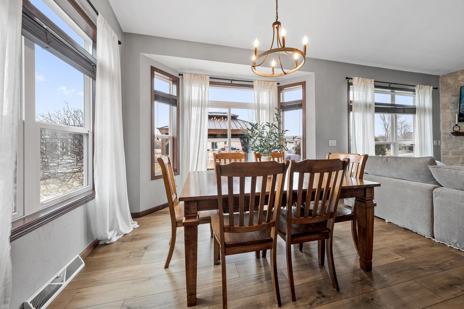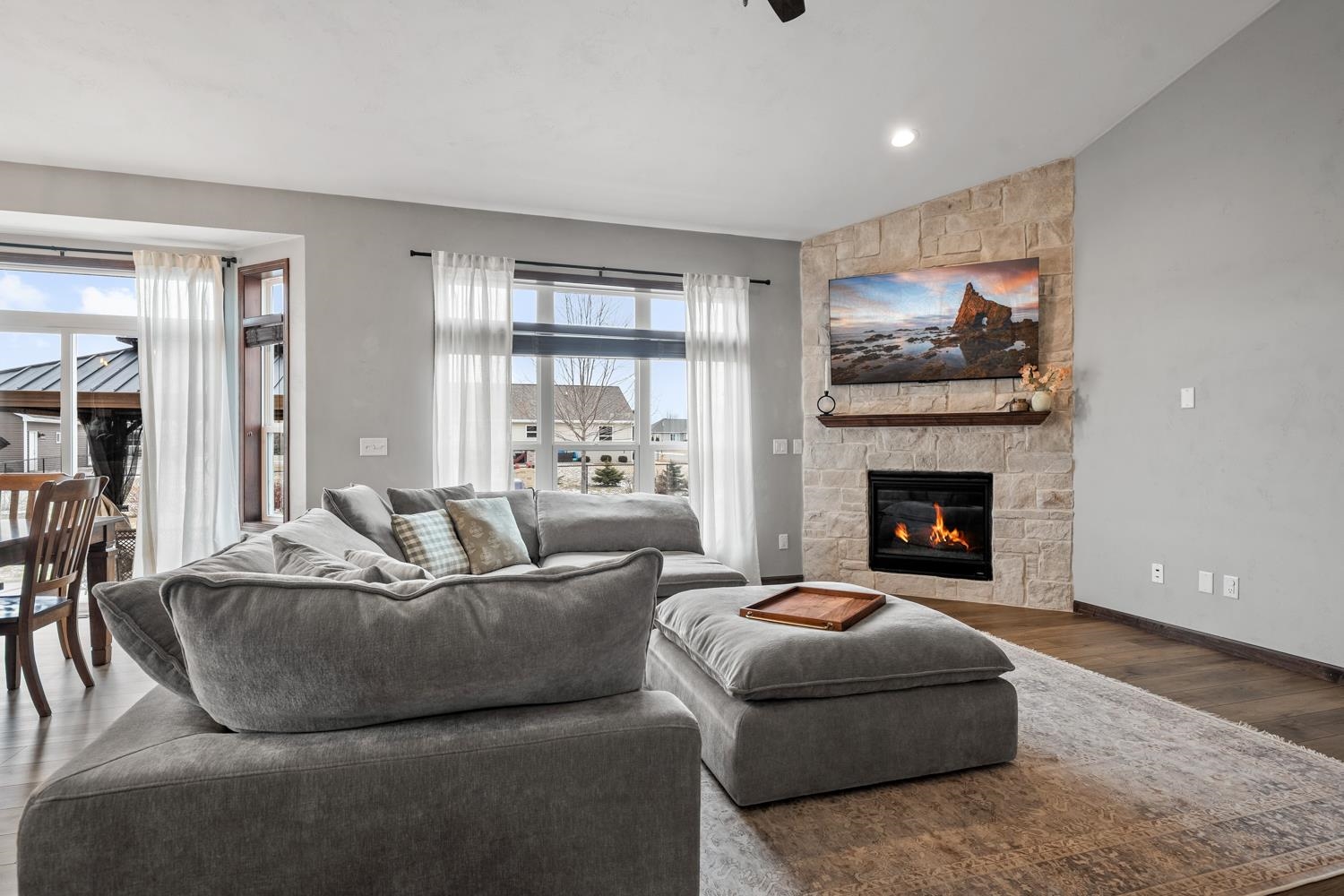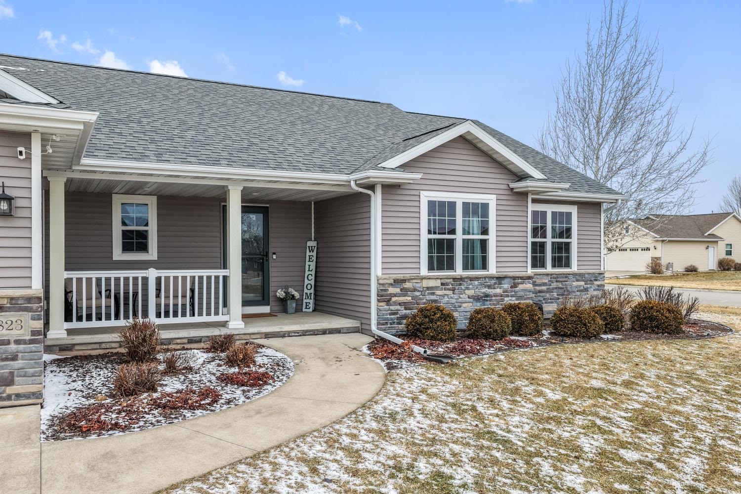 Located on a corner lot in a growing community near Liberty Park & Carpenter Preserve, this 4BR/2BA ranch home greets w/open-concept layout featuring segmental arches, cathedral ceilings & all new LVP flooring ('25) throughout main level! LR w/refreshed stone-faced gas FP ('25), display alcoves, transom windows. Fully-equipped kitchen w/snack-counter isle, ss appliances, and dining area w/bumpout & sliding door opening to patio w/pergola ('24) & fenced yard w/playset! Primary bedroom w/twin walk-in closets, vaulted ceiling, dual vanity en-suite w/shower. 1st floor laundry & handy mudroom boasting a newly completed locker area w/storage drawers ('25). LL adds 485 sqft composed of a large fam-room & 4th bedroom w/full egress. 3-stall garage, radon system, must-see! Showings begin on 3/6.