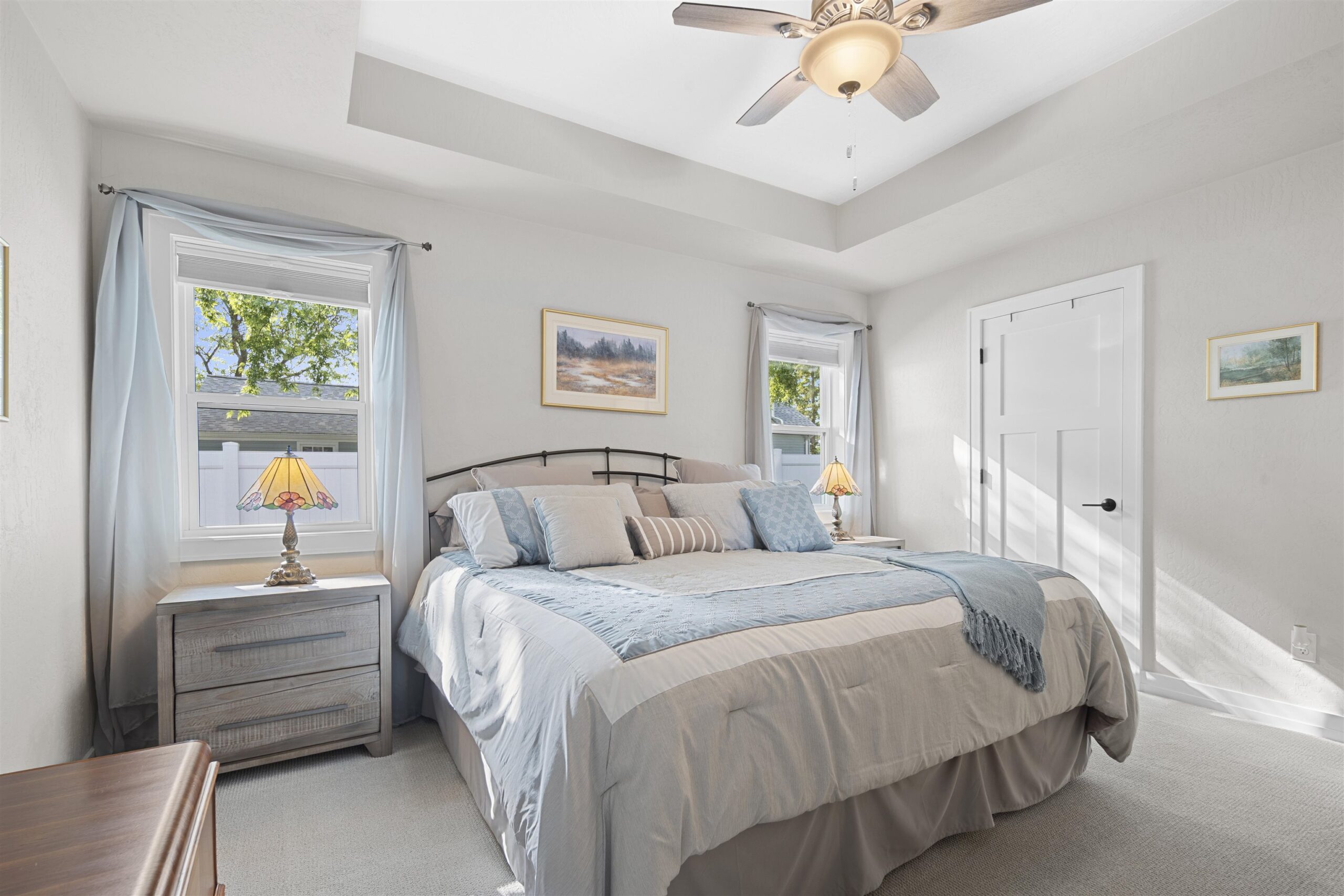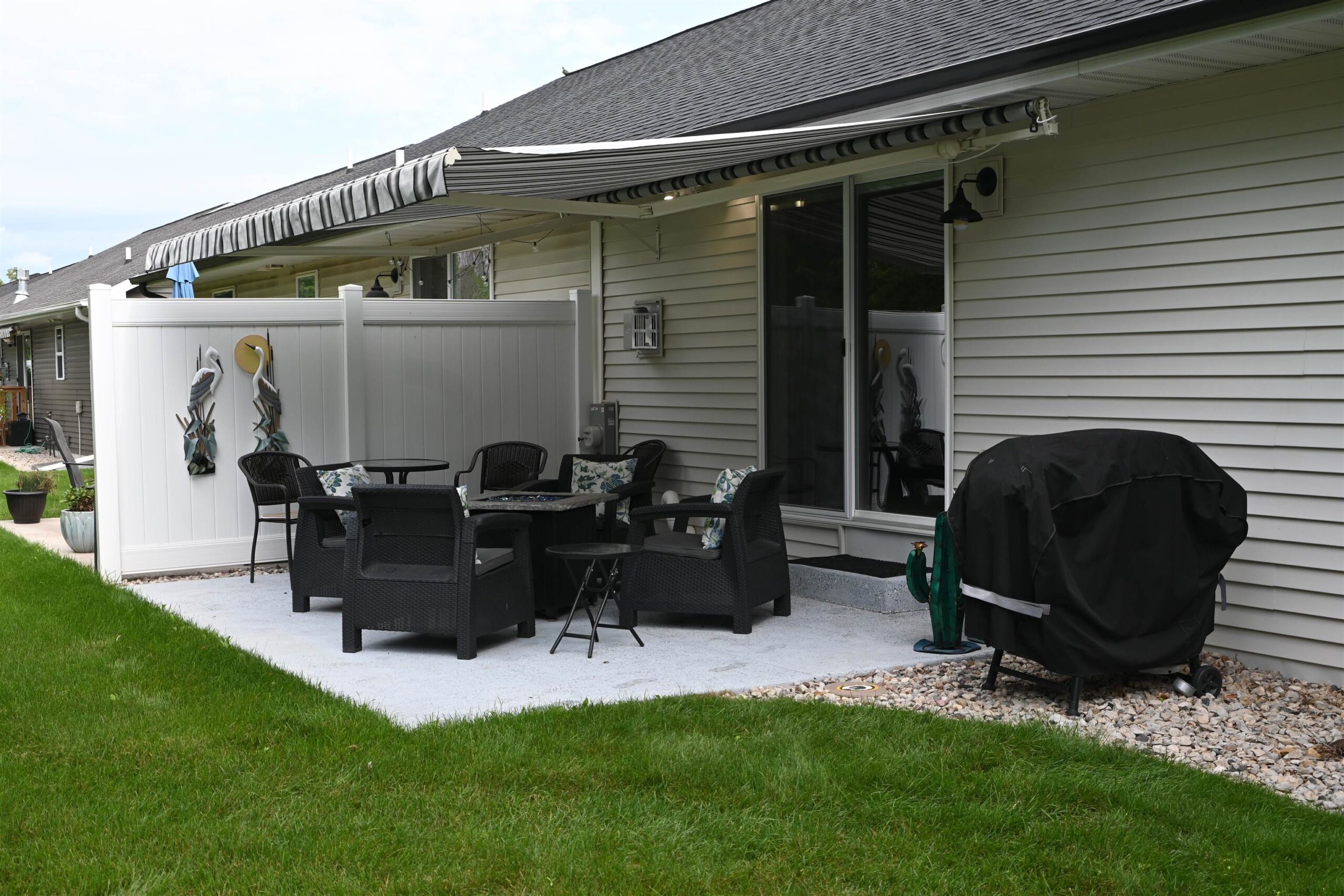Beautiful condo with thoughtful, modern design. This home features a bright, open-concept layout centered around great room with vaulted ceilings and a gas fireplace and a zero-step entry for easy accessibility and first floor laundry. The kitchen boasts hardwood floors, large island, pantry, granite countertops, and tile backsplash, all complemented by smart home functionality for effortless living. The Primary bedroom has a walk-in closet and luxurious bath showcasing a walk-in shower and quartz countertops. . Back entry with bench and an eye-catching stone accent wall. Full basement with egress window and rough-in for a future bath, expanding your usable space. Yard is the largest in the complex, features a remote-controlled awning over patio. Finished garage and lawn irrigation system