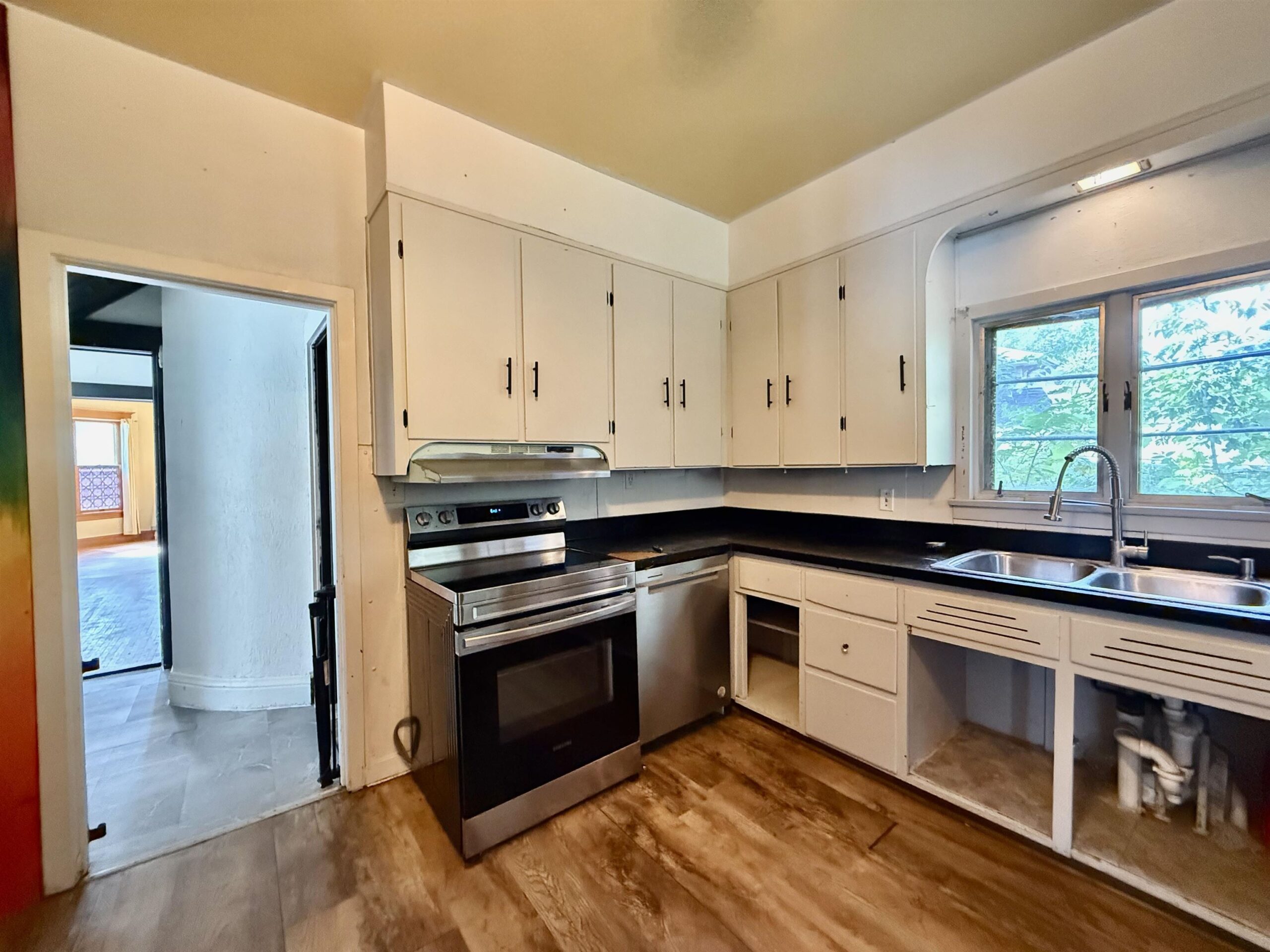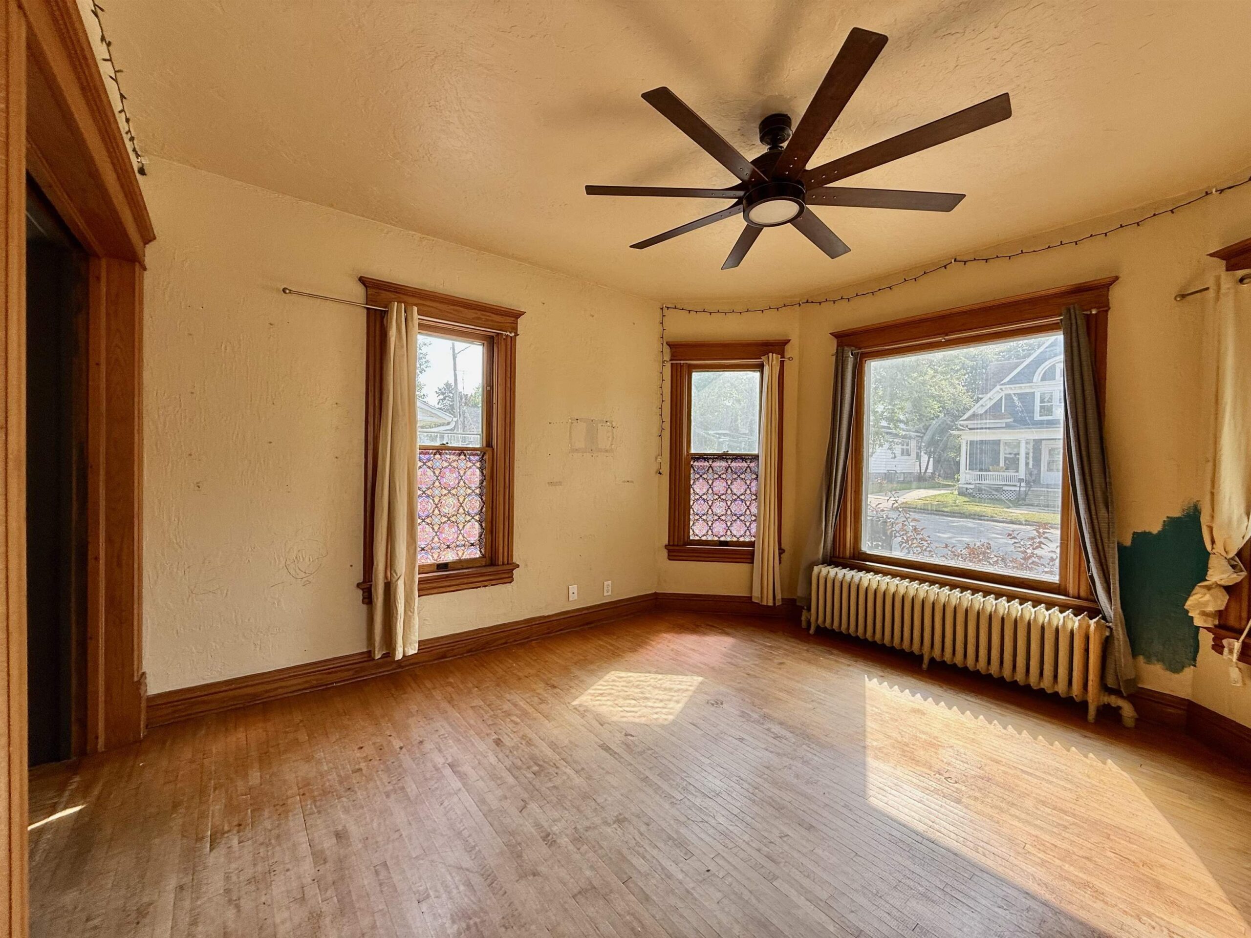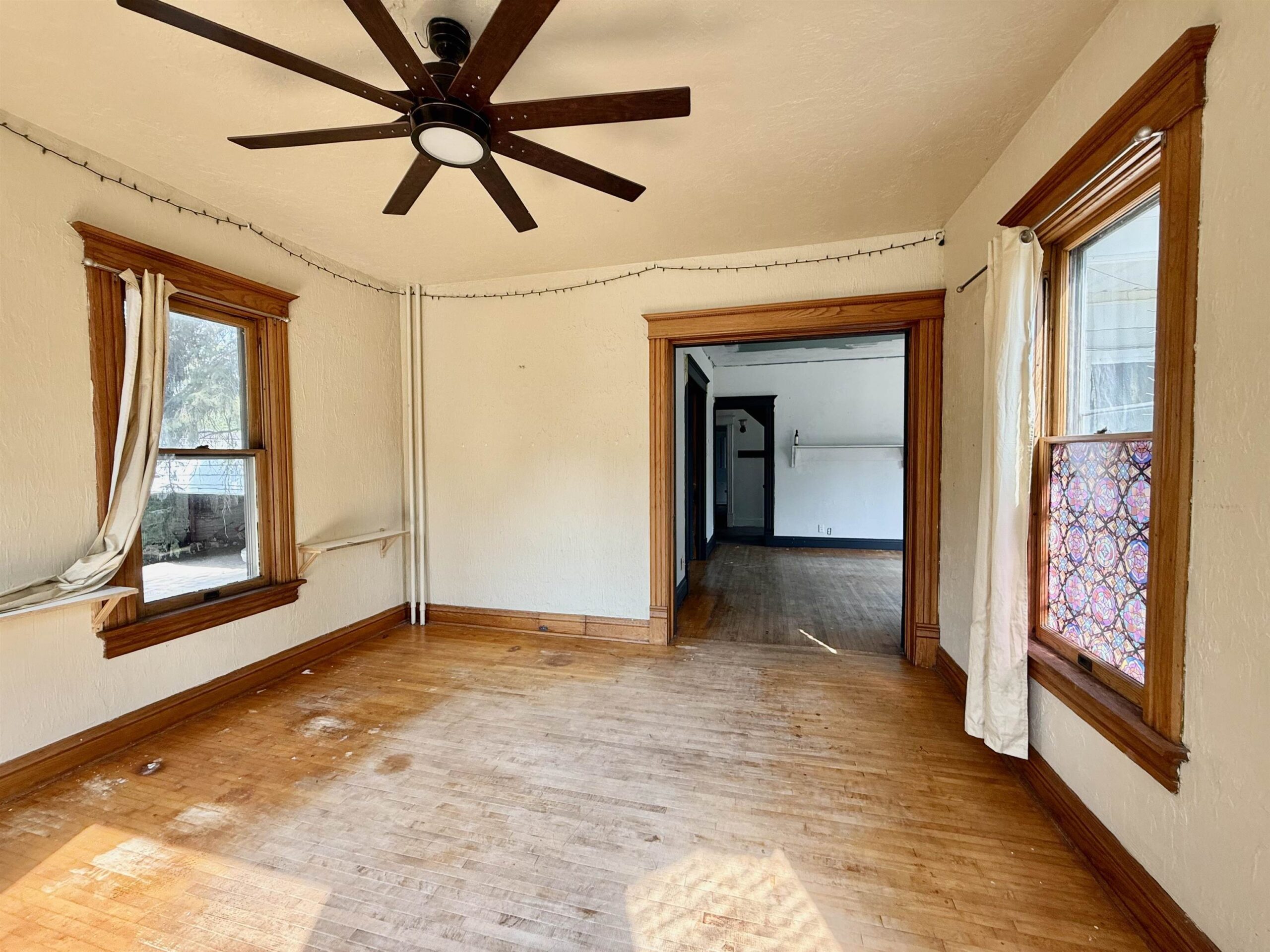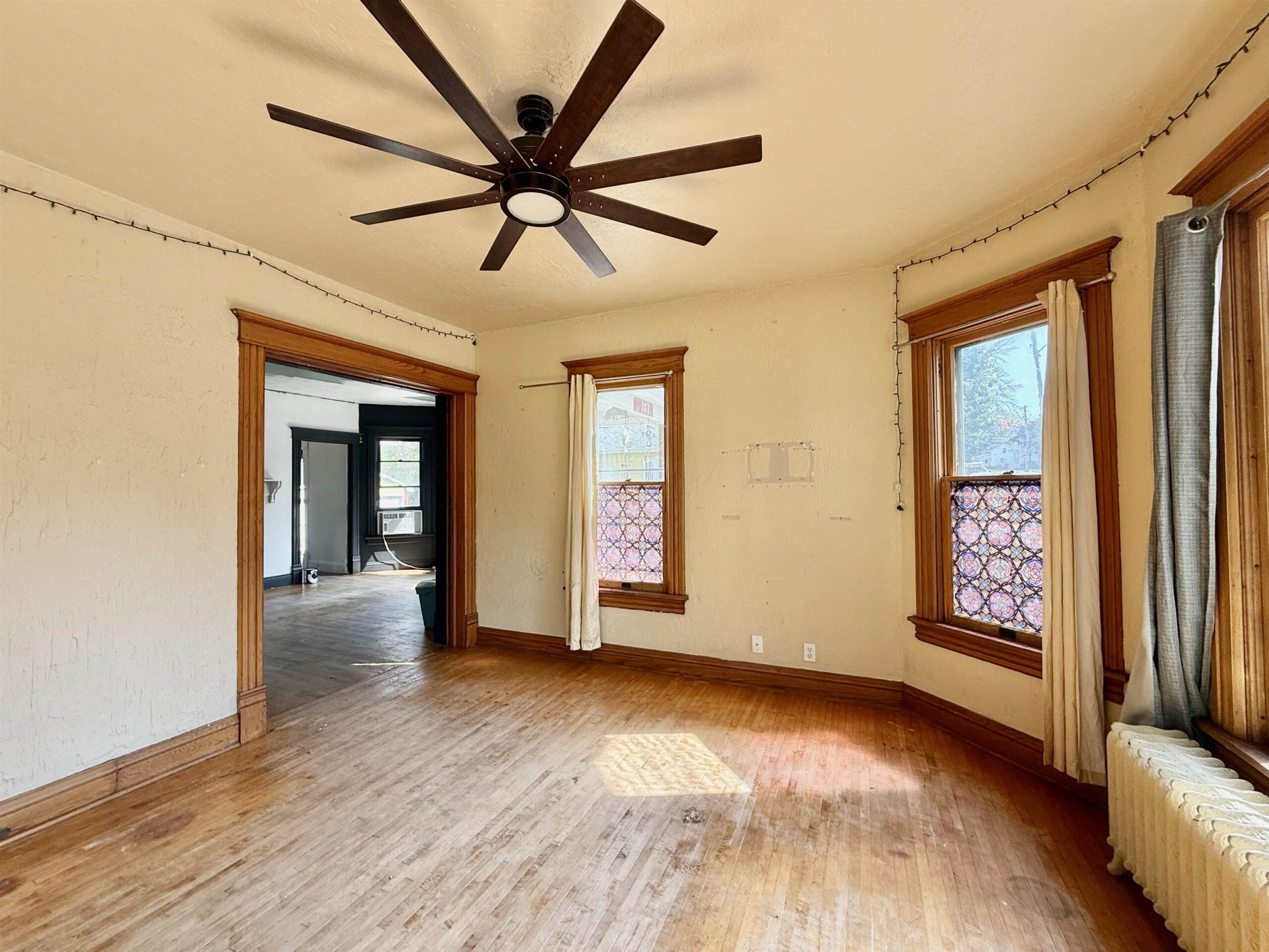 This spacious home is situated on an 0.37 acre, double lot, Conveniently in walking distance to businesses, public schools and parks. Home boasts natural light and has plenty of space throughout. Main level offers Living room, office/den, laundry, formal dining, and kitchen. Up the staircase you have a unique primary bedroom with walk in closet and loft storage, full bath and 3 additional bedrooms. Outside you have a spacious yard, detached 1 car garage and detached 3 car garage. Additional fenced in area too. Home is in need of updates and repairs. Being sold “as is” Bring your ideas and restore the beauty and character and beauty that lies beneath (There are pocket doors).