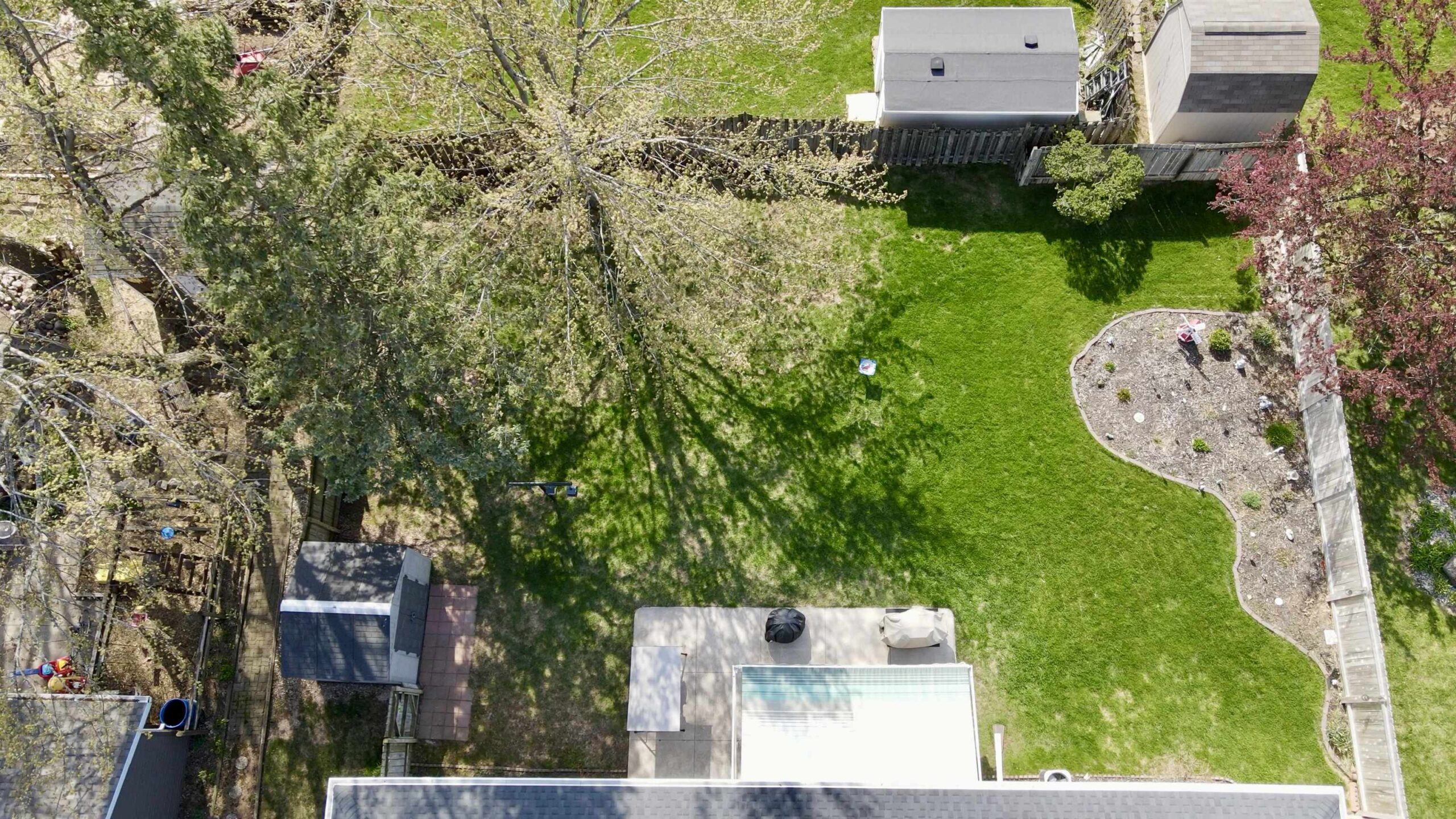 Lawn mower, snow blower, yard decor, grill, fire pit, swing, metal shelves in garage, and wooden shelves in lower level.