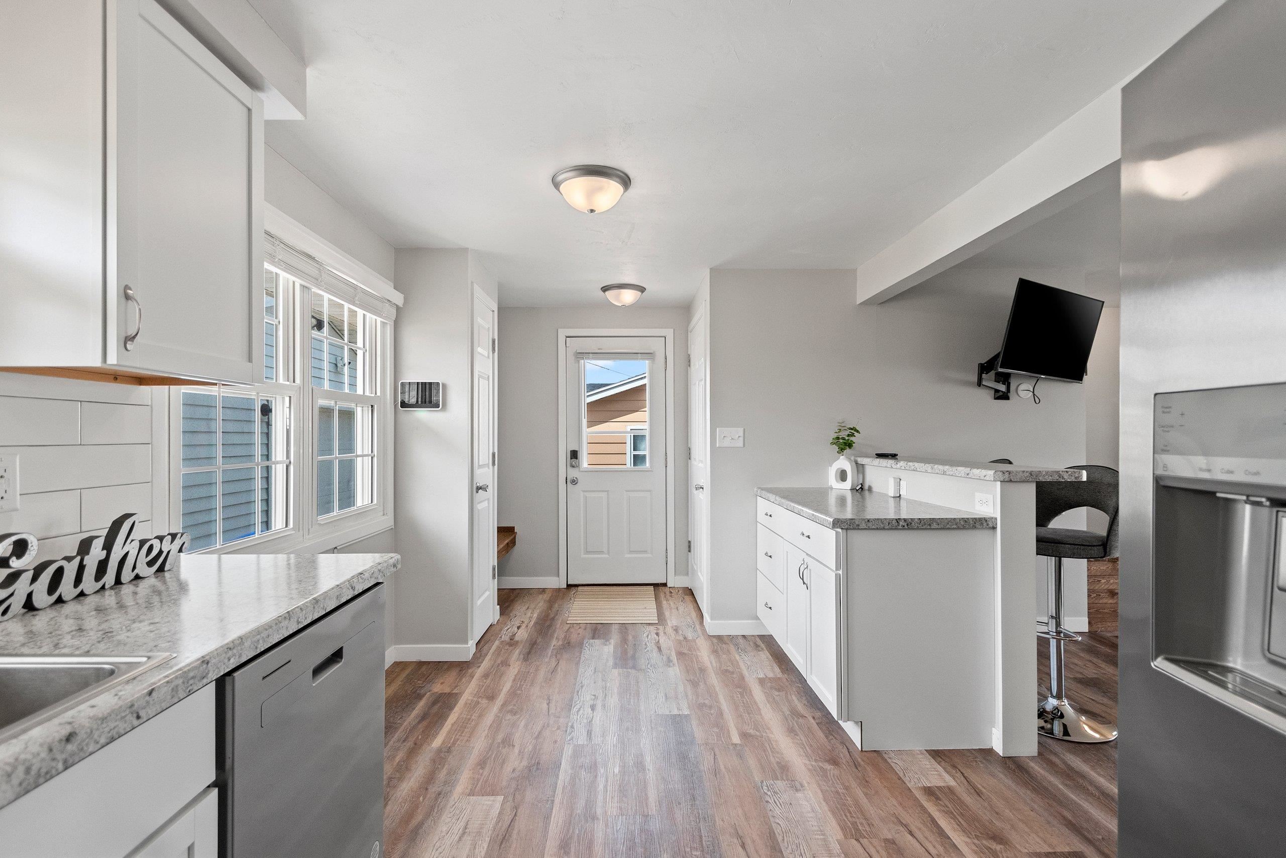 Microwave, range/oven, refrigerator, dishwasher, blinds, security system, TV
