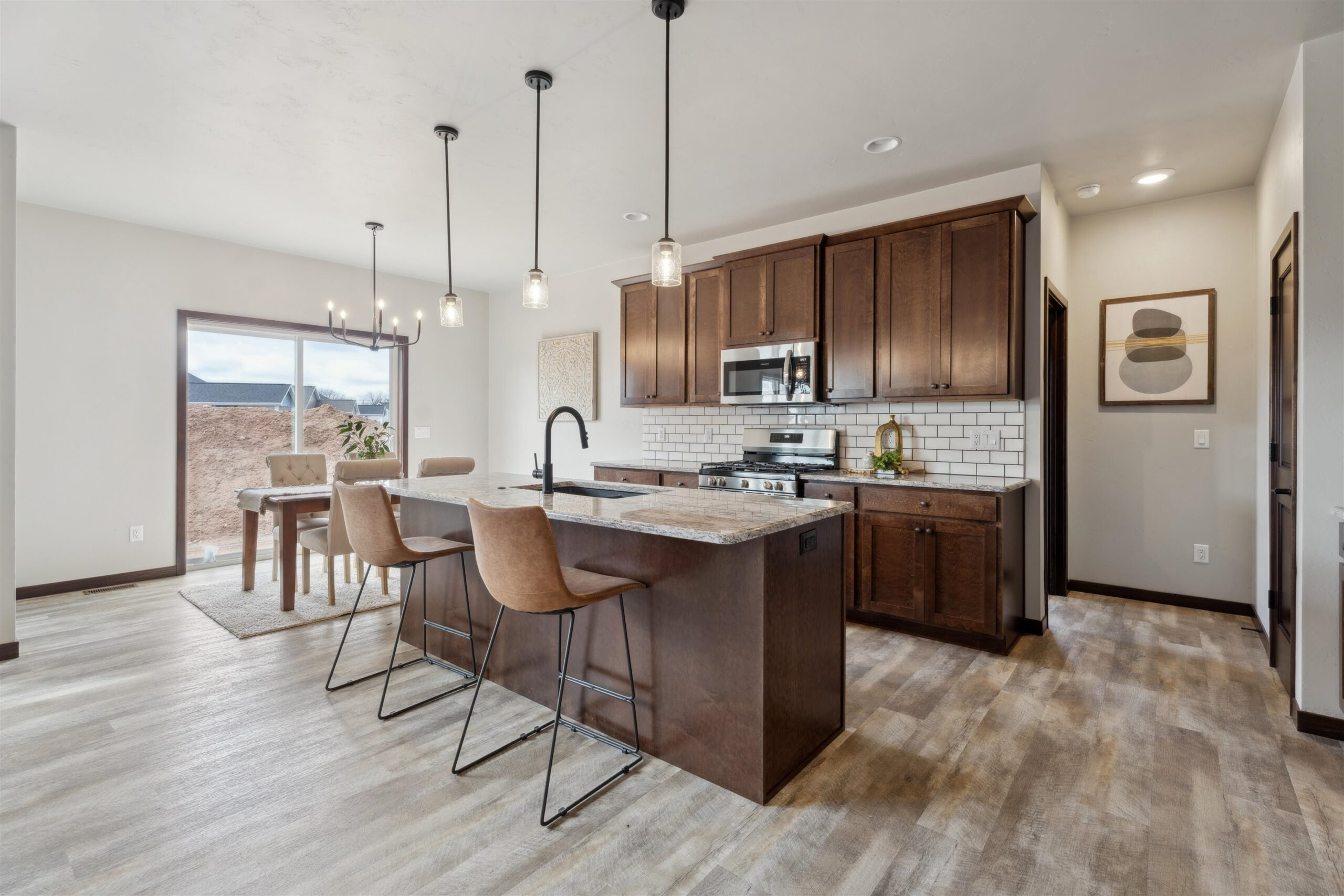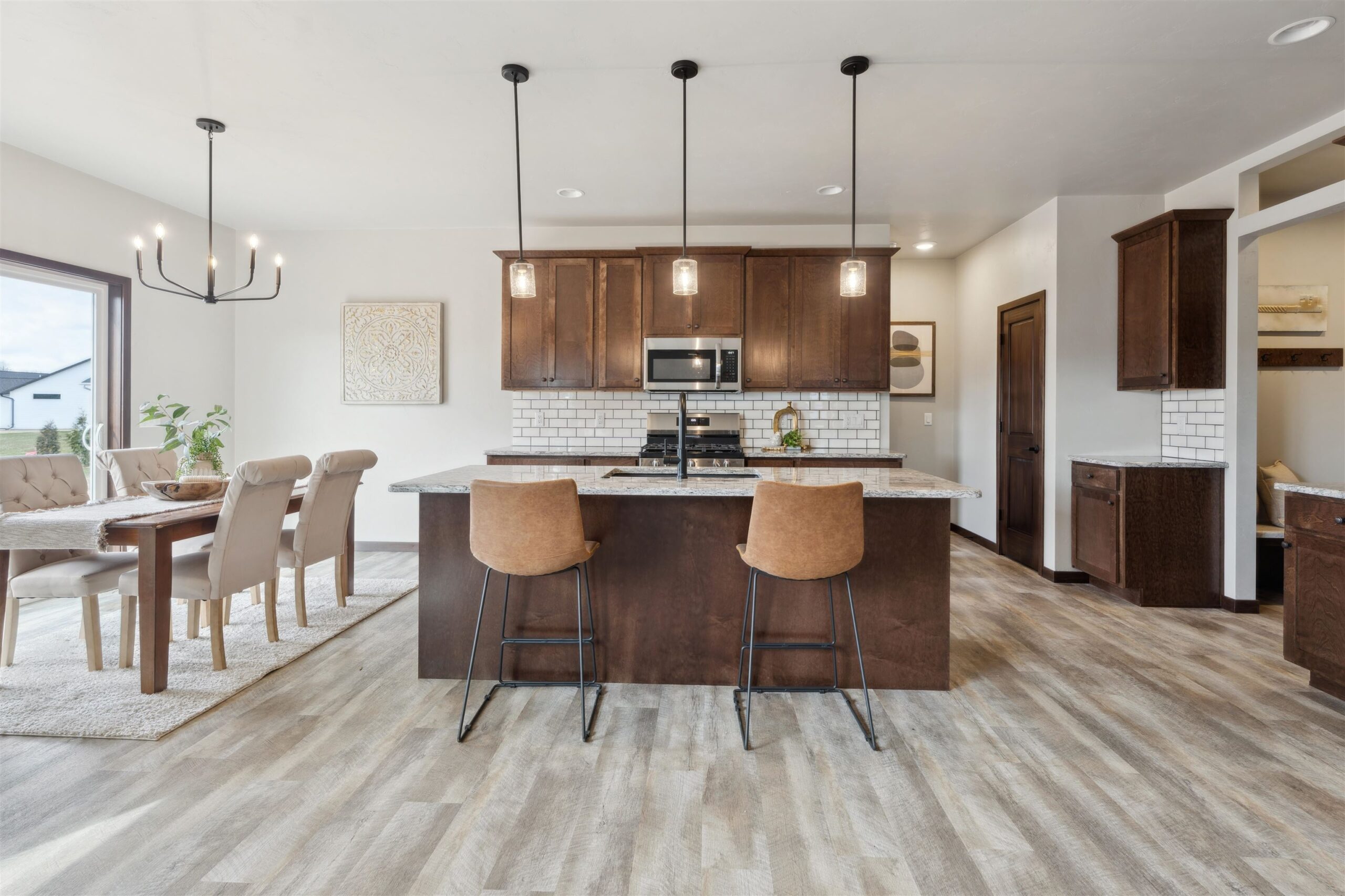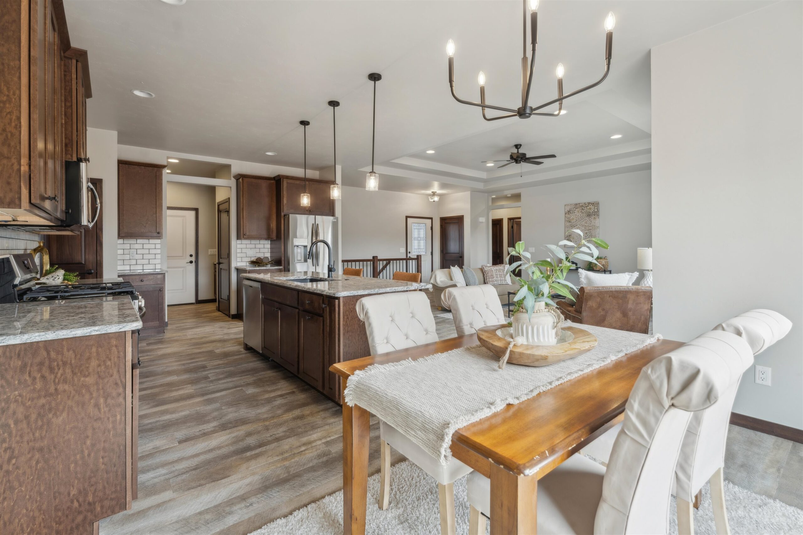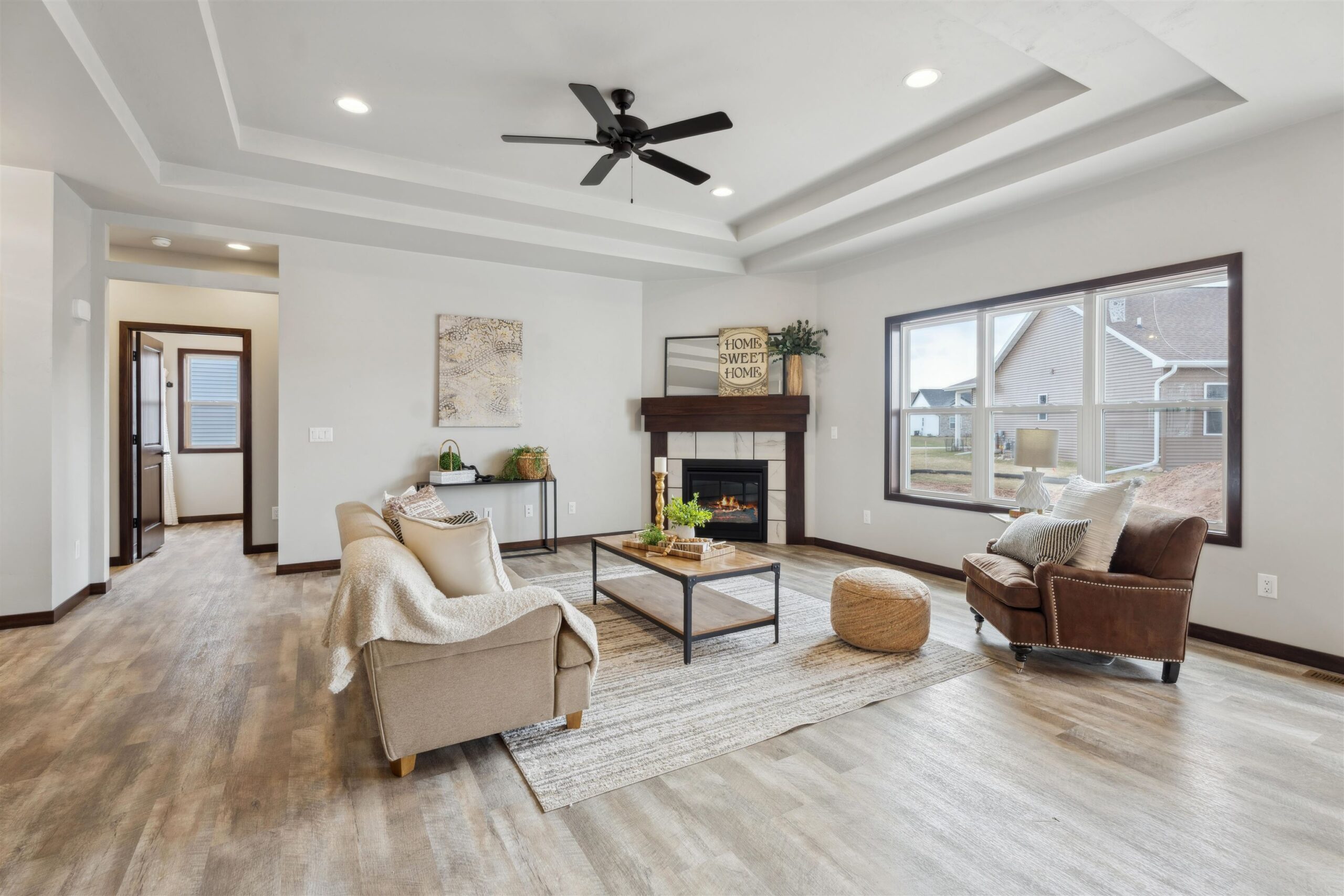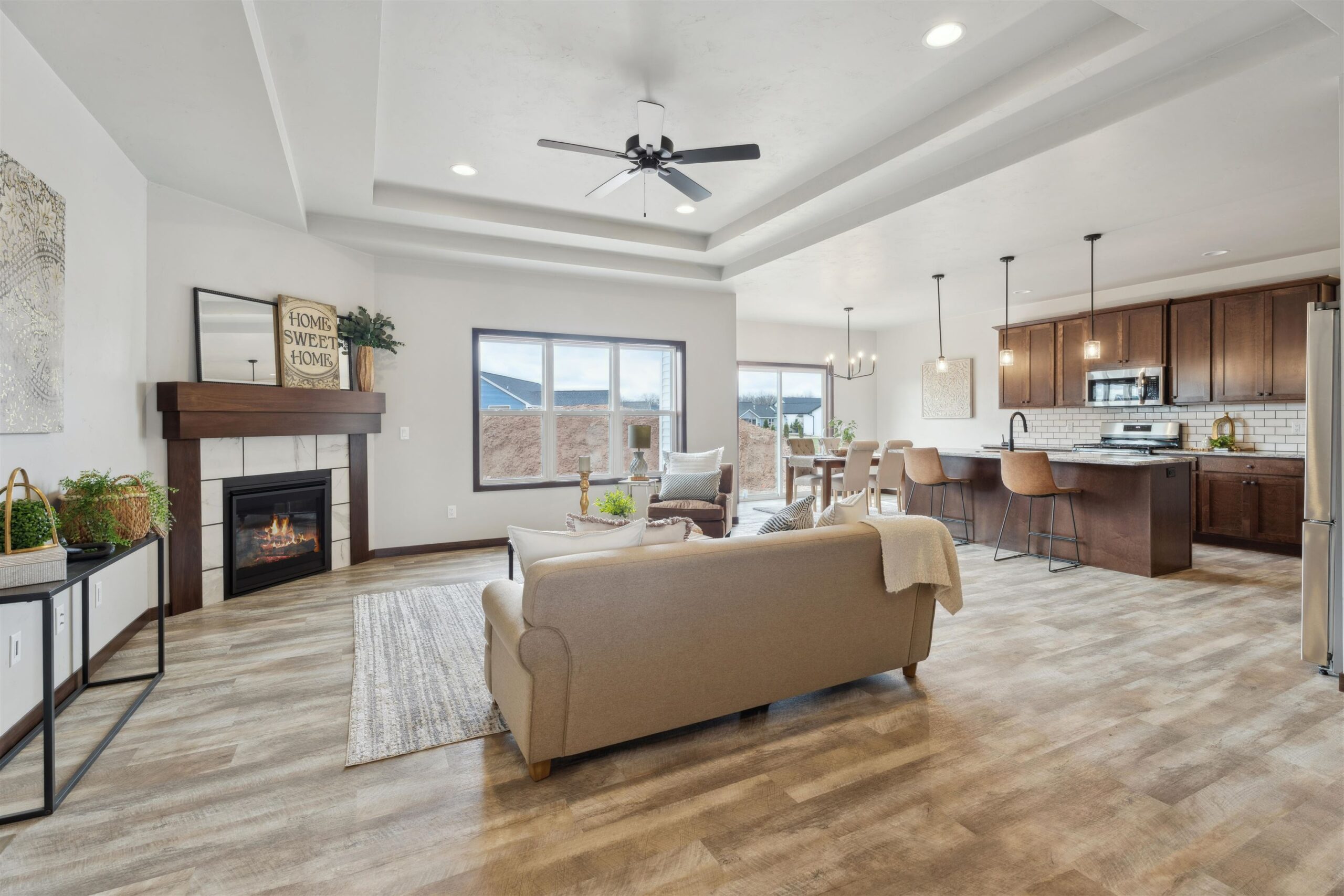 Be the first to live in this beautiful newly constructed split bedroom ranch home. Located in a great subdivision conveniently located in the Village of Fox Crossing. Walk into the living room with a double tray ceiling, fireplace & transom windows looking out over the patio. Spacious kitchen with large center island, granite countertops, pantry, full appliance package & dining area. The mudroom has a drop area, locker area, closet and separate laundry room. Primary bedroom has a huge walk-in closet & double sink vanity. Two other generous sized bedrooms and a full bath balance out the rest of the first floor. Need more space? The lower level is ready to be finished off with egress windows & stubbed for a full bath. attached 3 car garage w/basement access.