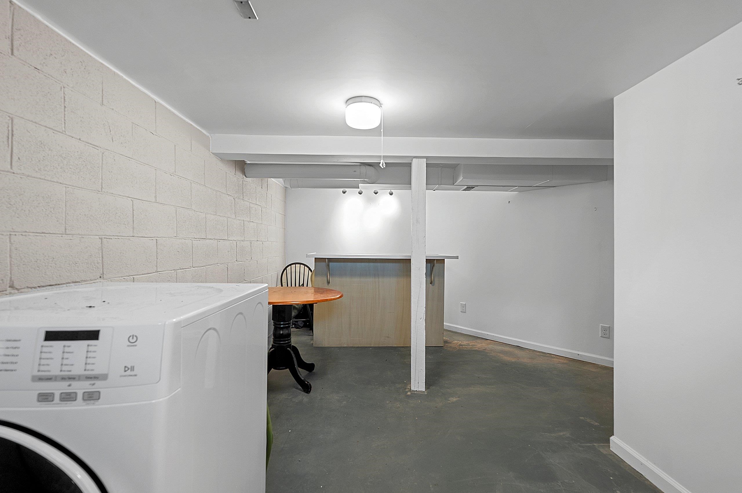Stove, table with four chairs, bar & wooden table in basement