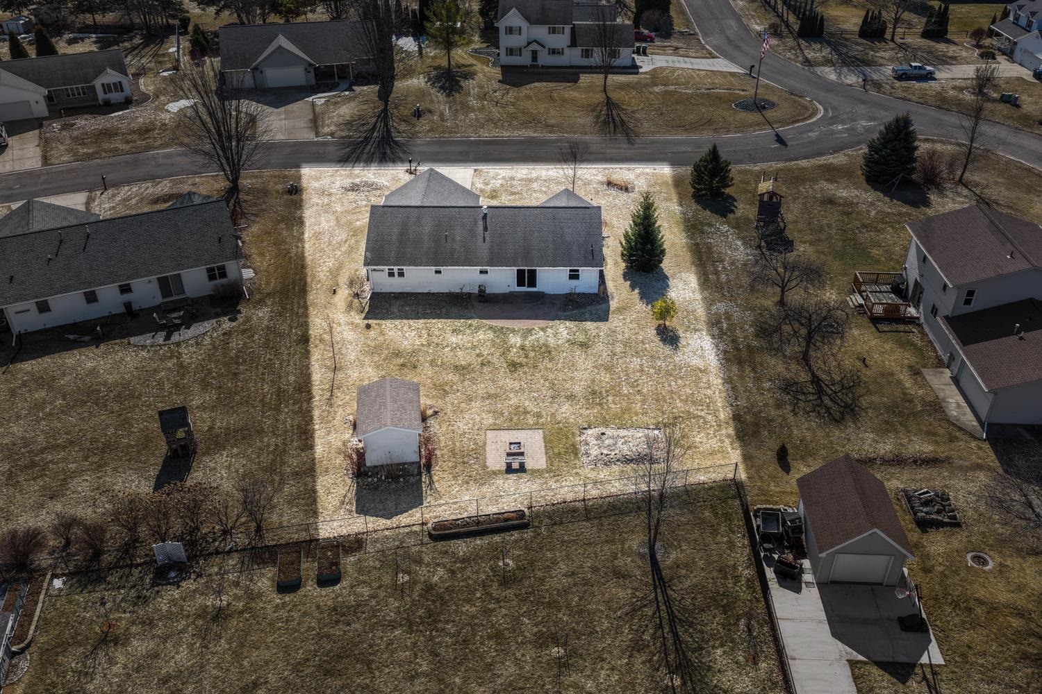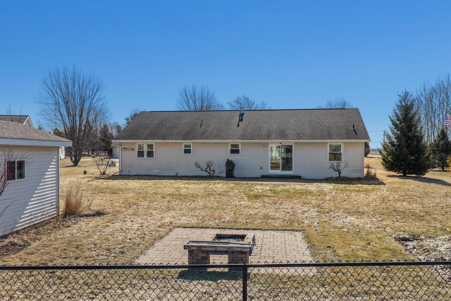 Charming 3BR/2BA ranch near Royal Scot GC greets w/ cathedral ceilings, popular split-bedroom floorplan, 1st floor laundry w/ included washer+dryer! LR w/ gas fireplace & chicago window, kitchen w/ mosaic backsplash, appliances & peninsula seating. Sliding door opens from dining area to paver patio & back-yard w/ matching firepit & shed w/ rolling O/H door. Primary bedroom w/ twin closets & full en-suite w/ shower. Opposite, bedrooms 2 & 3 share a 2nd full bath. LL boasts over 685 sqft composed of a large rec room & game room. 2.5 stall garage, very well-kept!