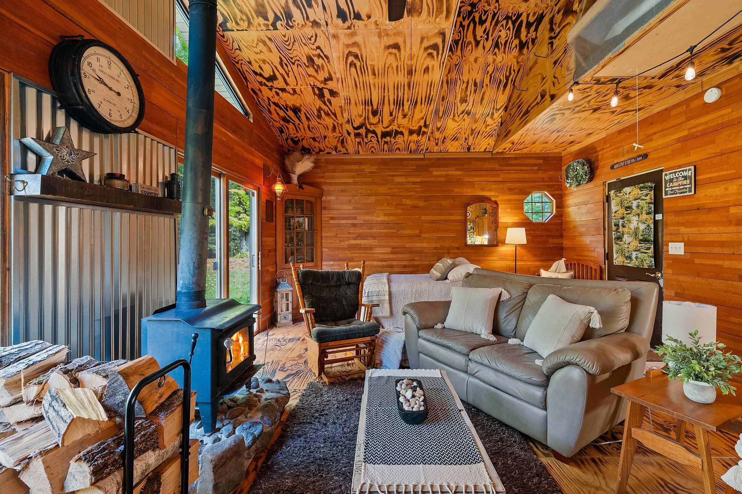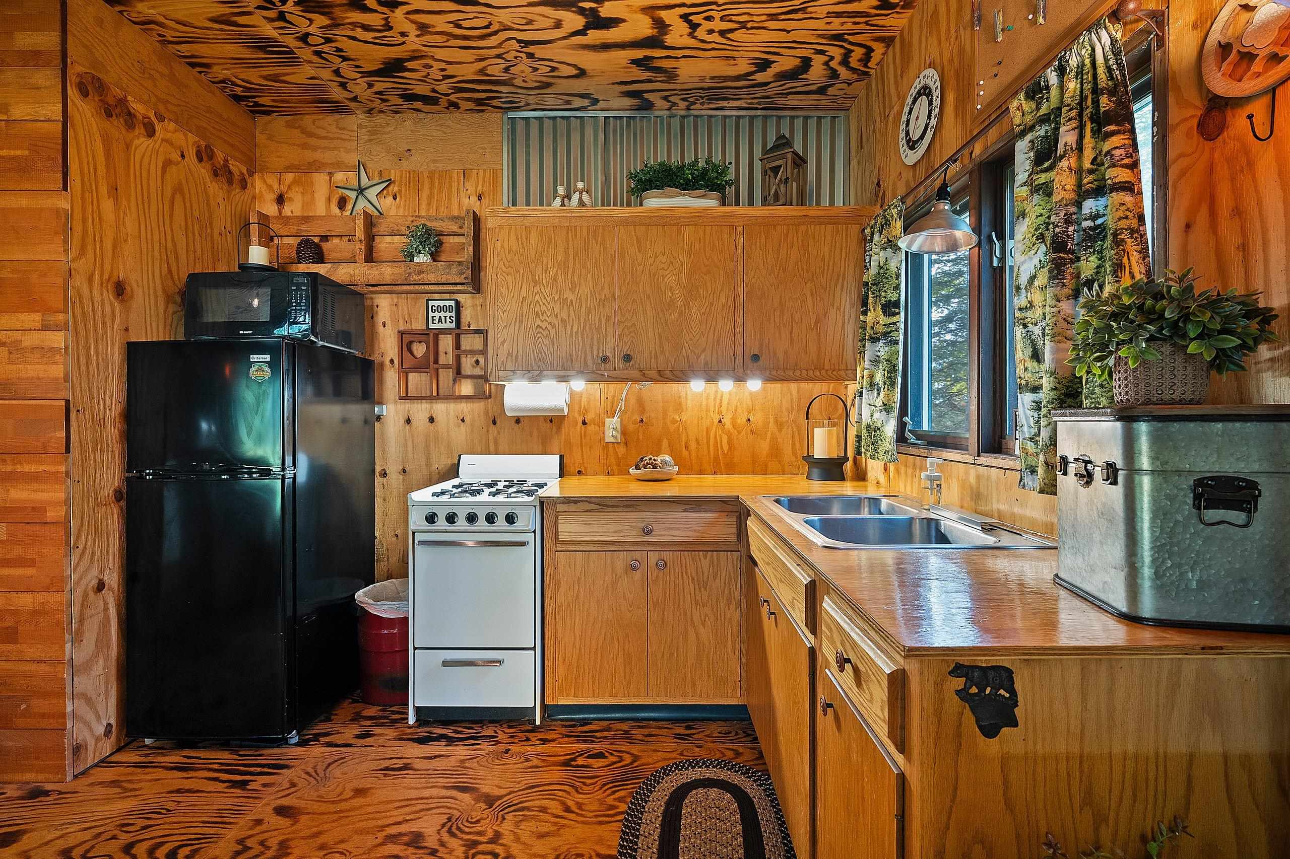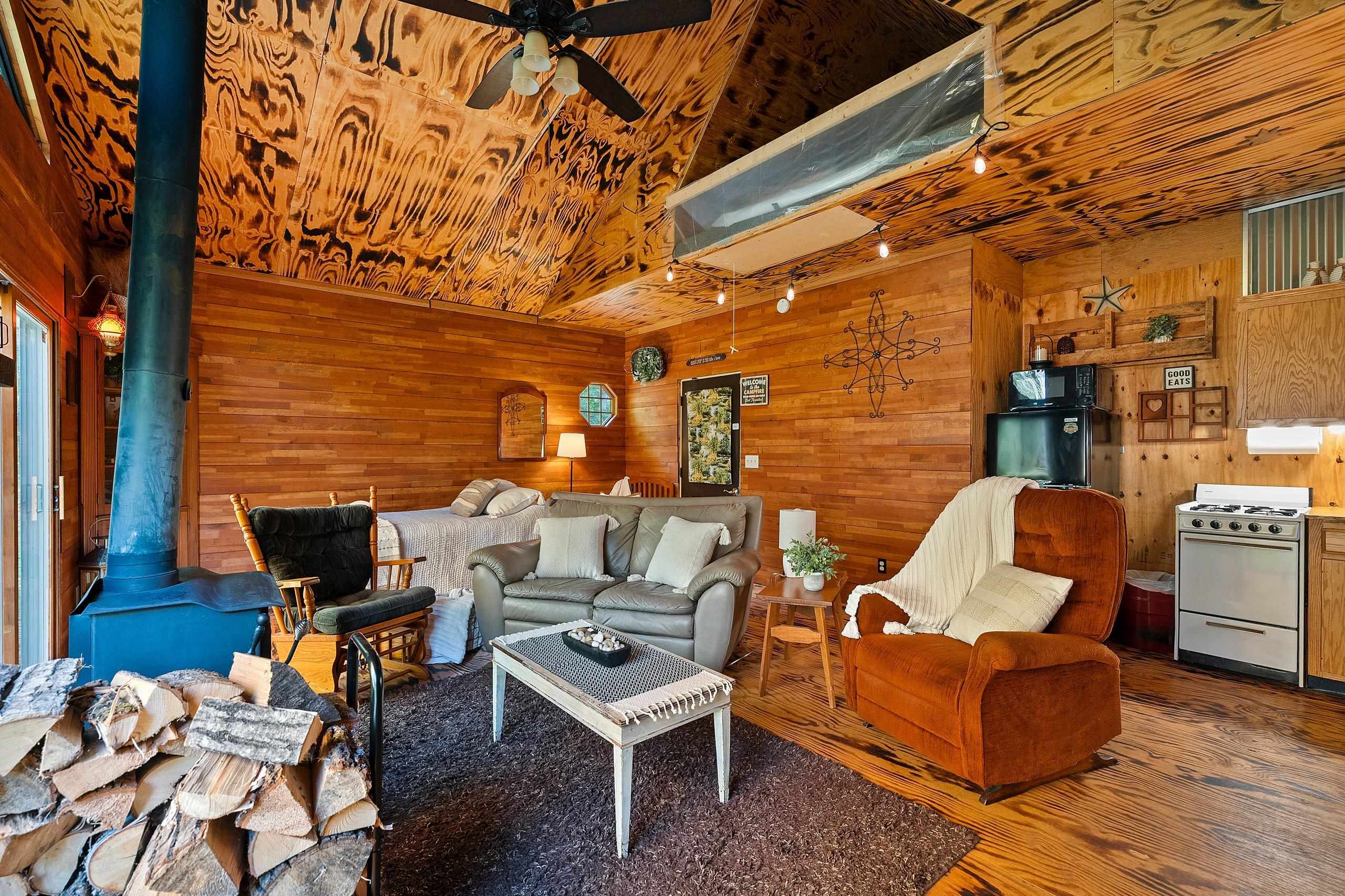 electric fireplace, wood stove, Refrigerator, Stove, Microwave, Most Furnishings, wood shed, outhouse, firepit