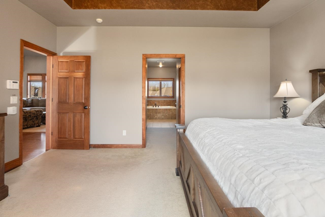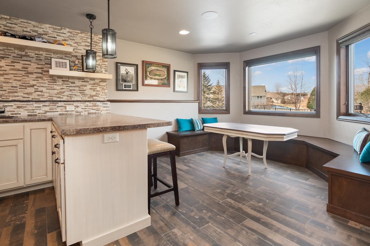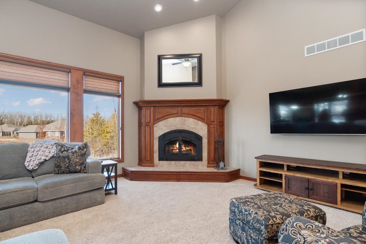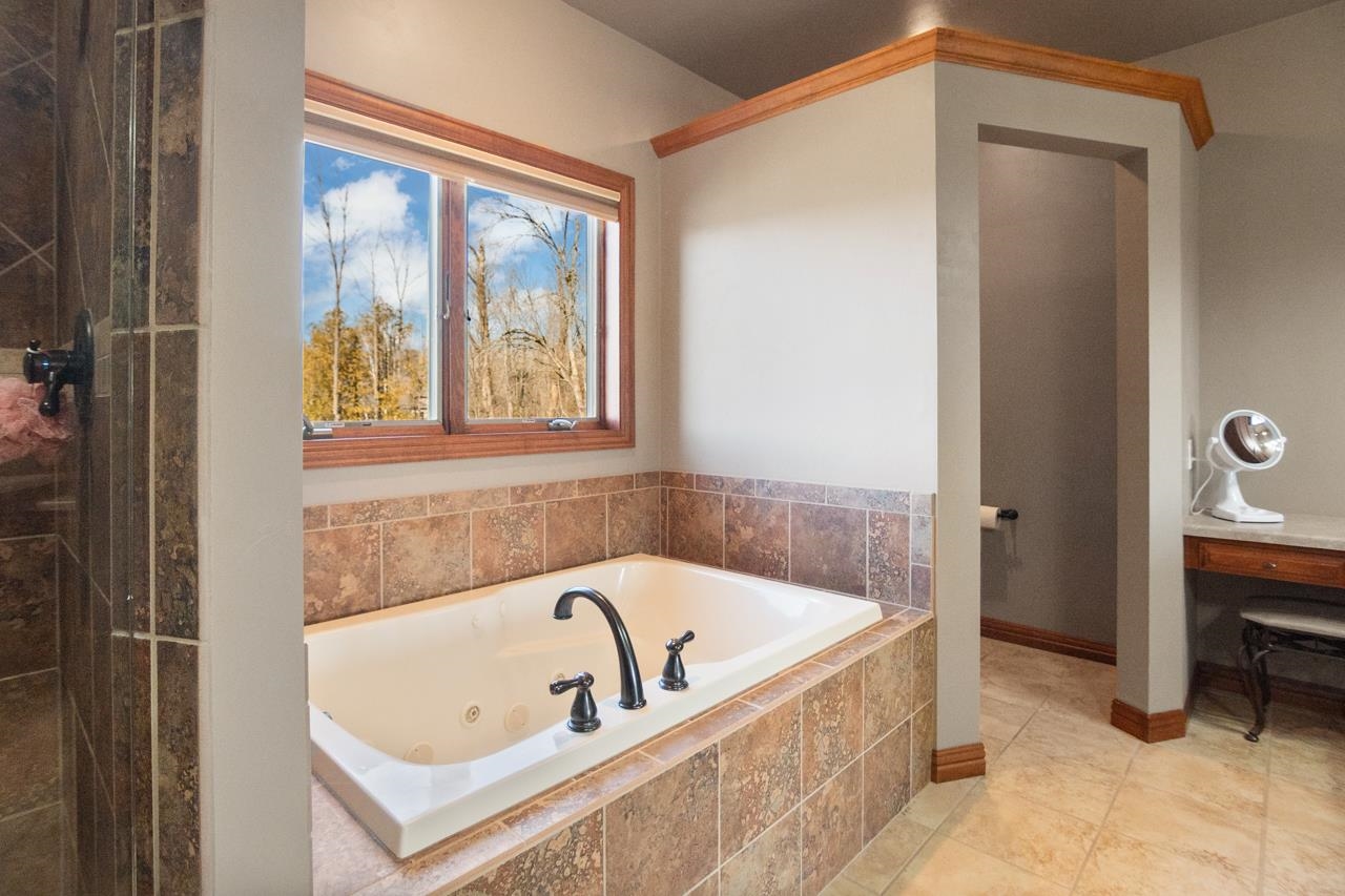 This home checks all the boxes! Quality built 4 bedroom home on a quiet cul-de-sac in desirable neighborhood. First floor primary suite with dual closets and spacious bathroom with tiled walk-in shower, jetted tub and dual vanities. Updated kitchen with newer cabinets, quartz countertop and backsplash. Great room with wood fireplace,Office/den with hw floors. First floor laundry. Built-in lockers. Two of the bedrooms upstairs have their own private full bathroom. Spacious bonus room with walk-in closet can be used for a bedroom or a rec room! Walkout lower level is perfect for entertaining. Theatre room, game room, full bath and wet bar! Covered porch overlooking in ground pool, hot tub, and storage shed. 3.5 stall garage with stairs to lower level.