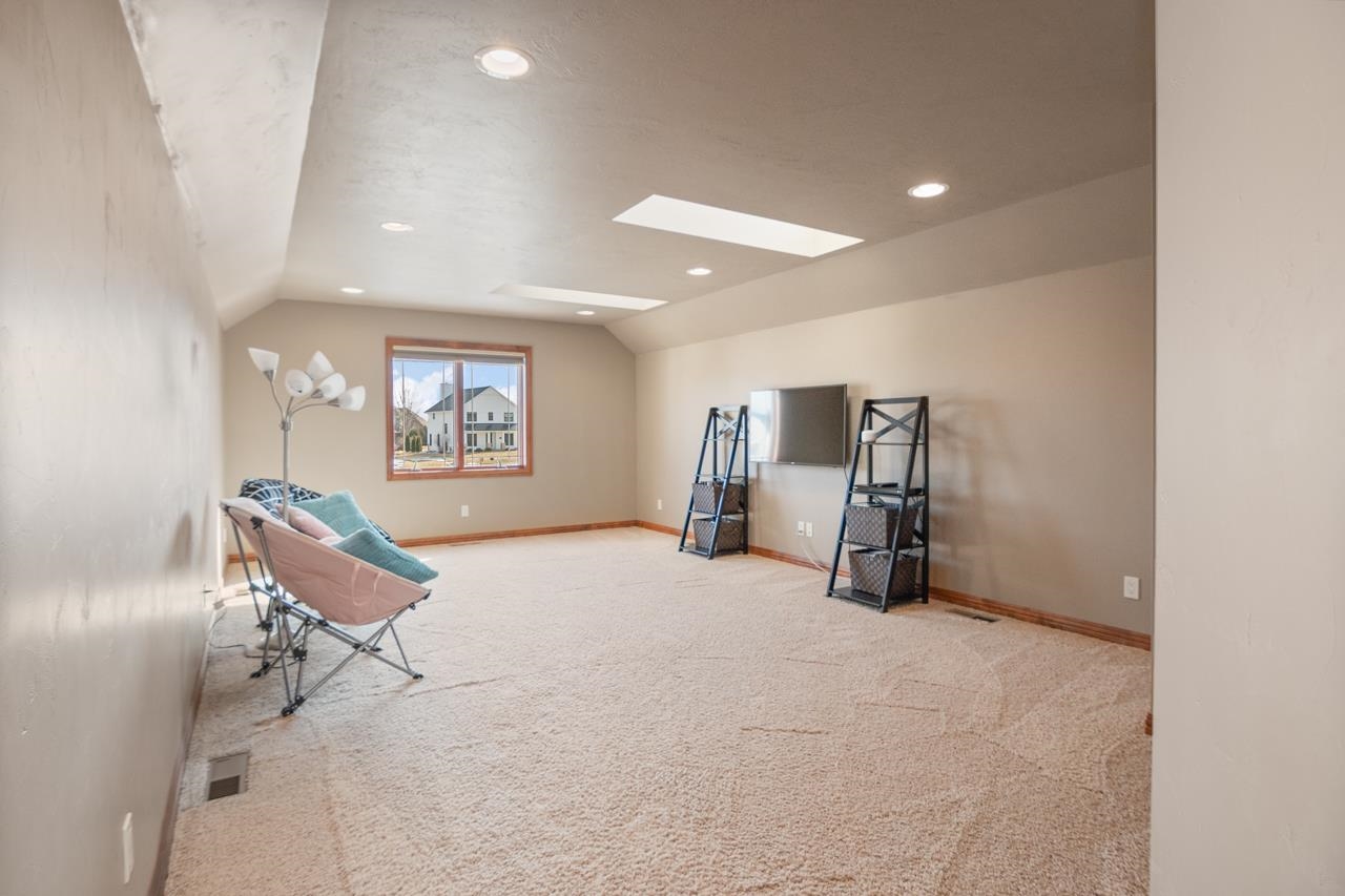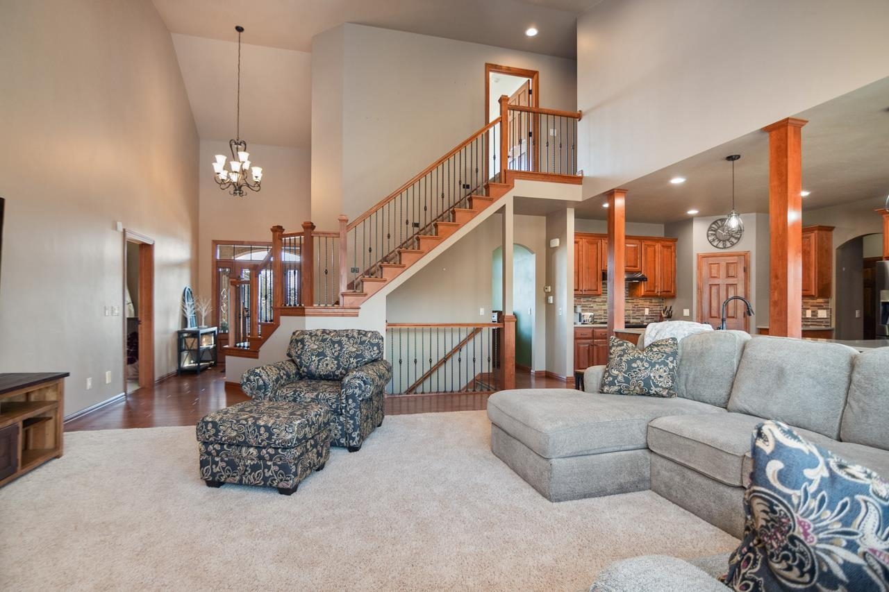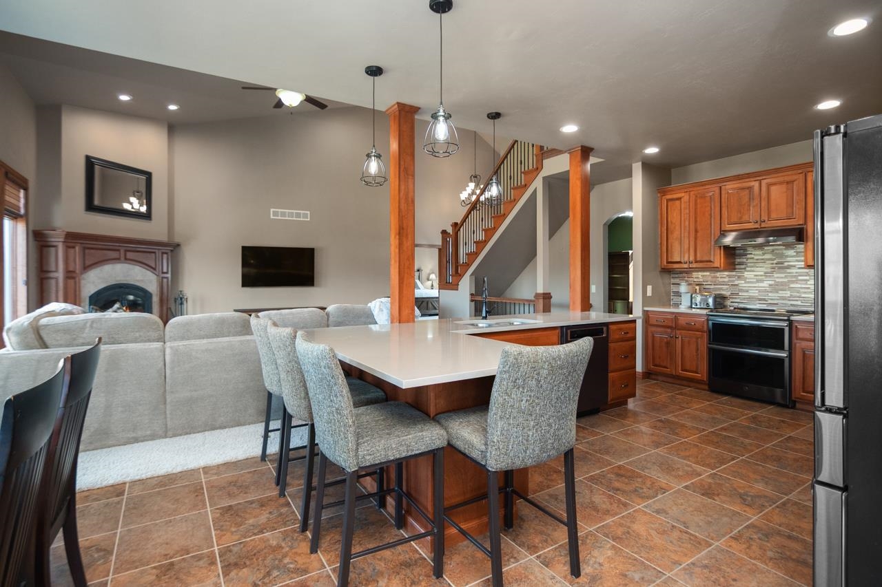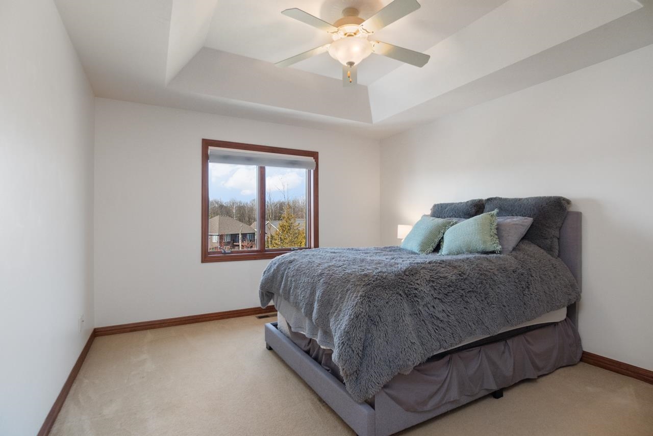 This home checks all the boxes! Quality built 4 bedroom home on a quiet cul-de-sac in desirable neighborhood. First floor primary suite with dual closets and spacious bathroom with tiled walk-in shower, jetted tub and dual vanities. Updated kitchen with newer cabinets, quartz countertop and backsplash. Great room with wood fireplace,Office/den with hw floors. First floor laundry. Built-in lockers. Two of the bedrooms upstairs have their own private full bathroom. Spacious bonus room with walk-in closet can be used for a bedroom or a rec room! Walkout lower level is perfect for entertaining. Theatre room, game room, full bath and wet bar! Covered porch overlooking in ground pool, hot tub, and storage shed. 3.5 stall garage with stairs to lower level.
