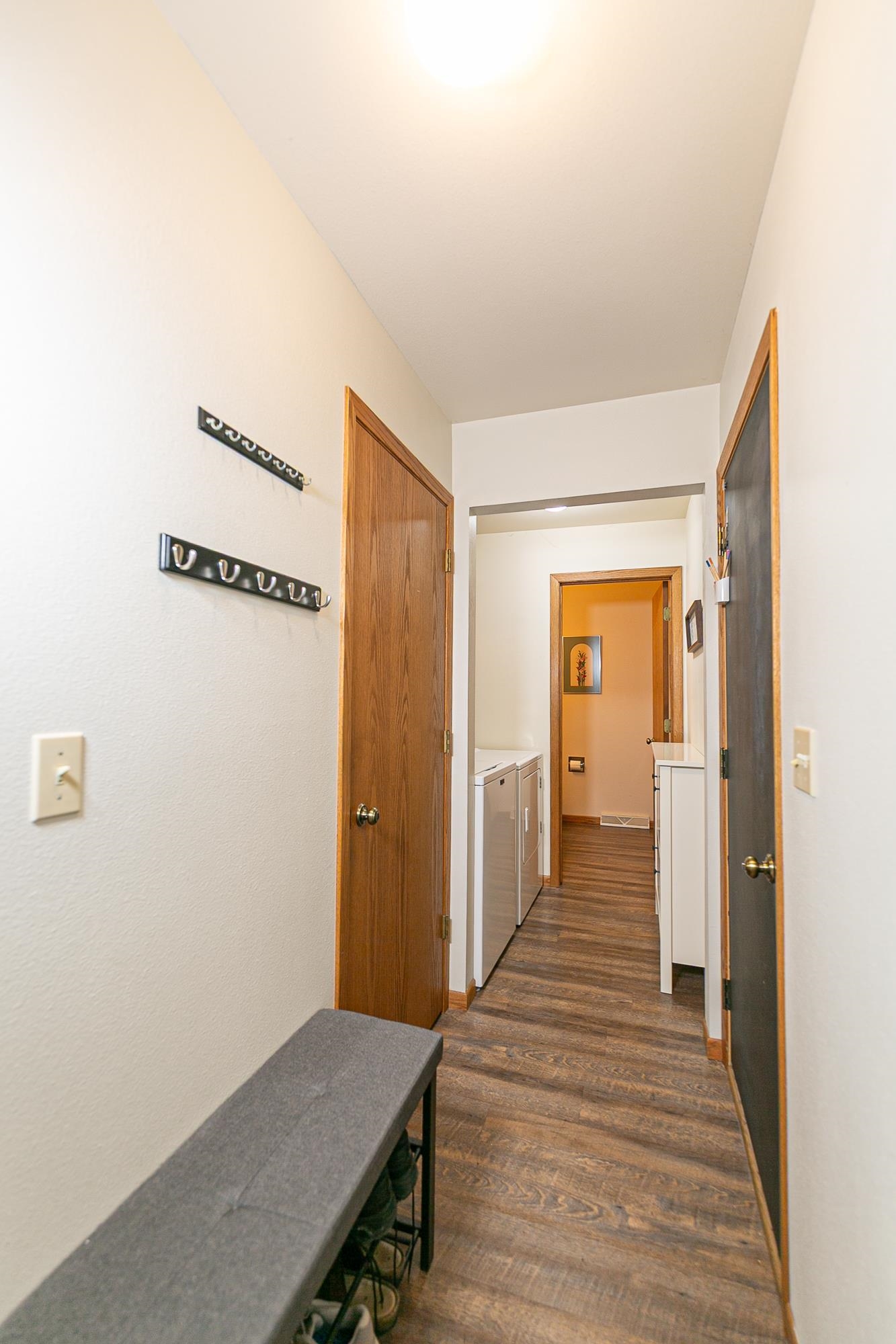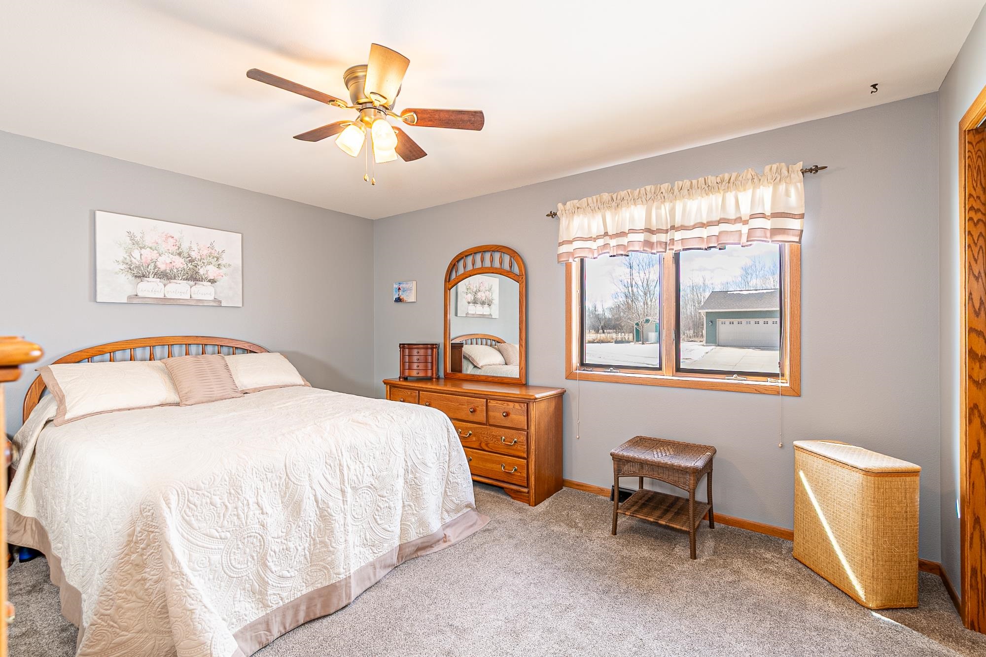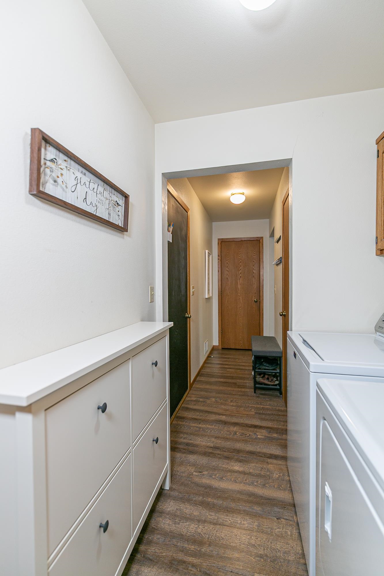 stove, refrigerator, dishwasher, microwave, washer, dryer, in LL: dehumidifier, work bench, wooden shelves; storage cabinet in garage, curtains in LR