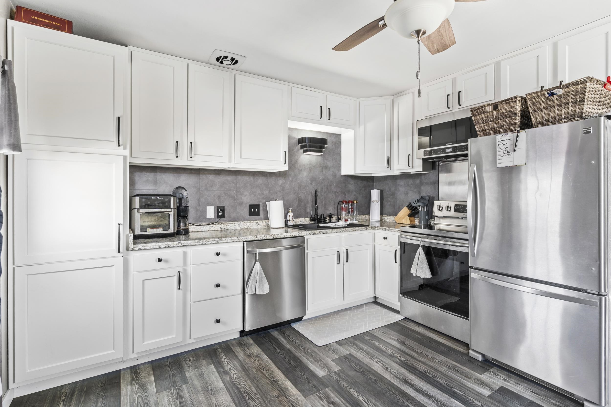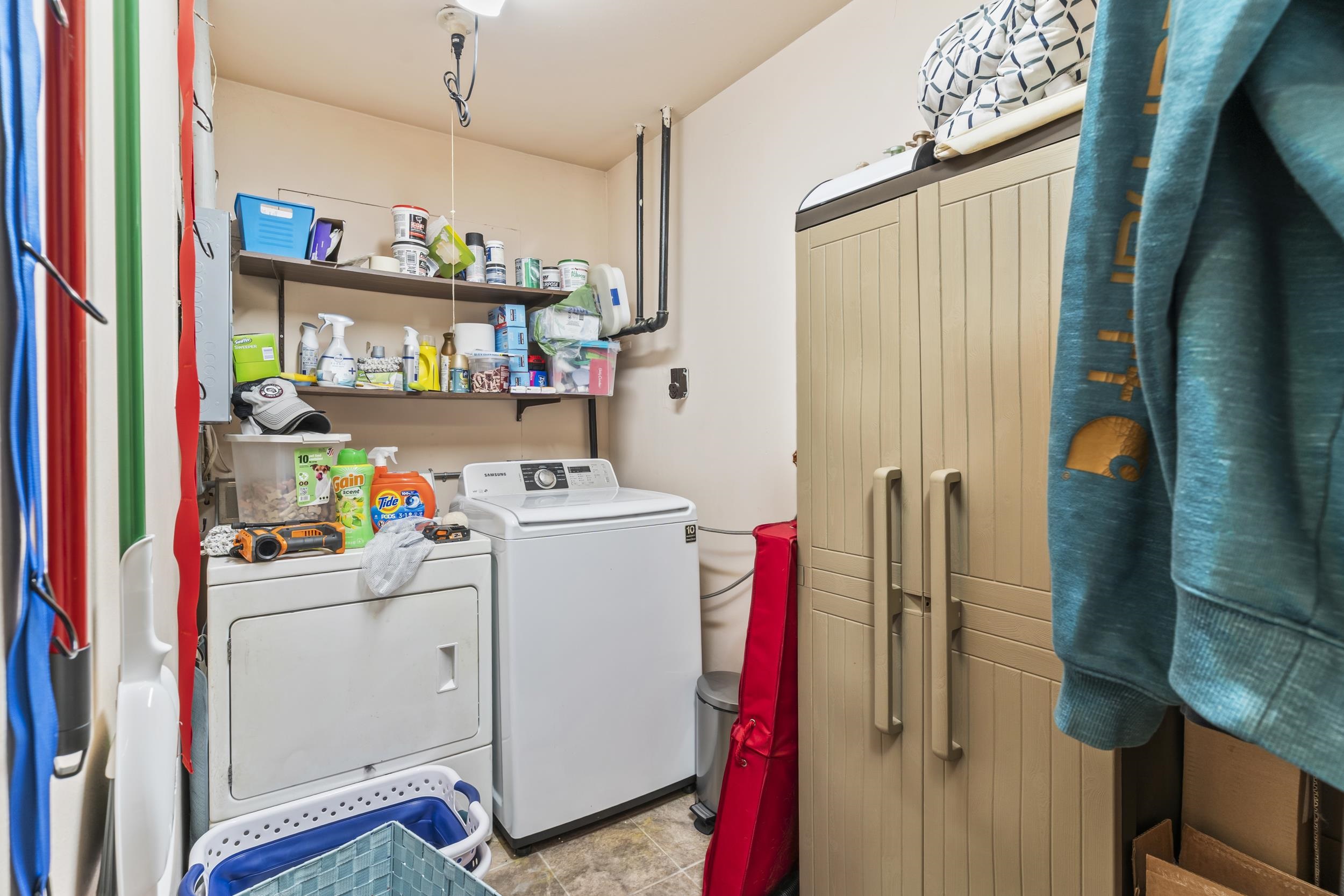 Refrigerator, stove, washer, dryer, shed, firewood, freezer in garage, garden planters