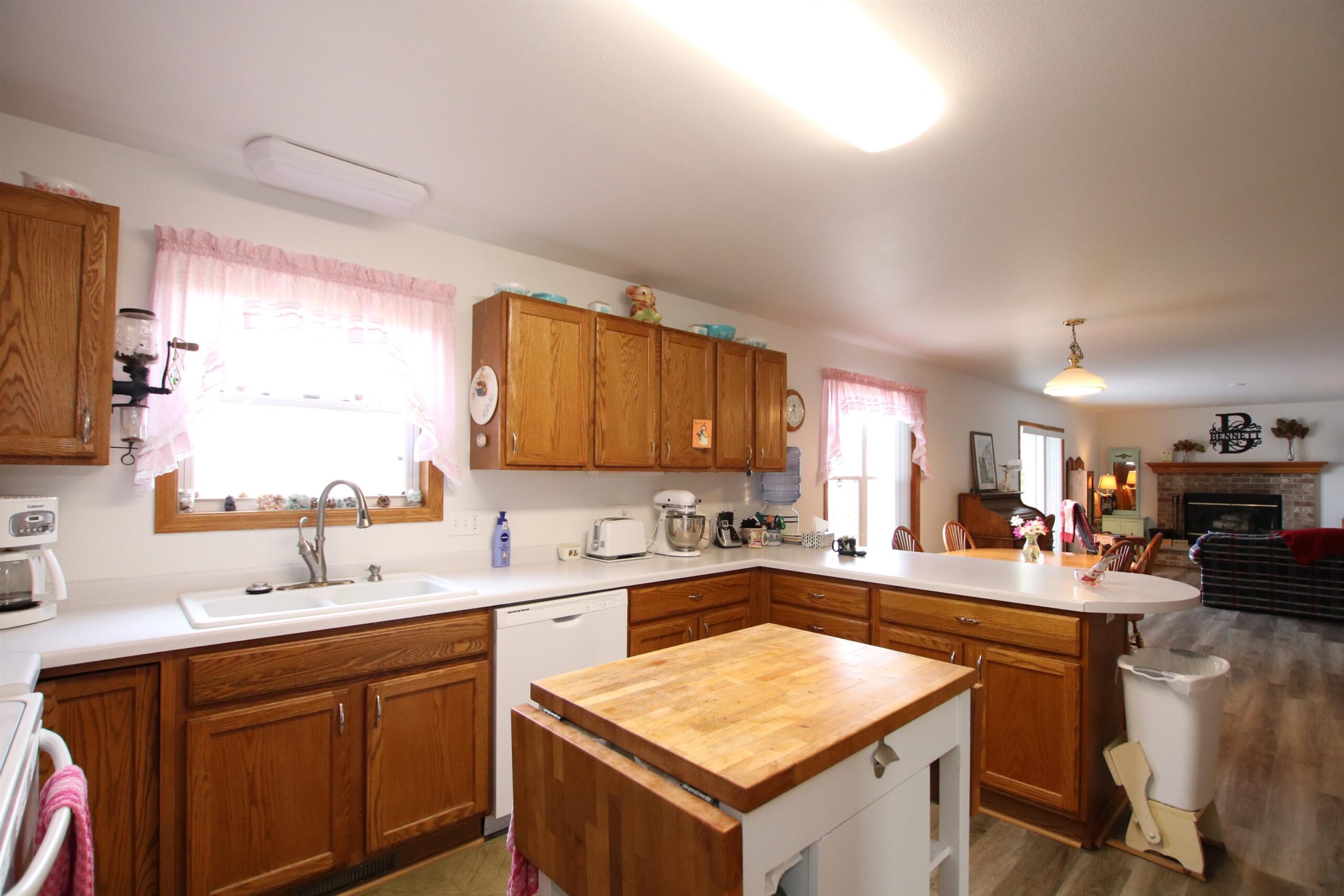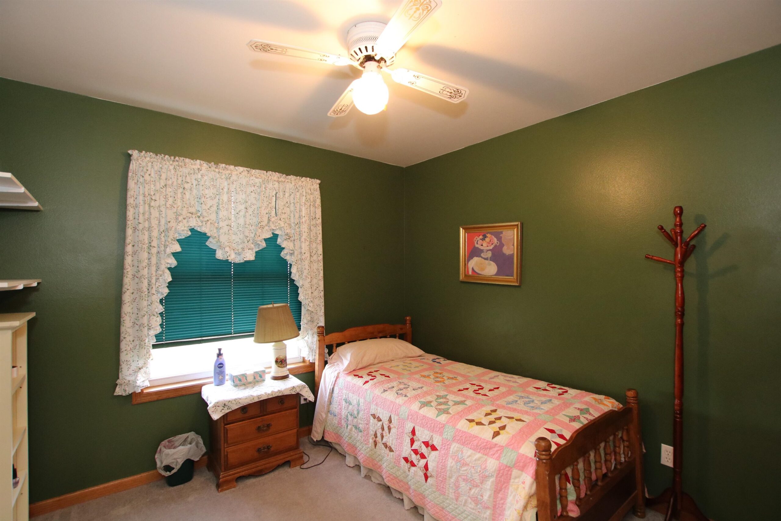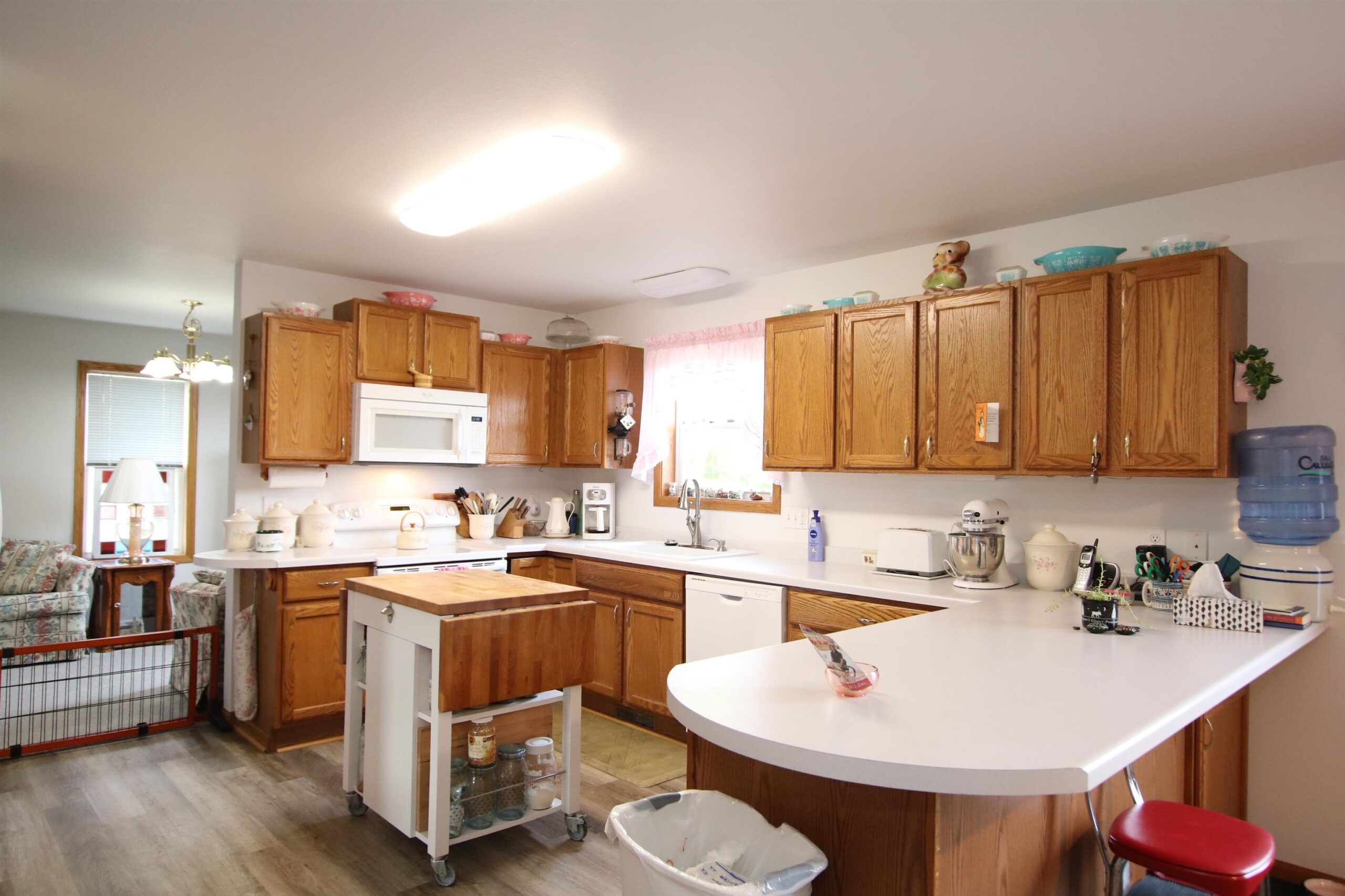 Stove, refrigerator (2), microwave, dishwasher, window treatments, shelving in garage.