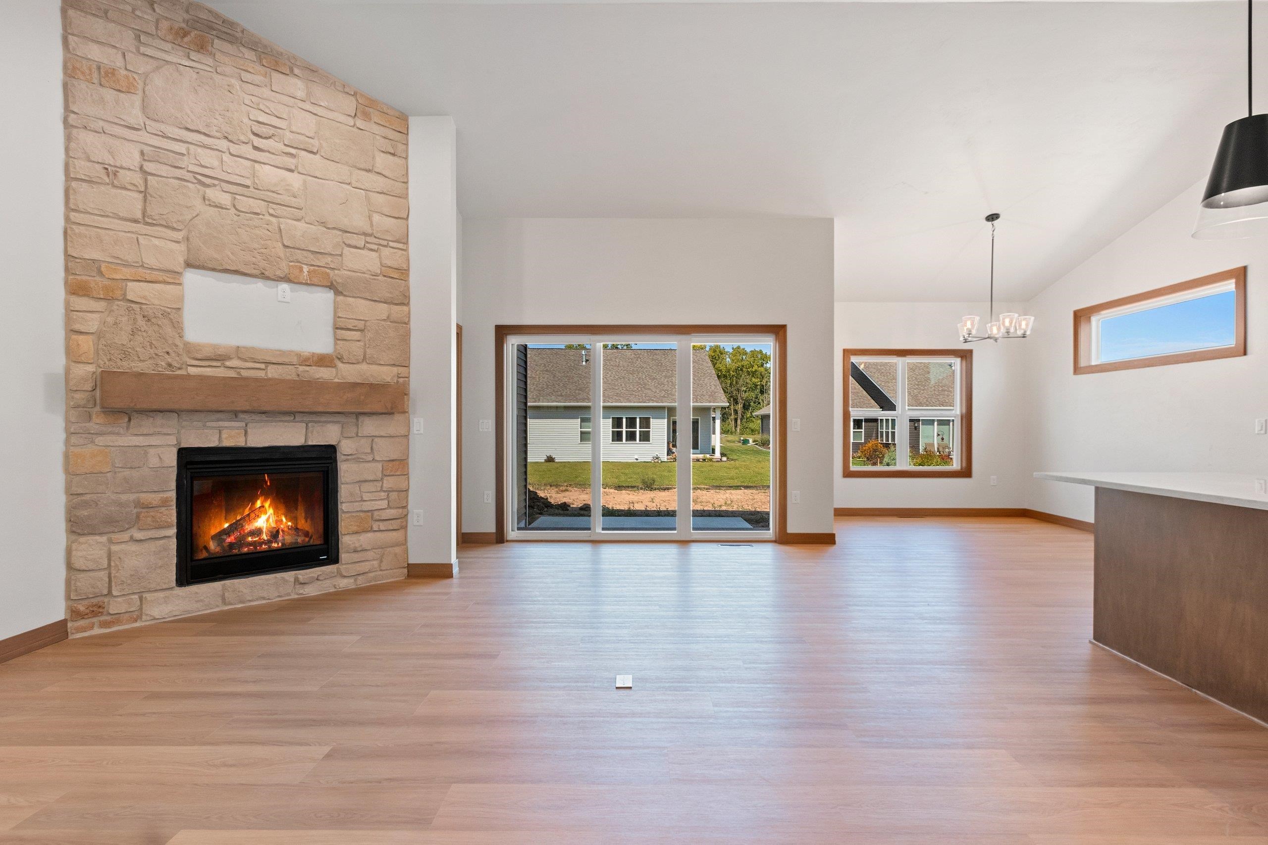Welcome to Hidden Creek HOA Community! This beautifully designed 2 bed, 2 bath new construction home features an open-concept layout. The spacious living room offers a cozy fireplace and cathedral ceilings, dinette, with a covered porch and outdoor patio. Enjoy a zero-entry design for convenience and accessibility. The kitchen boasts a large island, walk in pantry and modern finishes. The luxurious master suite includes a tray ceiling, generous walk in closet and a custom tiled shower for a spa-like feel. Additional highlights include first floor laundry & an unfinished lower level with egress window ready for your personal touch. As part of the Hidden Creek HOA enjoy access to amenities including a clubhouse, swimming pool, exercise area, lawn care & snow removal for hassle free living!