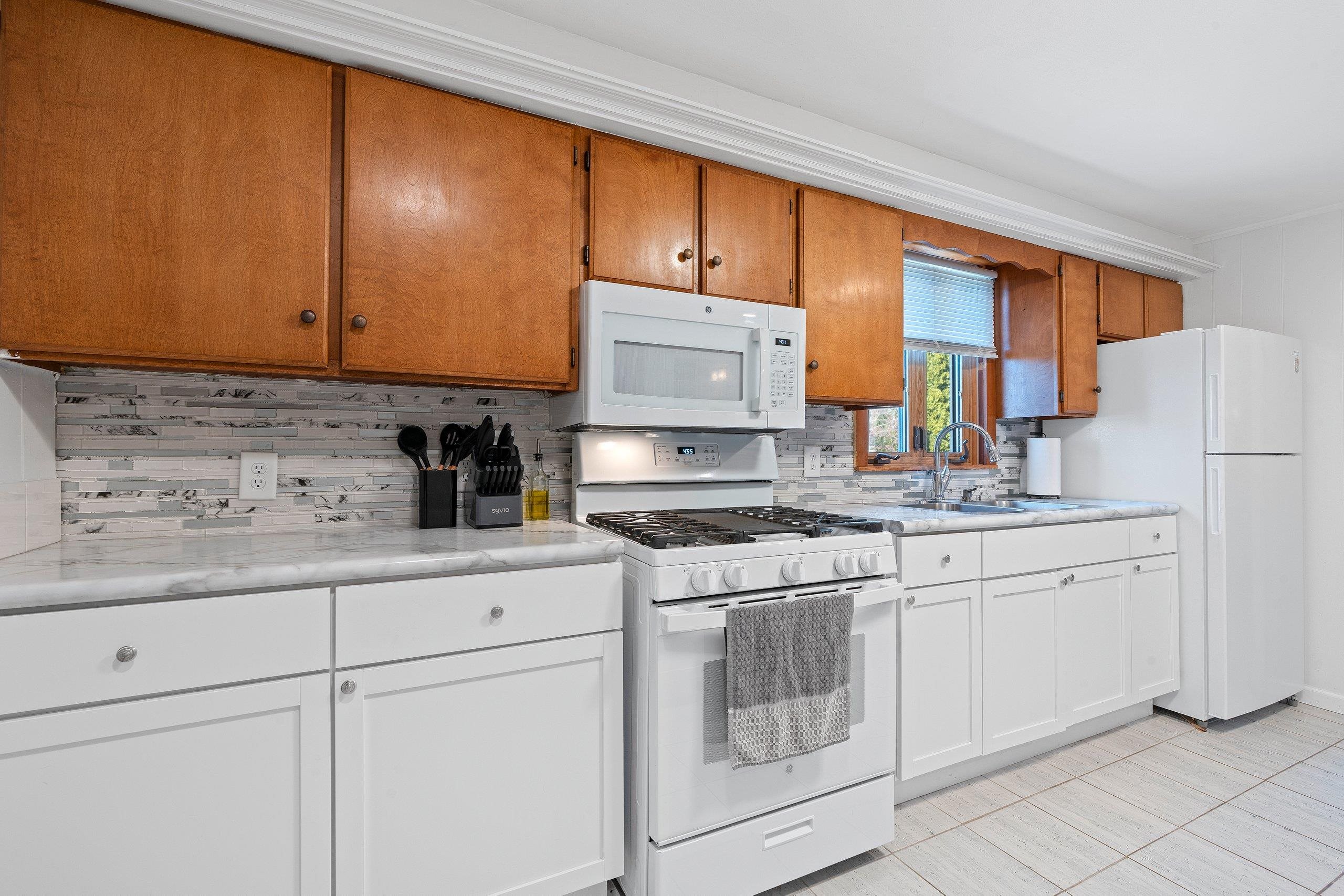 Stove, Refrigerator, Microwave, Washer, Dryer, Dehumidifier in Basement