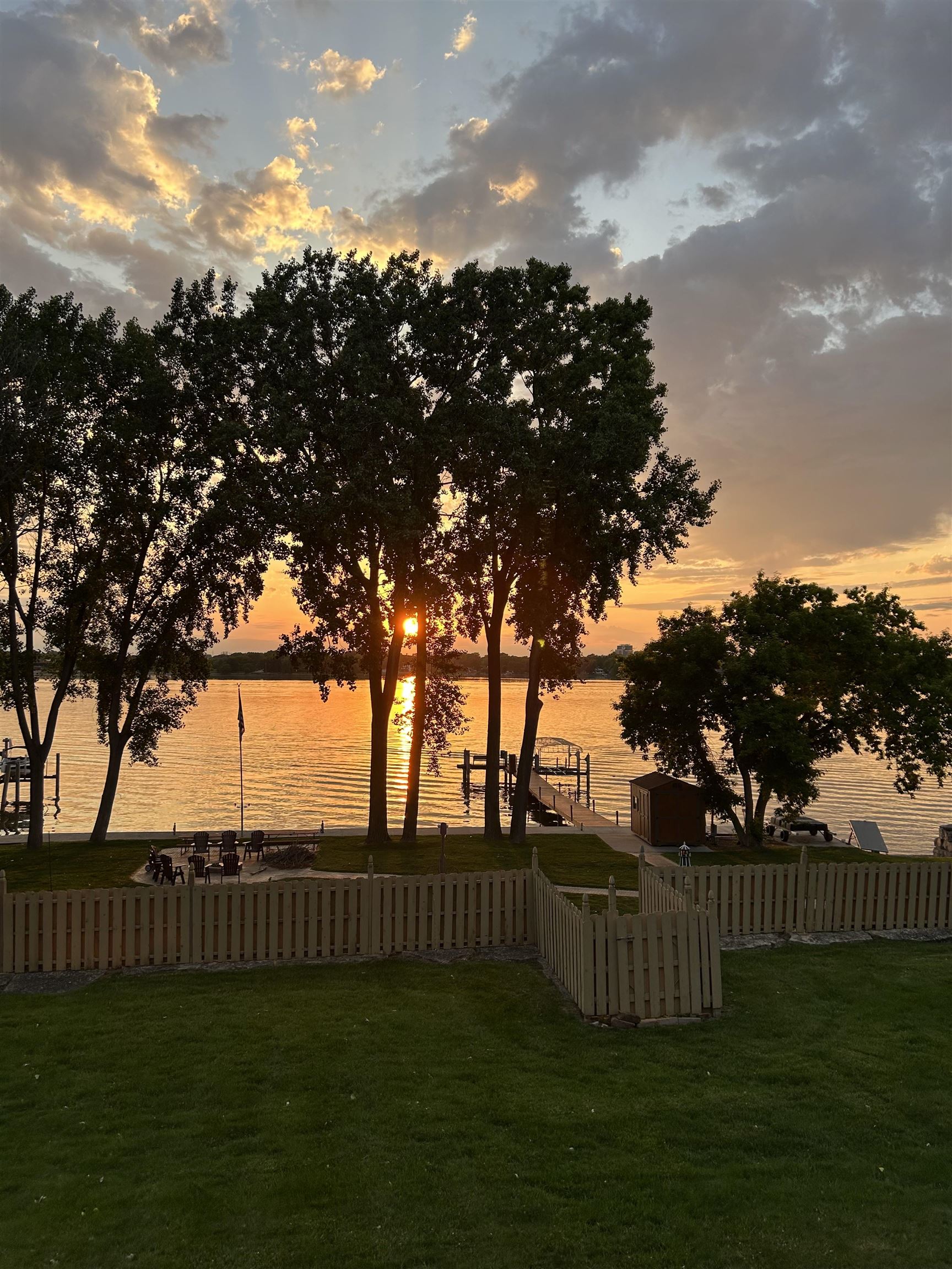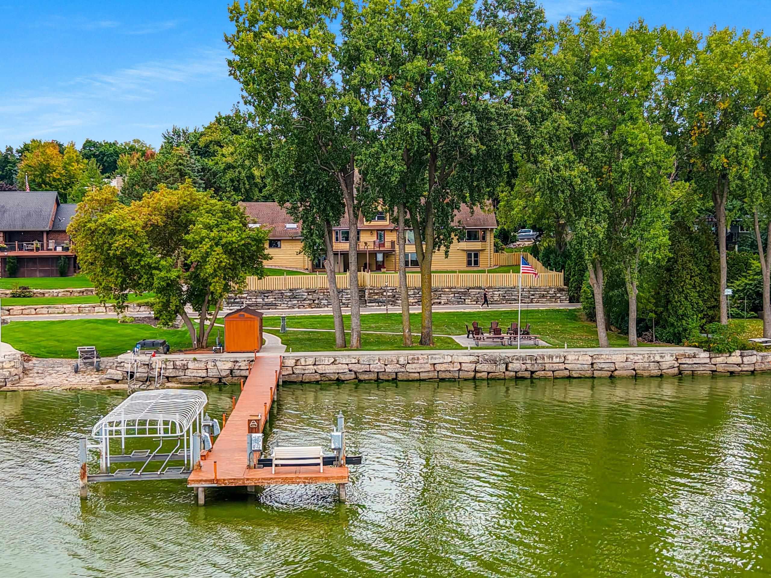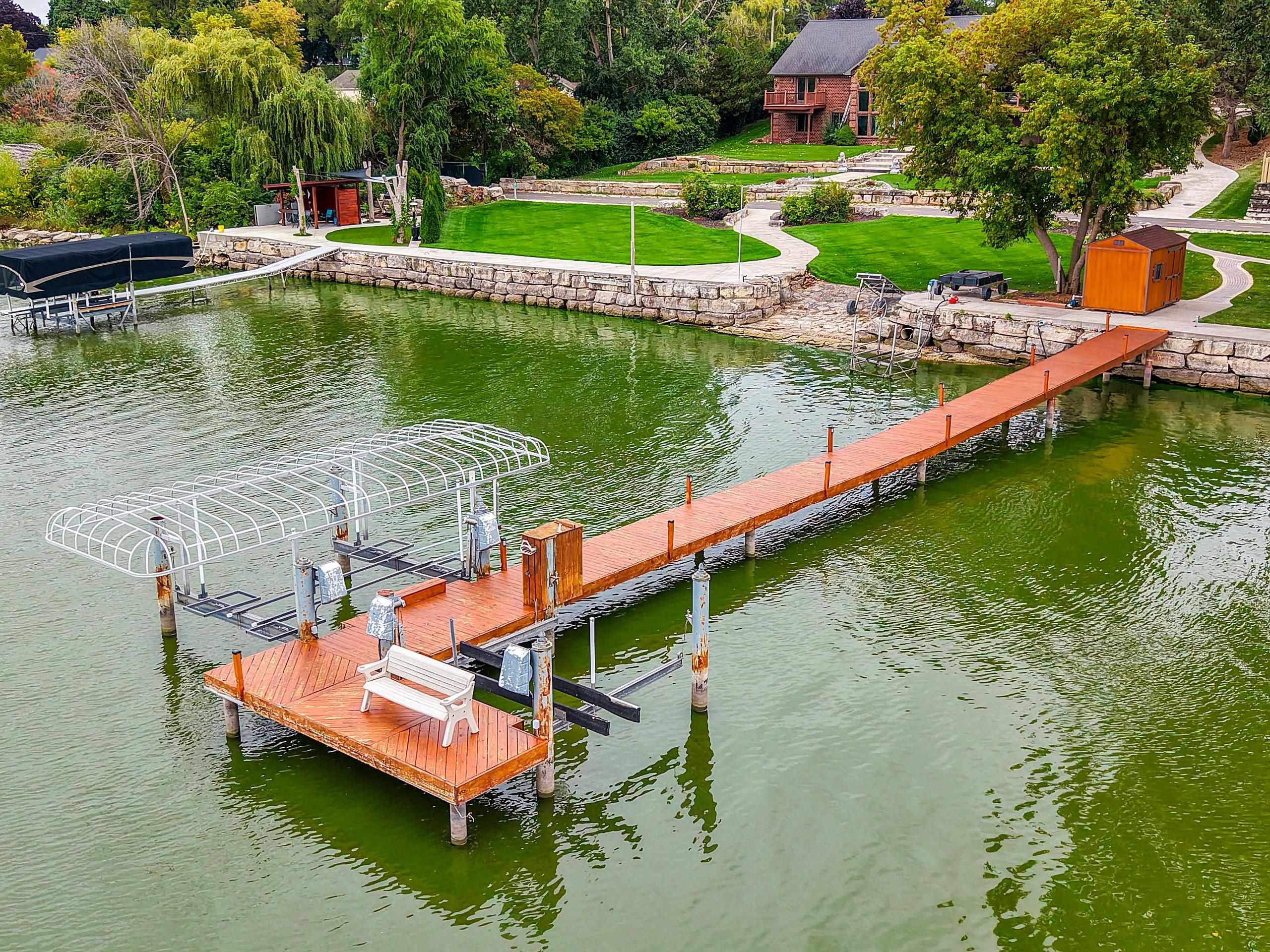Inground sprinkler system, privacy fence around portion of backyard, 3 exterior storage containers, 1 large shed by dock
